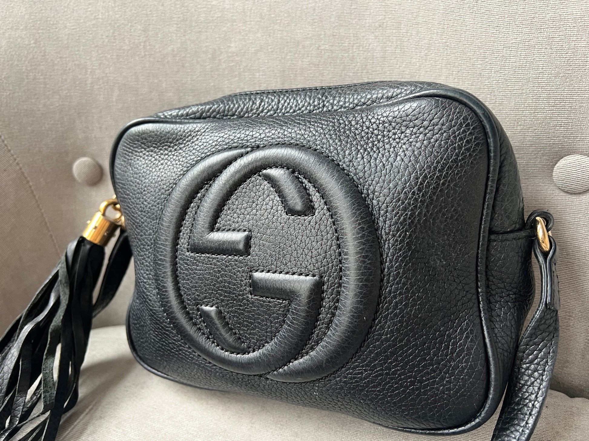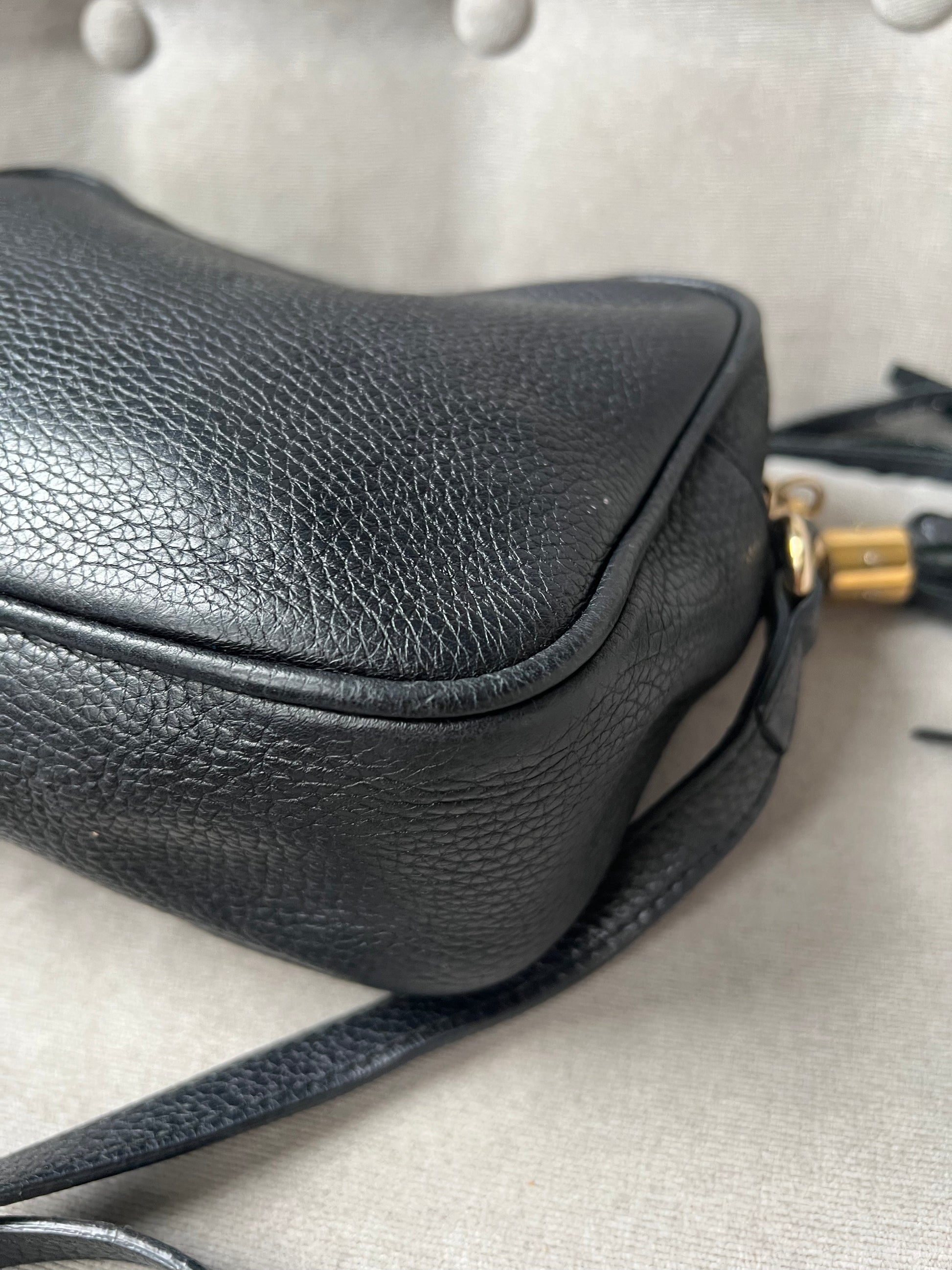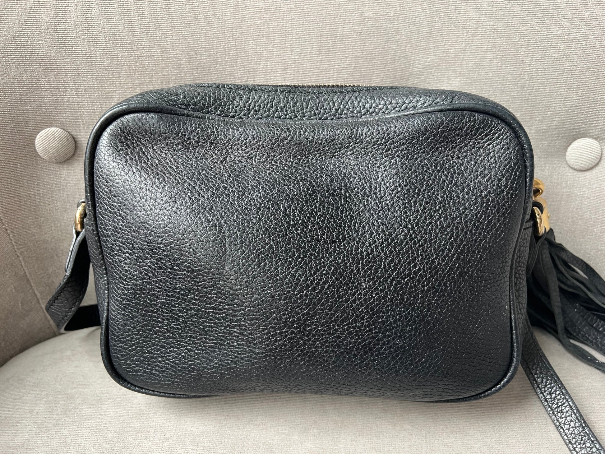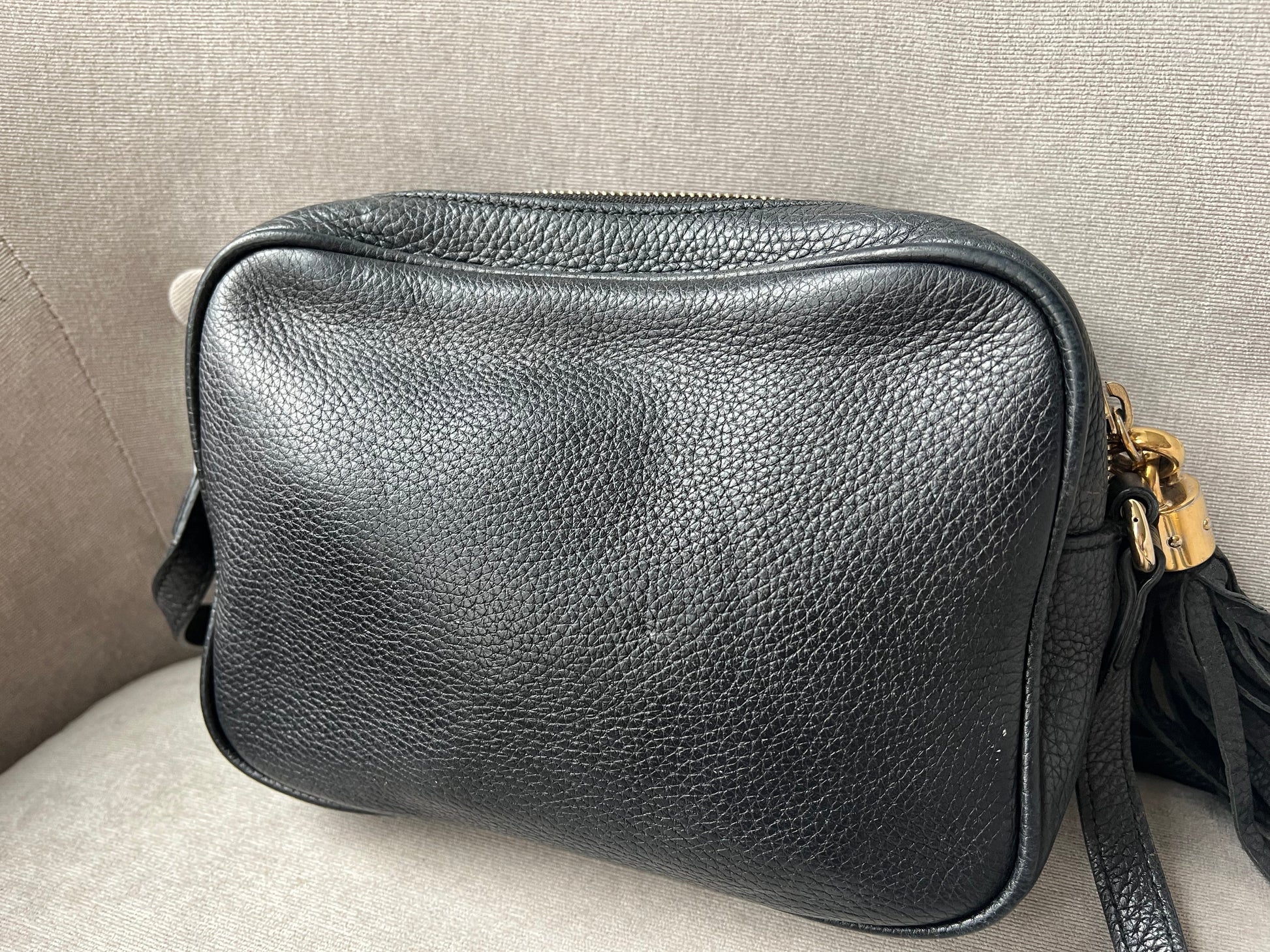 Gucci Soho Disco in Black Leather with pale gold hardware. This practical, cross body, camera style bag is compact in size but still fits a reasonable amount. Can be over shoulder or cross body. Gucci's most popular style and goes with any outfit, dressed up or down.