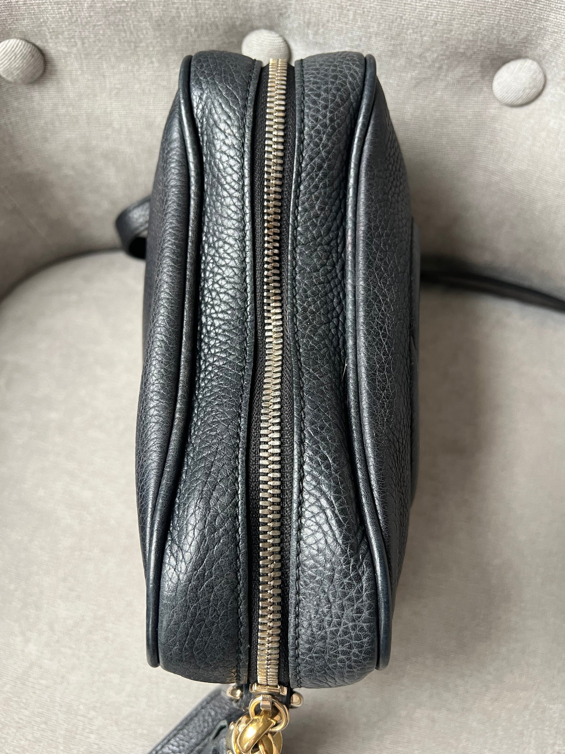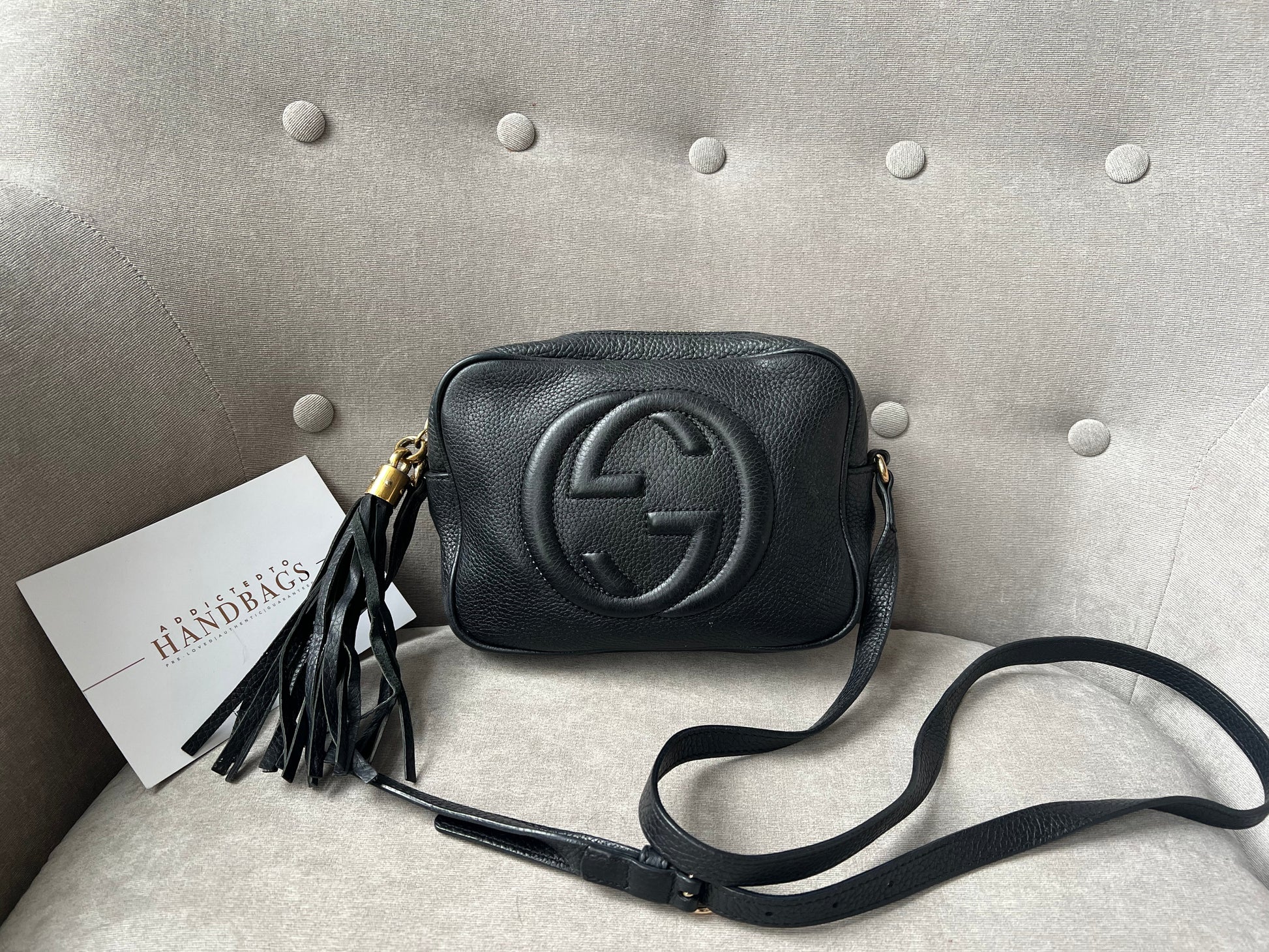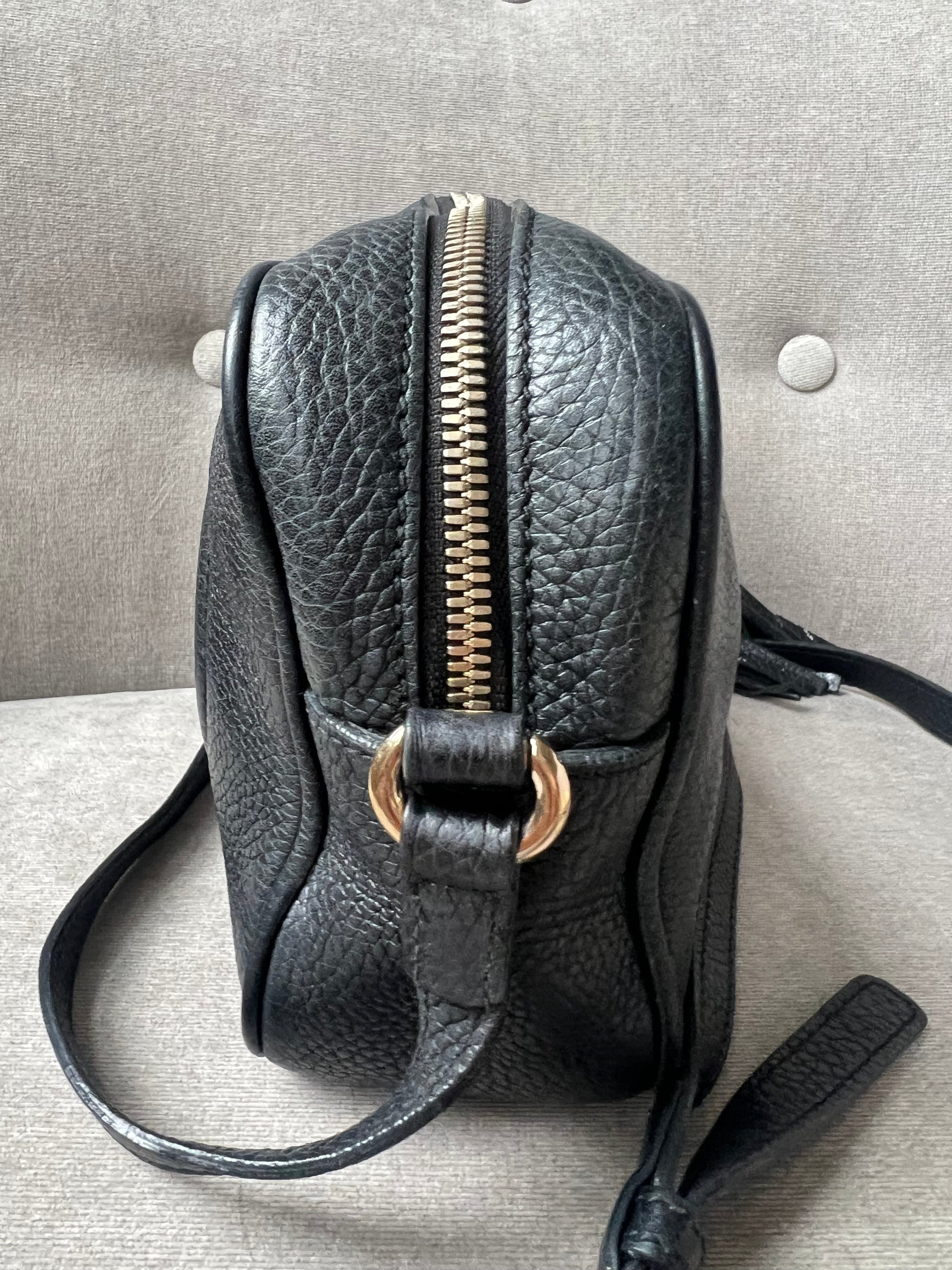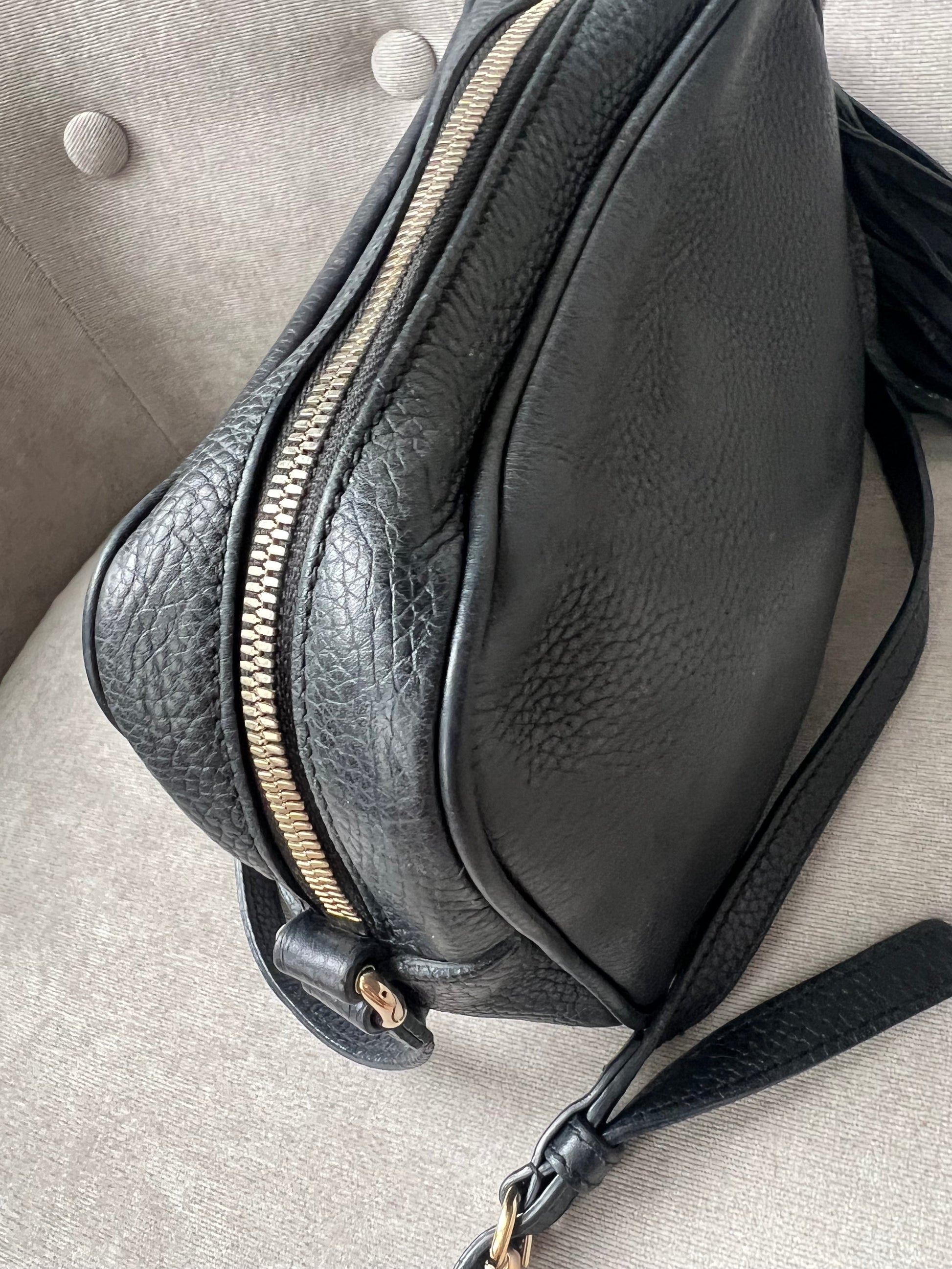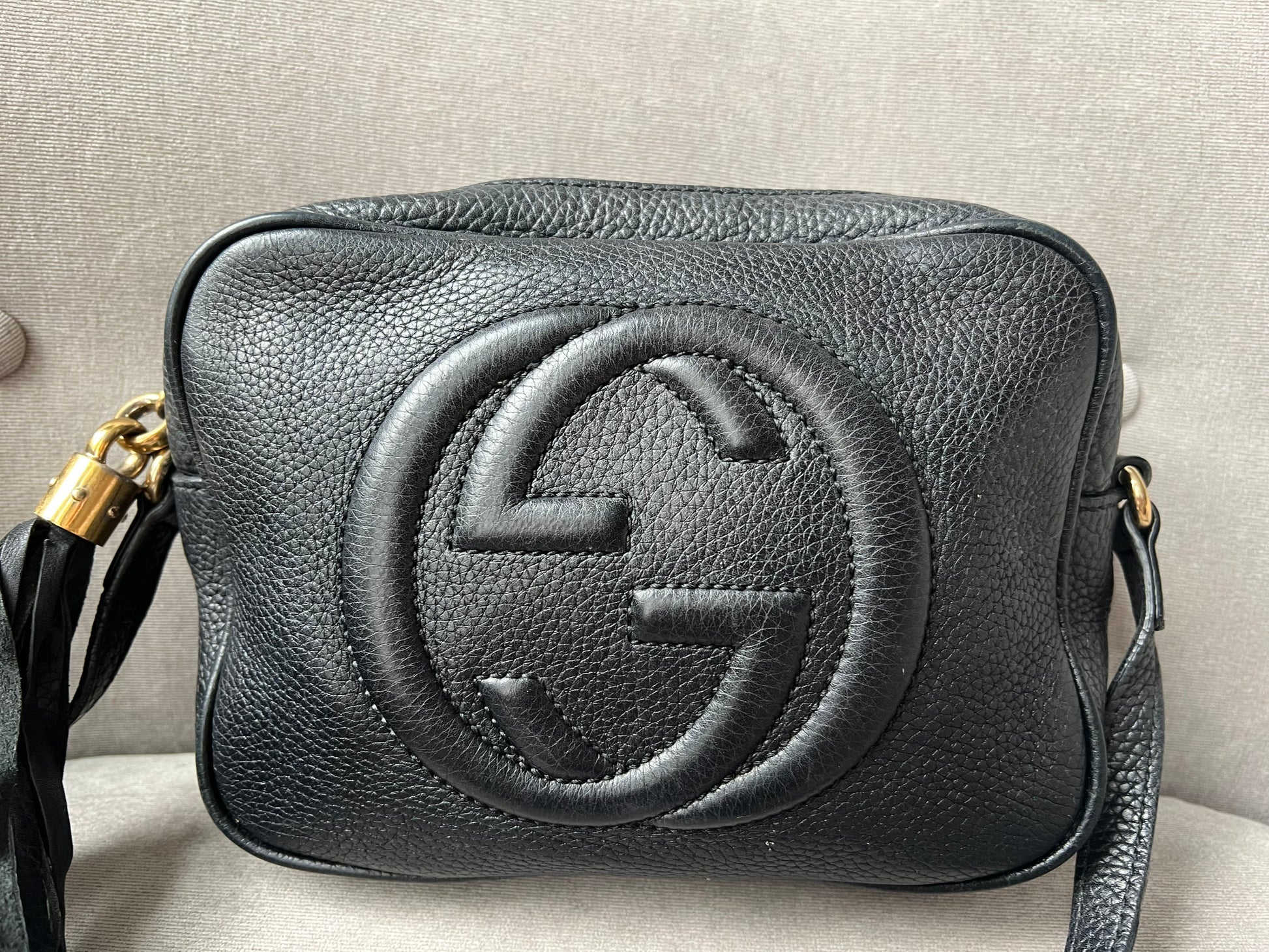 Gucci Soho Disco in Black Leather with pale gold hardware. This practical, cross body, camera style bag is compact in size but still fits a reasonable amount. Can be over shoulder or cross body. Gucci's most popular style and goes with any outfit, dressed up or down.