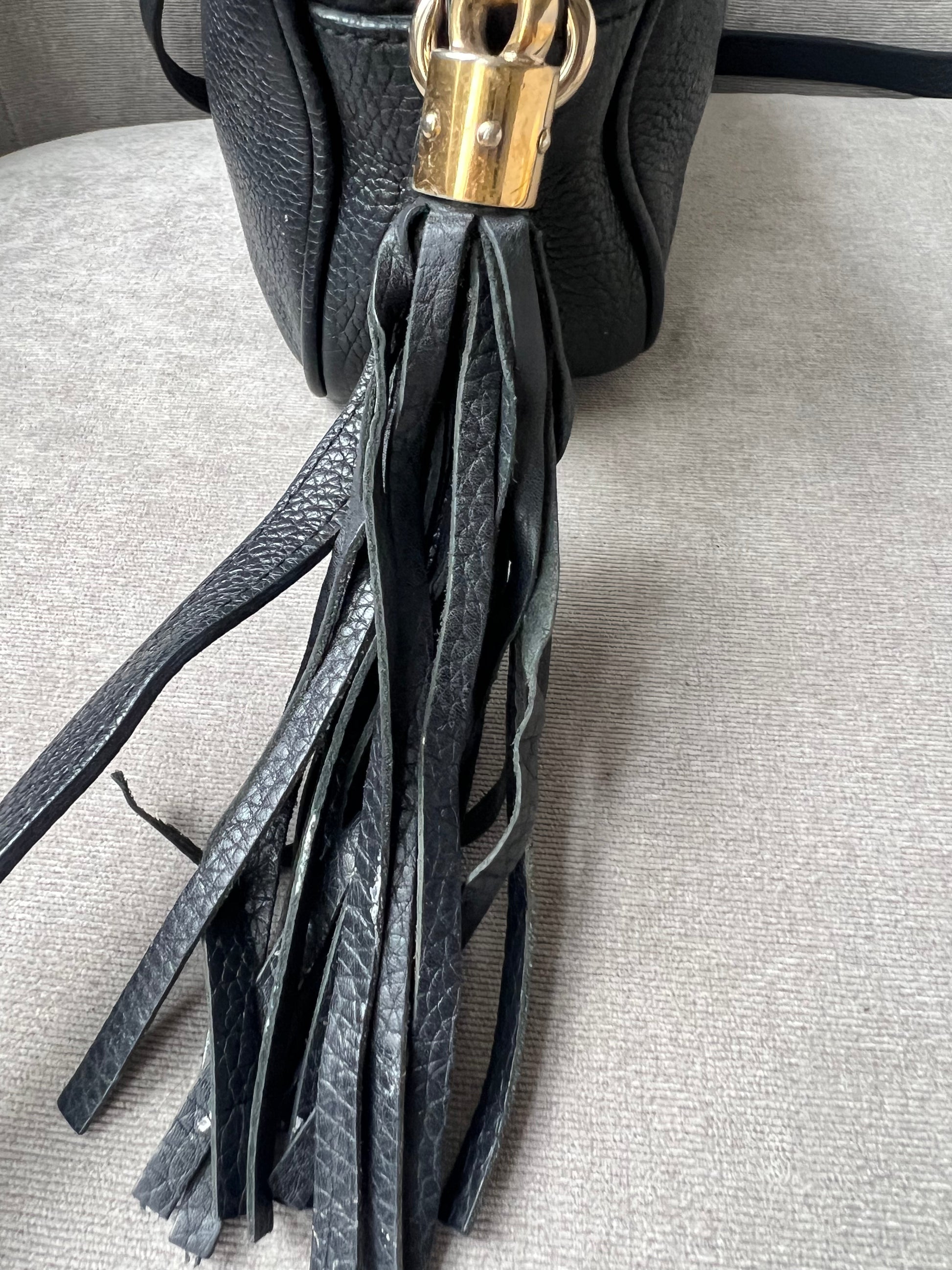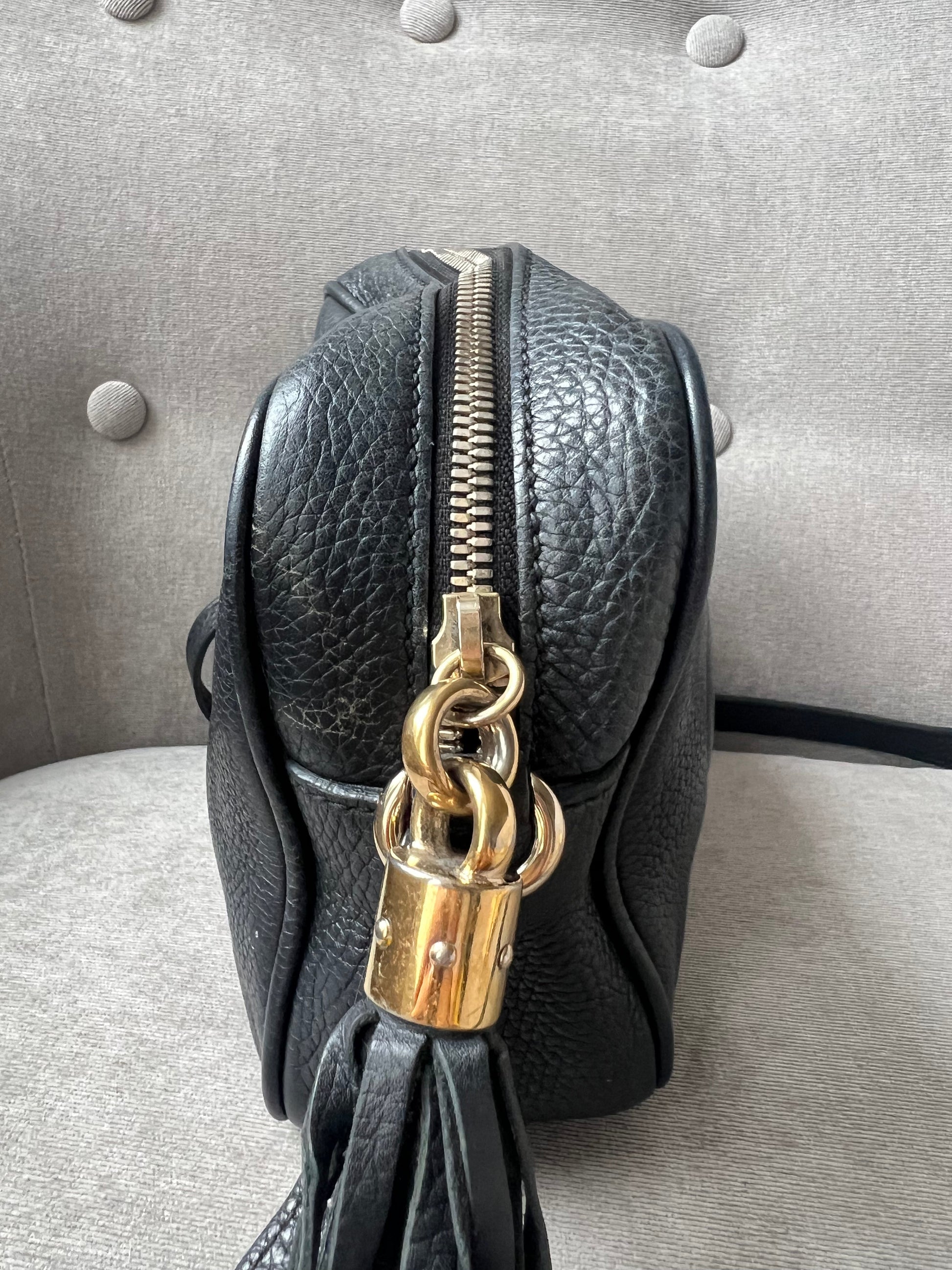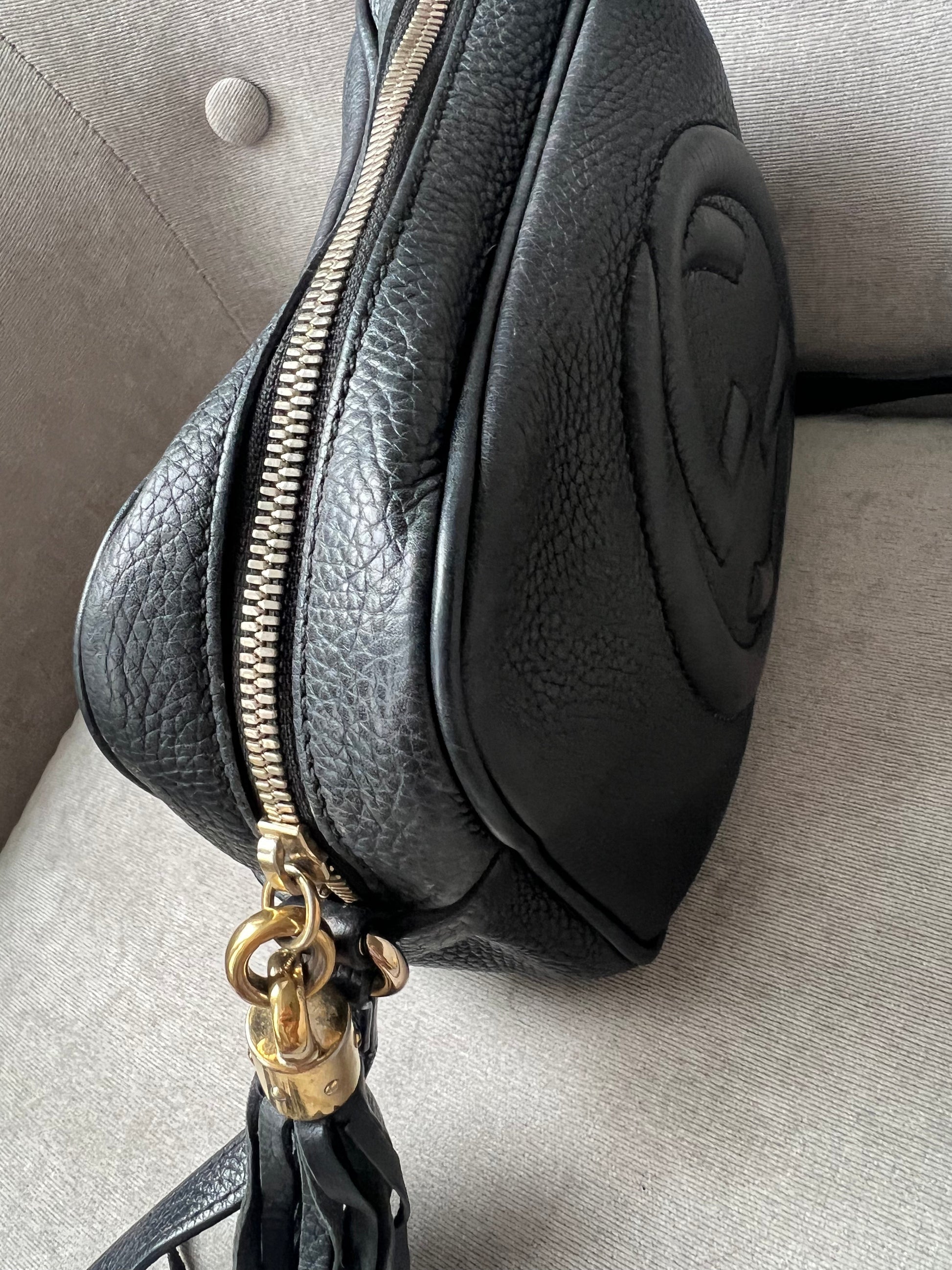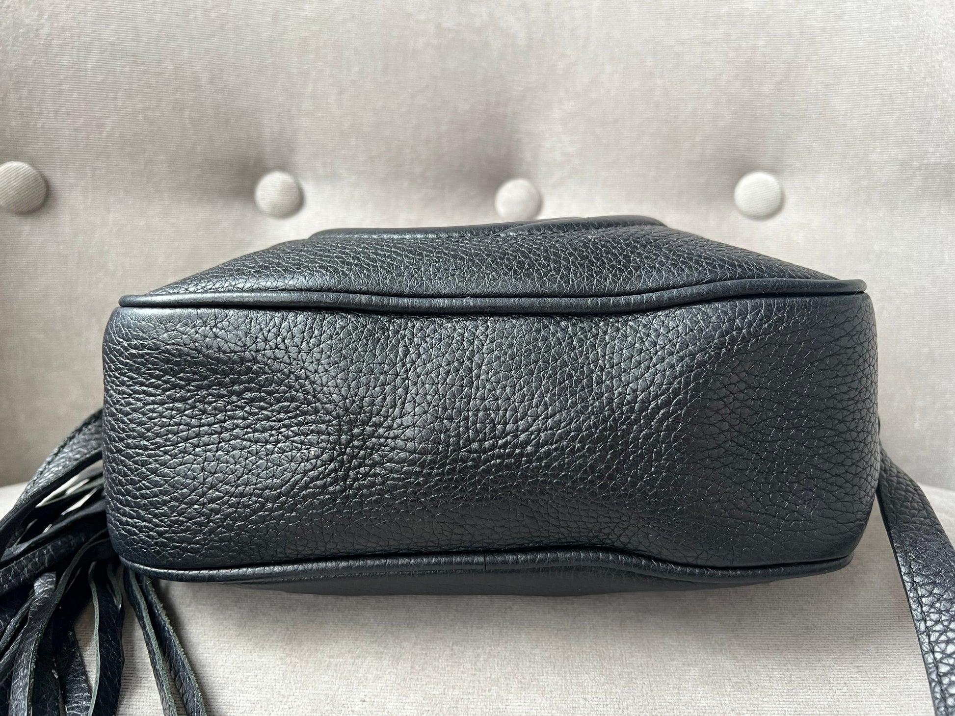 Gucci Soho Disco in Black Leather with pale gold hardware. This practical, cross body, camera style bag is compact in size but still fits a reasonable amount. Can be over shoulder or cross body. Gucci's most popular style and goes with any outfit, dressed up or down.