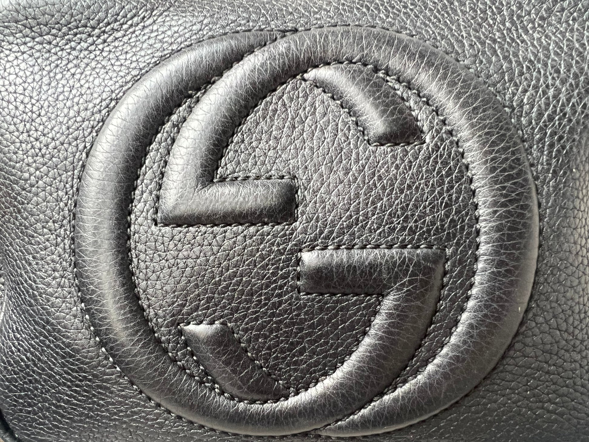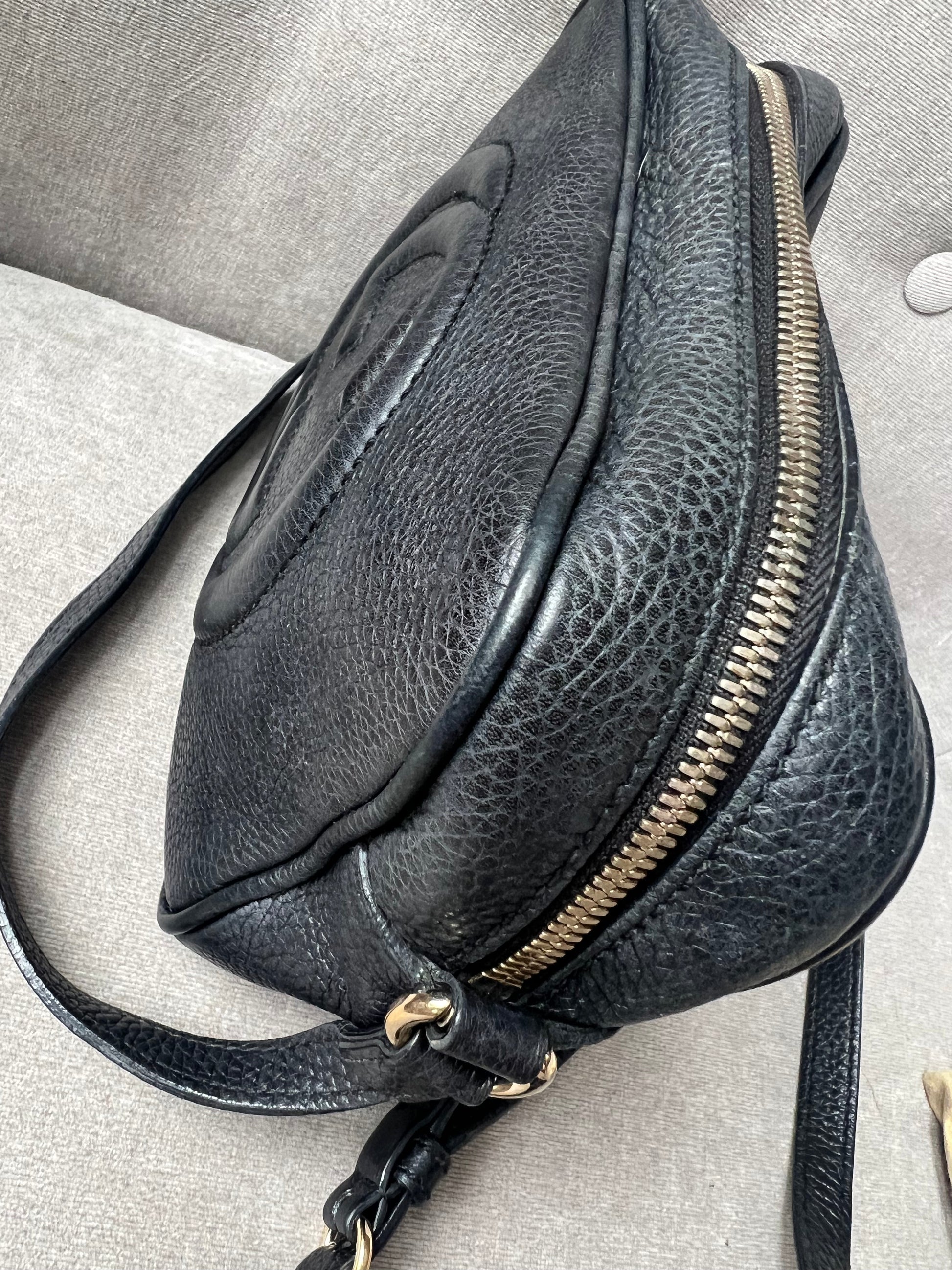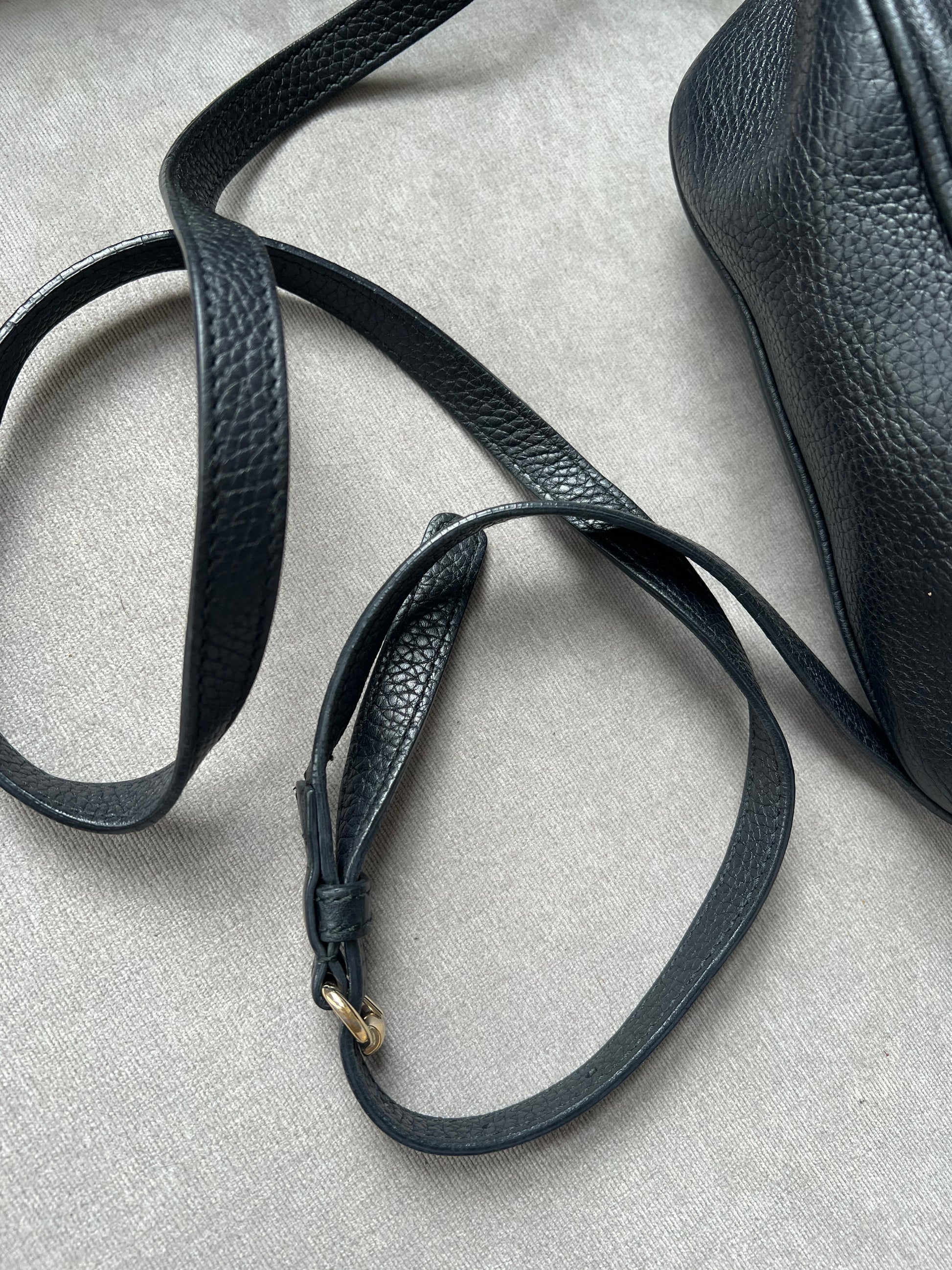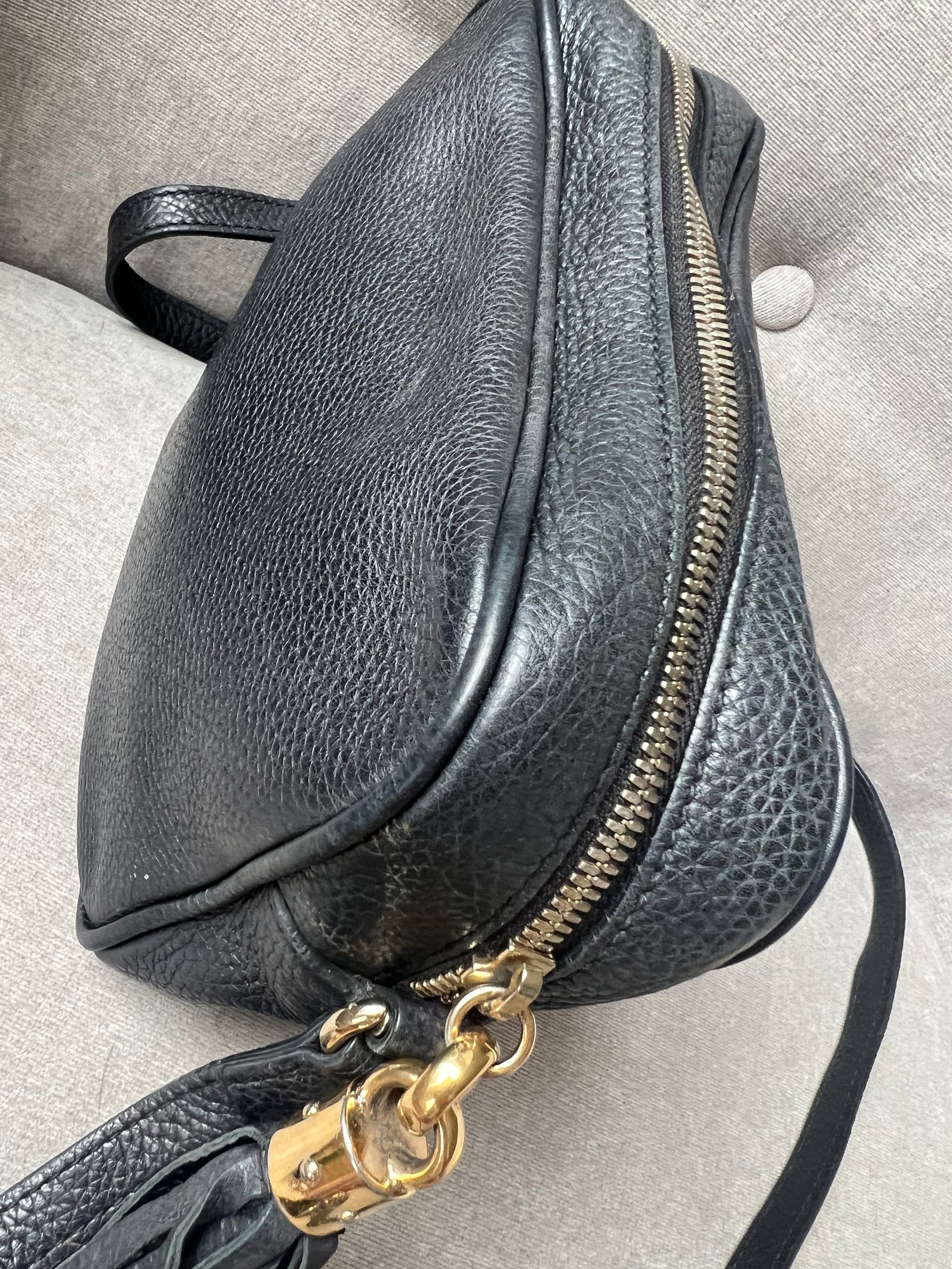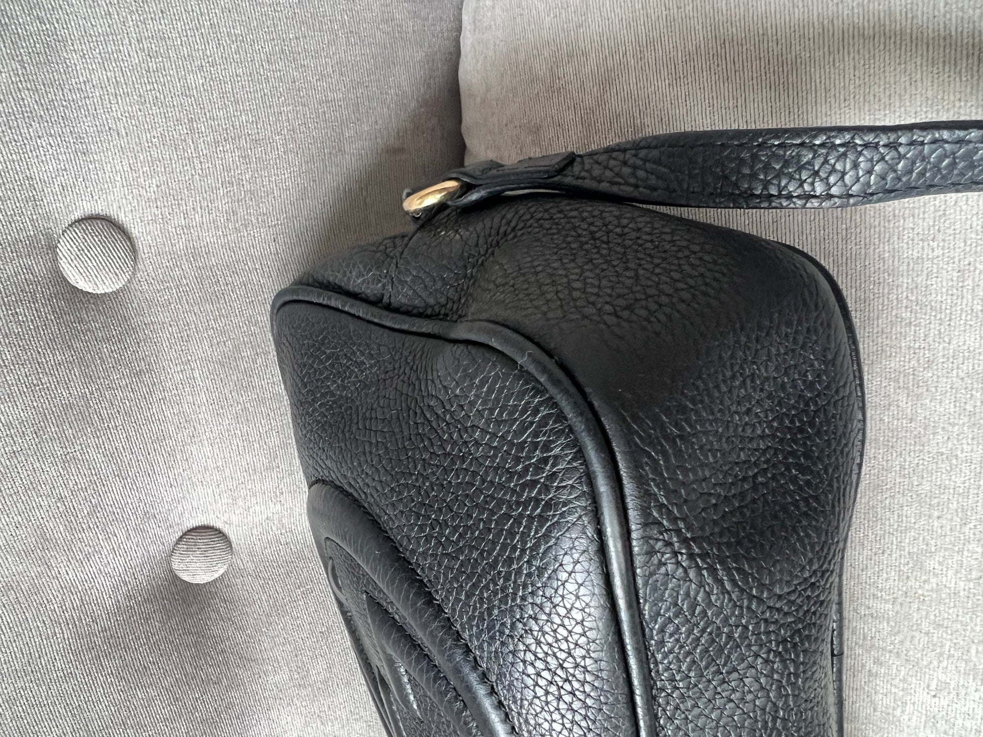 Gucci Soho Disco in Black Leather with pale gold hardware. This practical, cross body, camera style bag is compact in size but still fits a reasonable amount. Can be over shoulder or cross body. Gucci's most popular style and goes with any outfit, dressed up or down.
