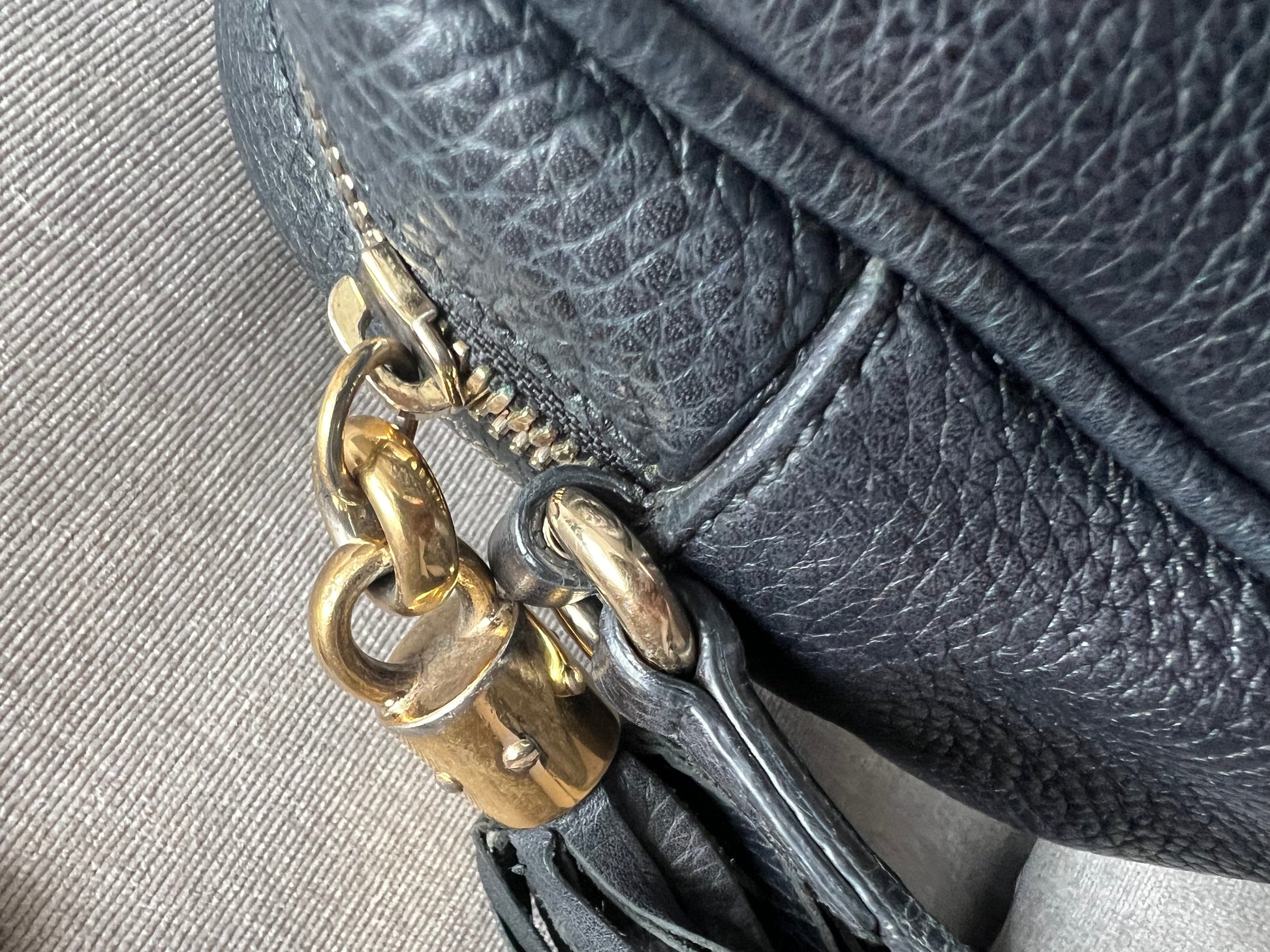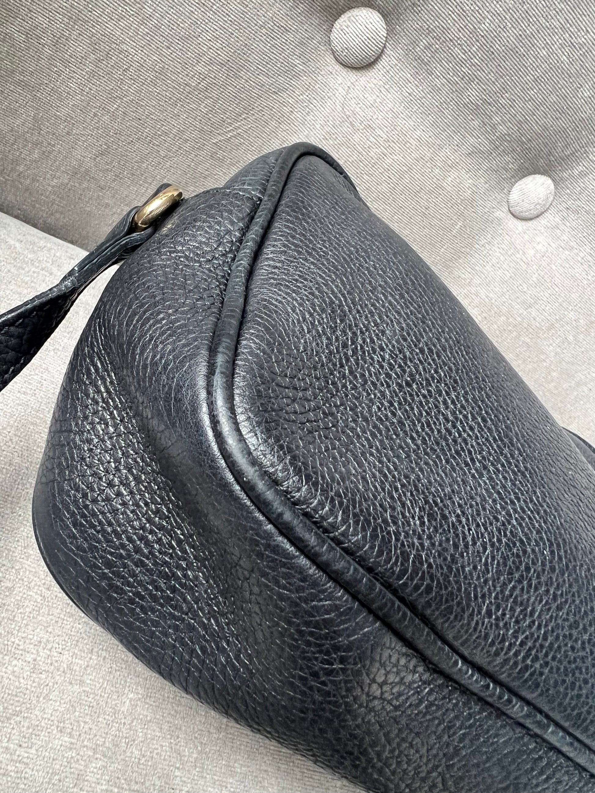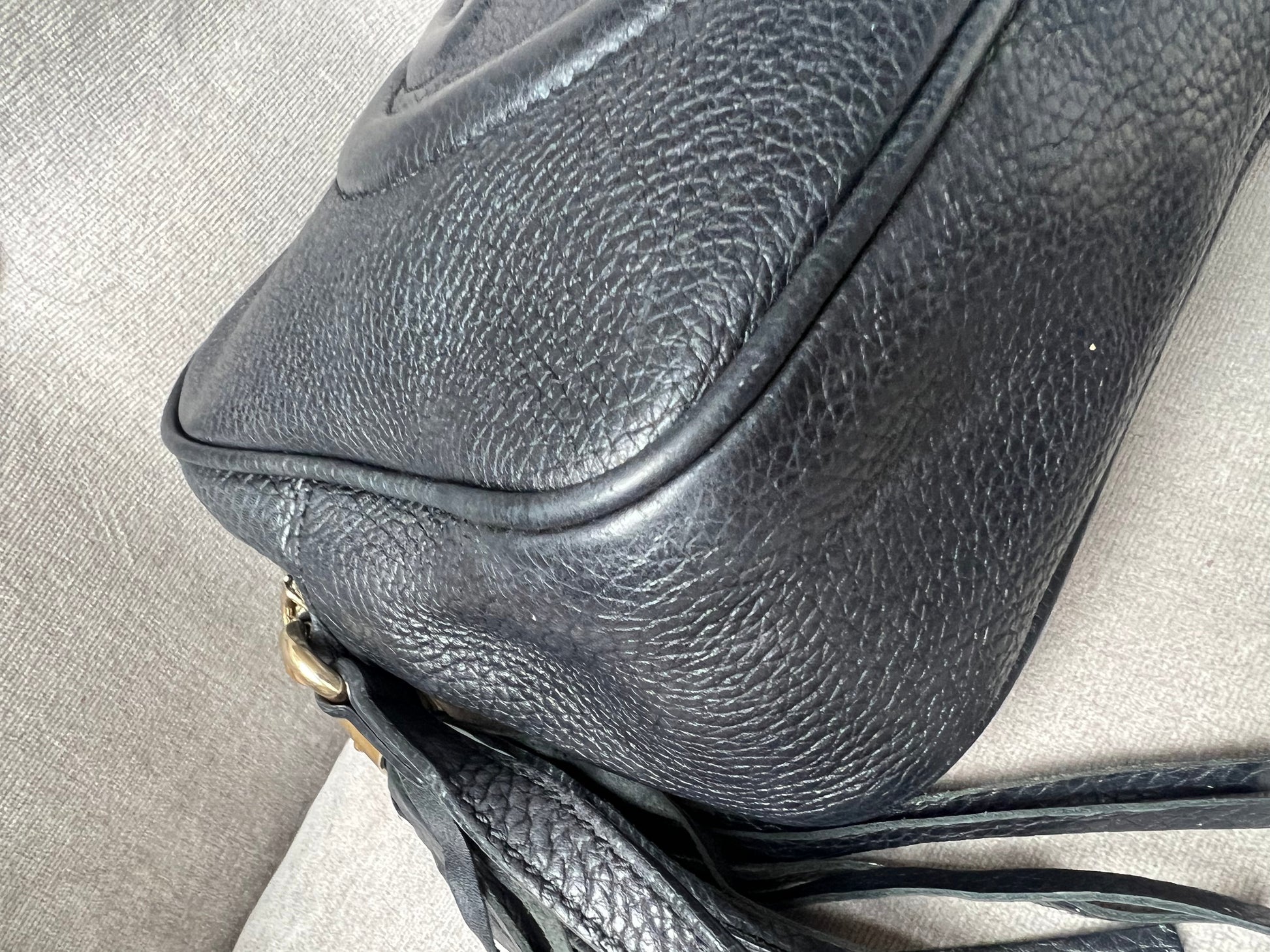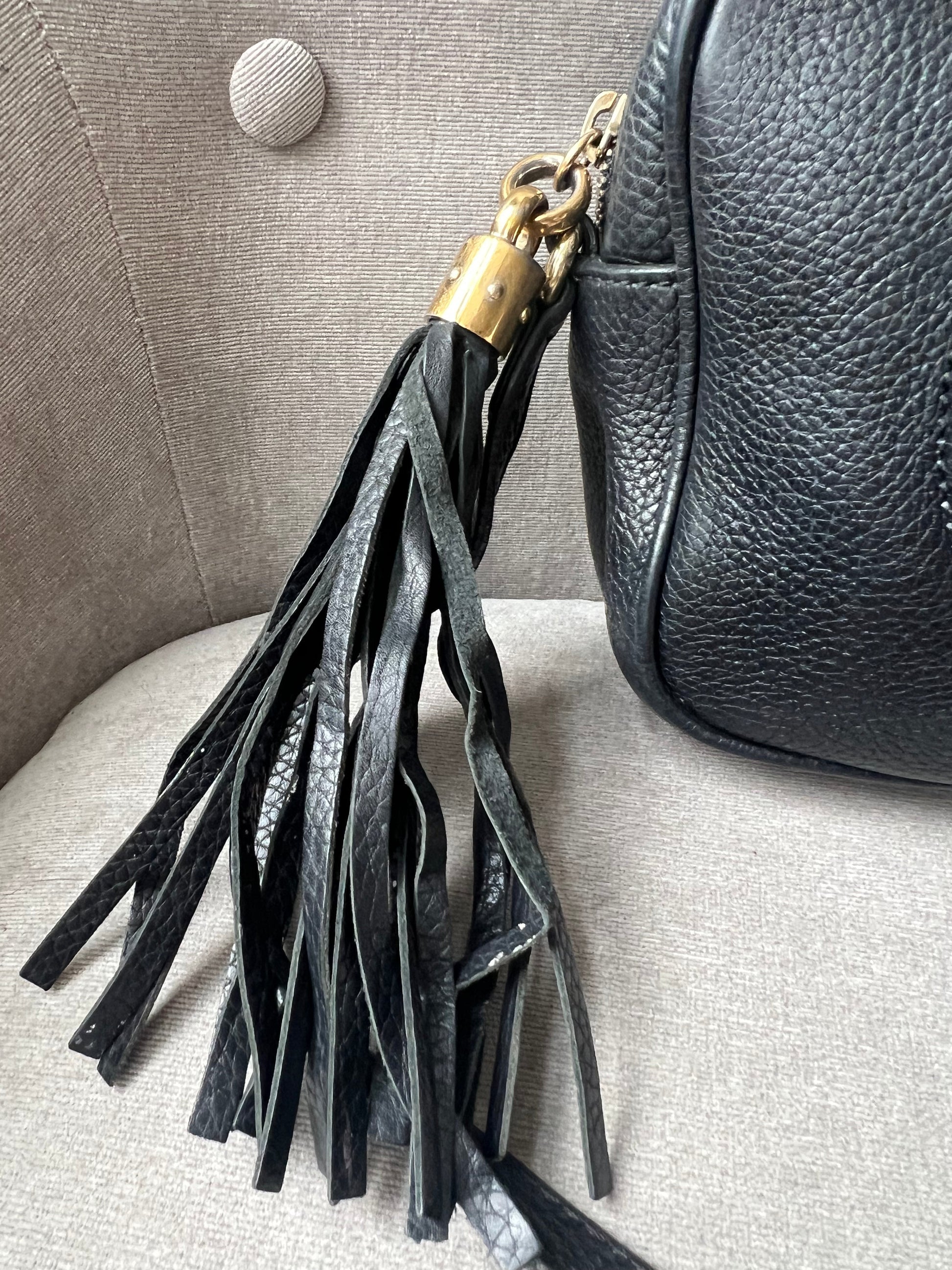 Gucci Soho Disco in Black Leather with pale gold hardware. This practical, cross body, camera style bag is compact in size but still fits a reasonable amount. Can be over shoulder or cross body. Gucci's most popular style and goes with any outfit, dressed up or down.