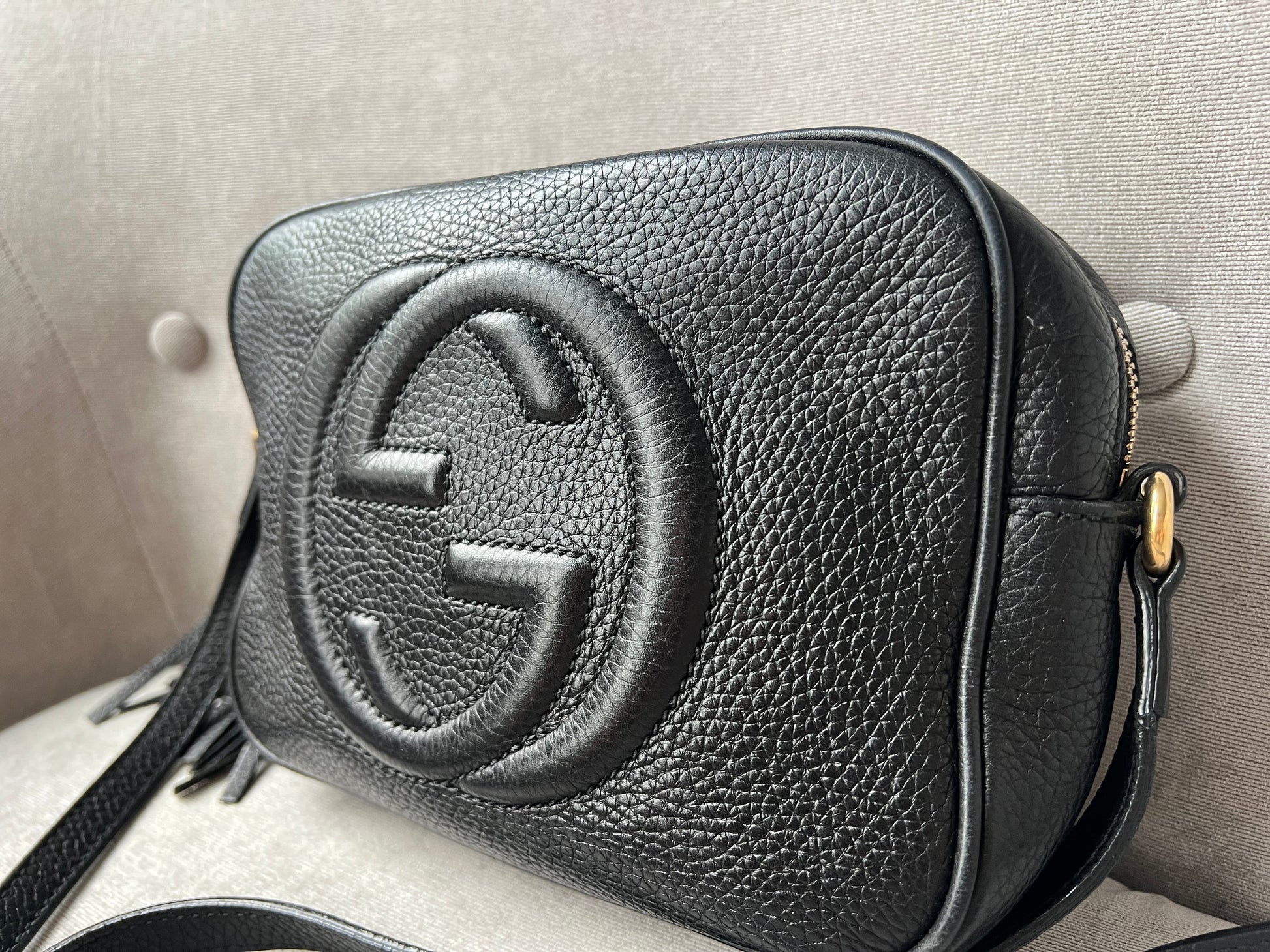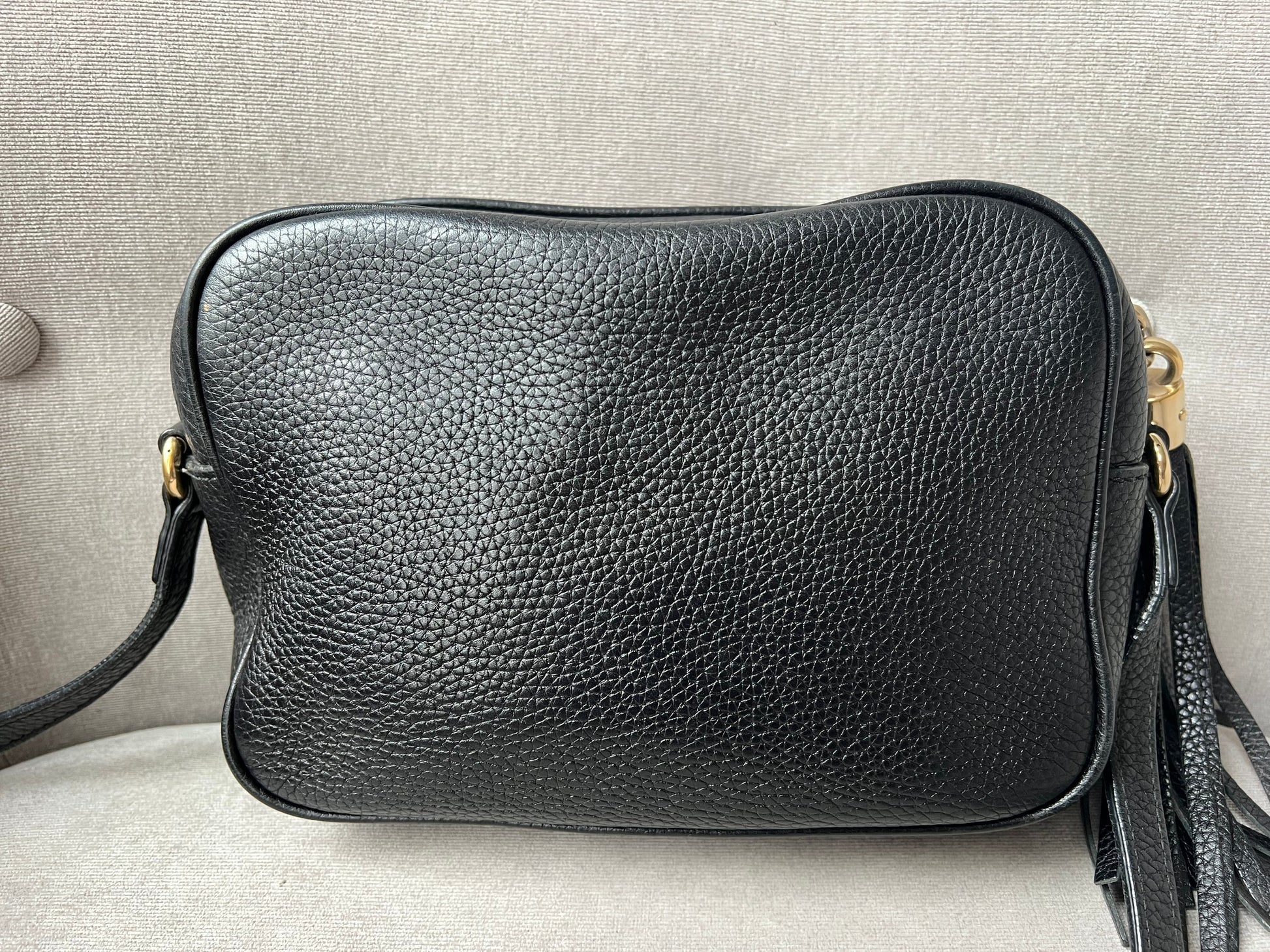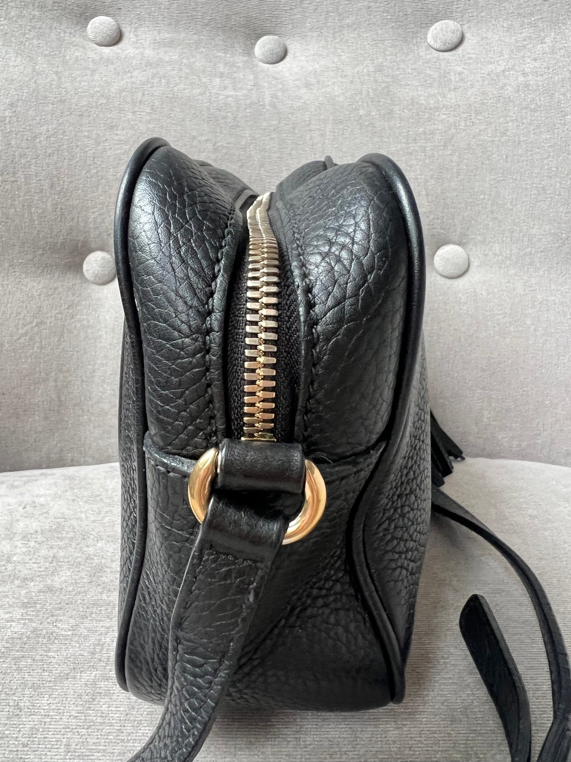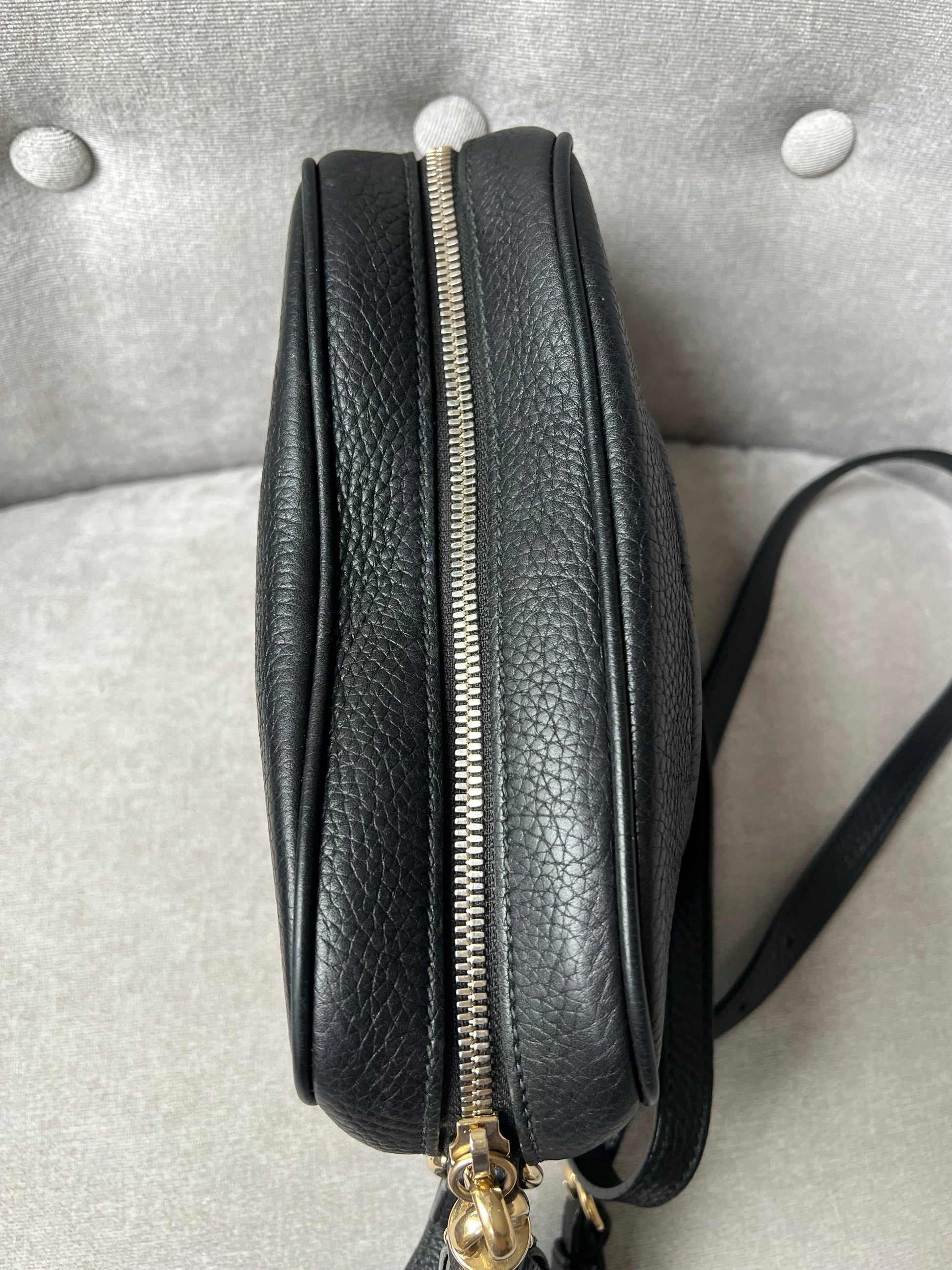 Gucci Soho Disco in Black Leather with pale gold hardware. This practical, cross body, camera style bag is compact in size but still fits a reasonable amount. Can be over shoulder or cross body. Gucci's most popular style and goes with any outfit, dressed up or down.