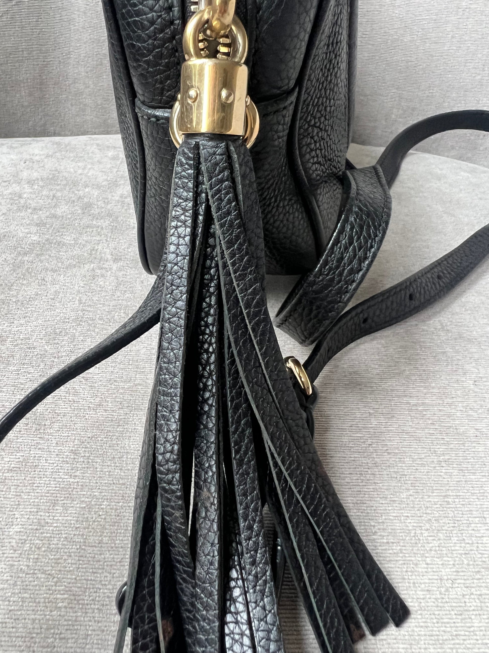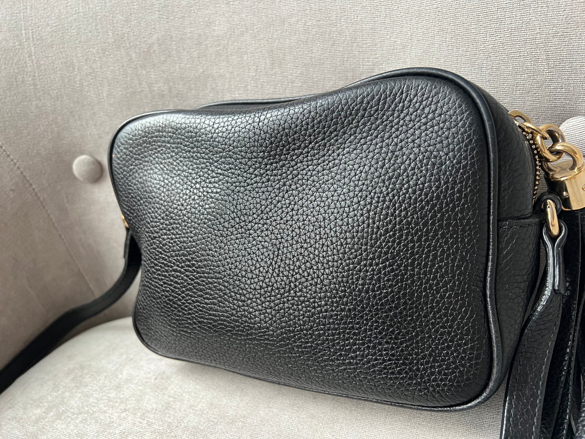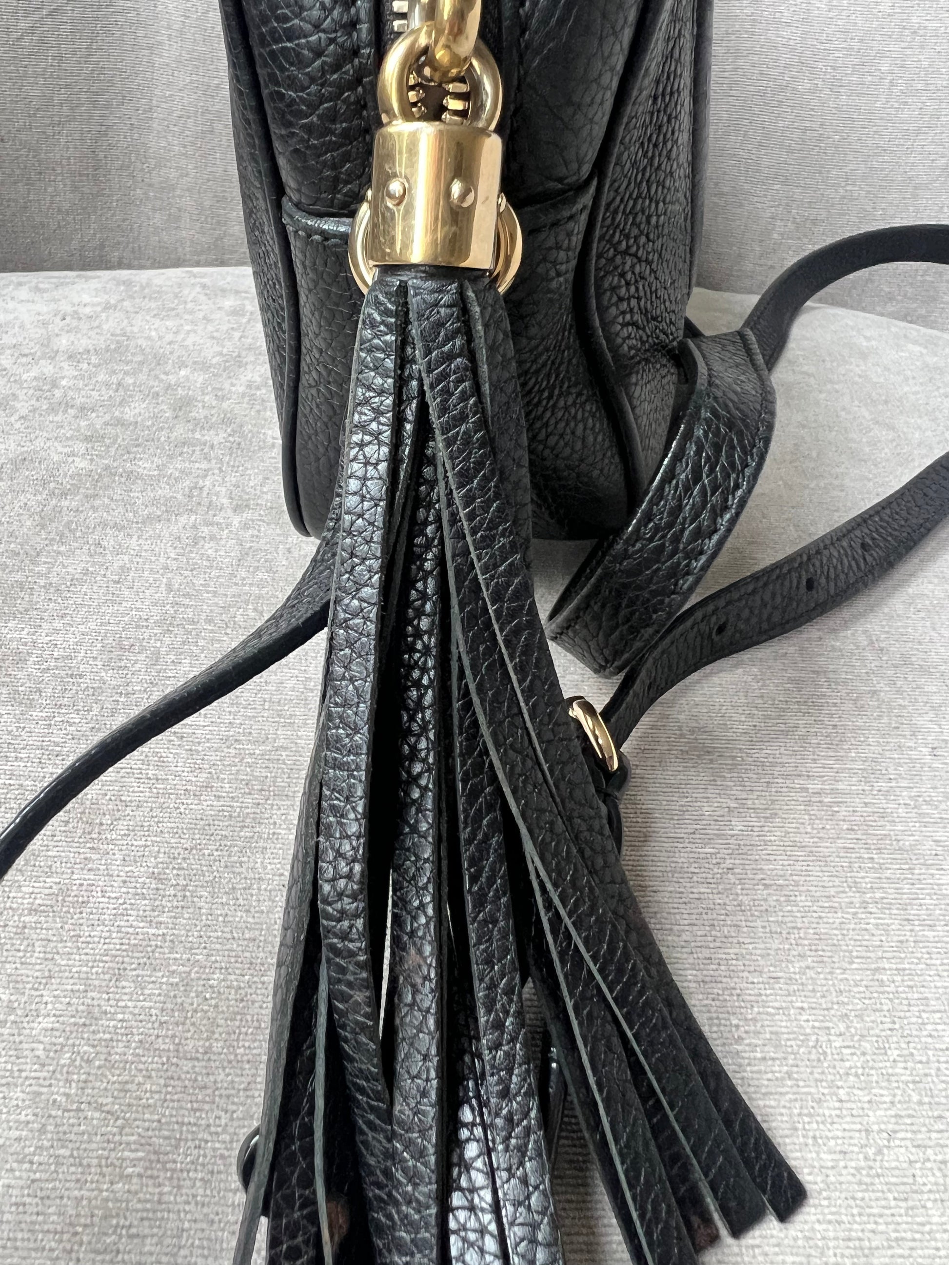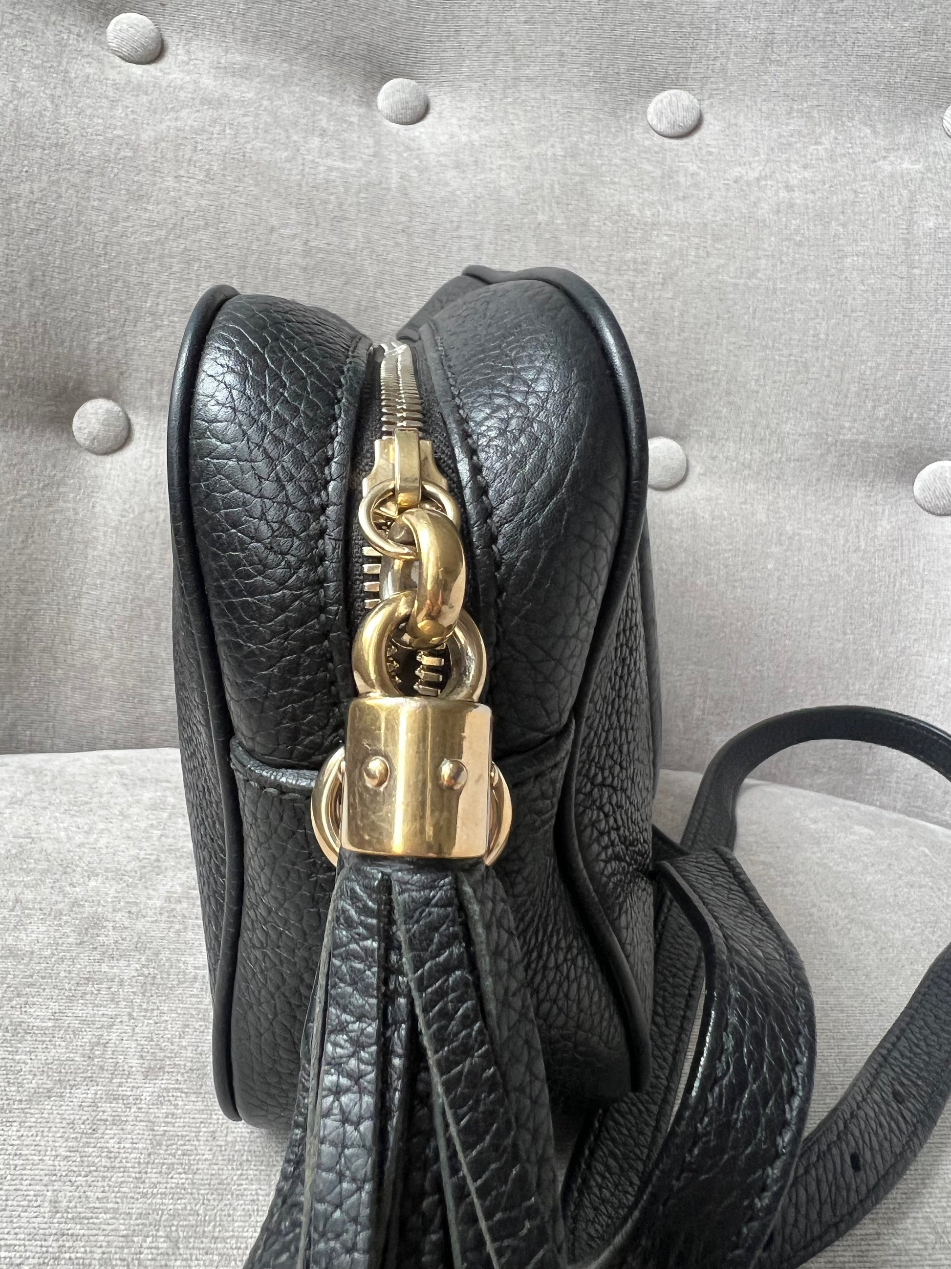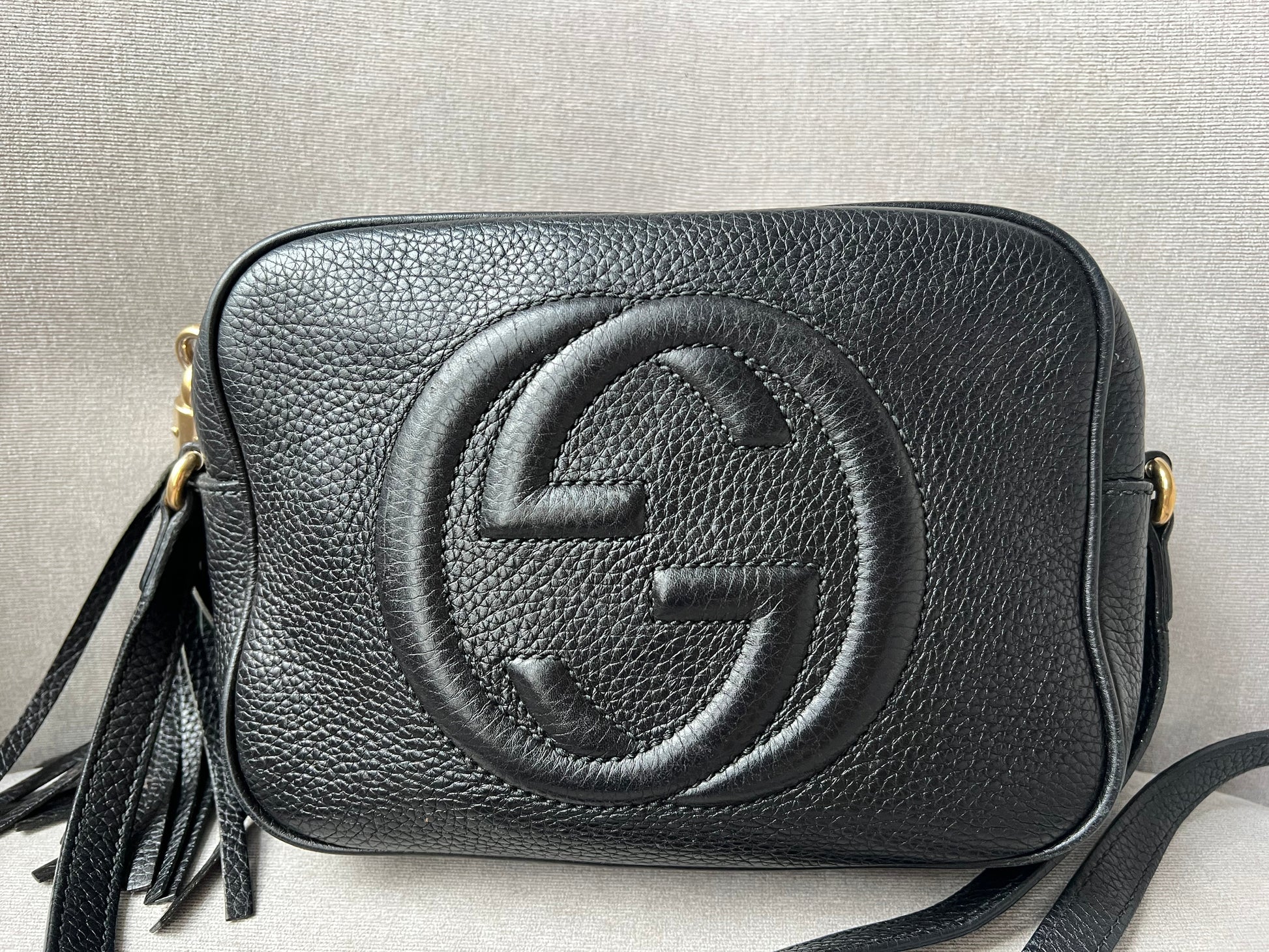 Gucci Soho Disco in Black Leather with pale gold hardware. This practical, cross body, camera style bag is compact in size but still fits a reasonable amount. Can be over shoulder or cross body. Gucci's most popular style and goes with any outfit, dressed up or down.
