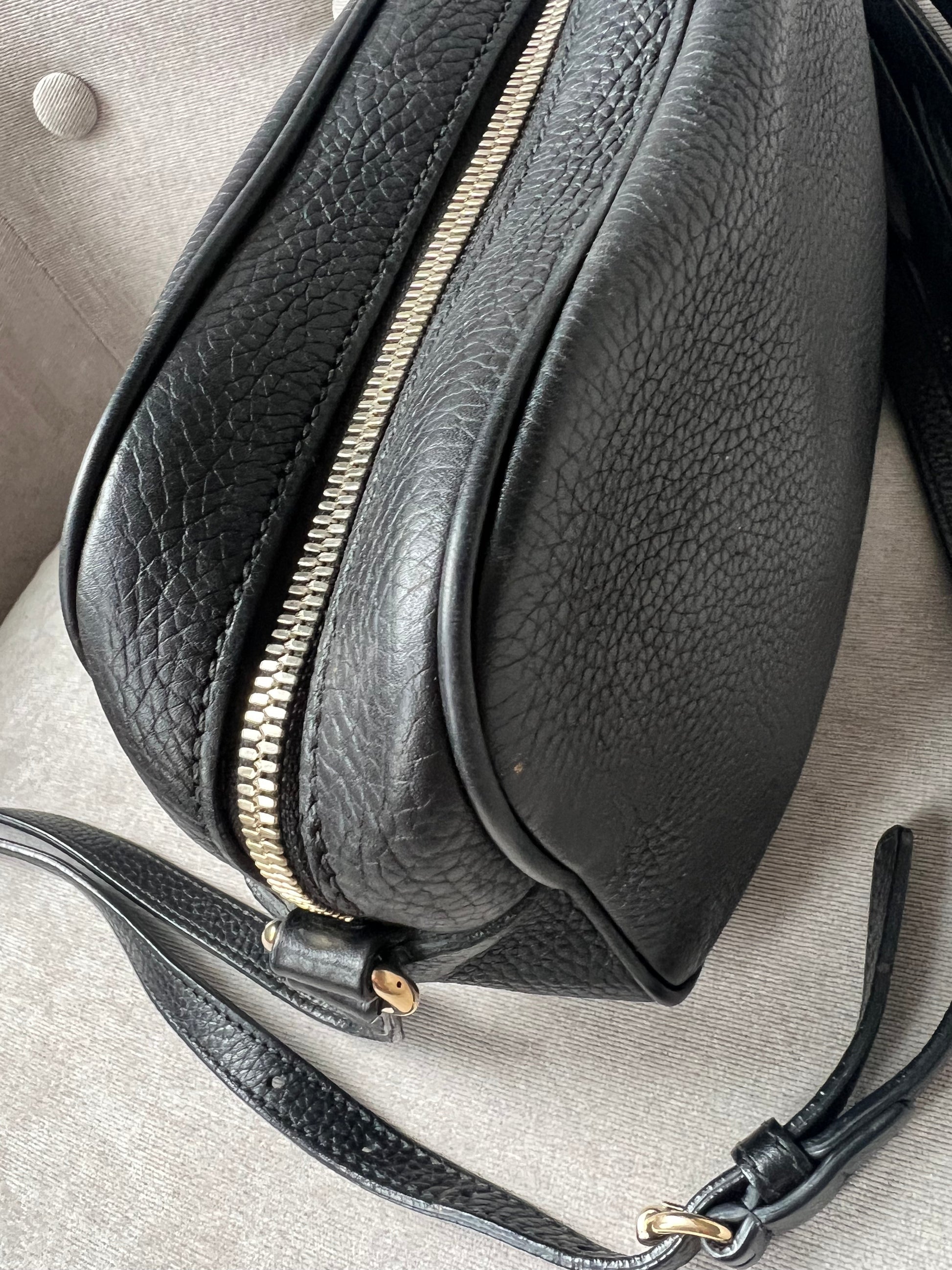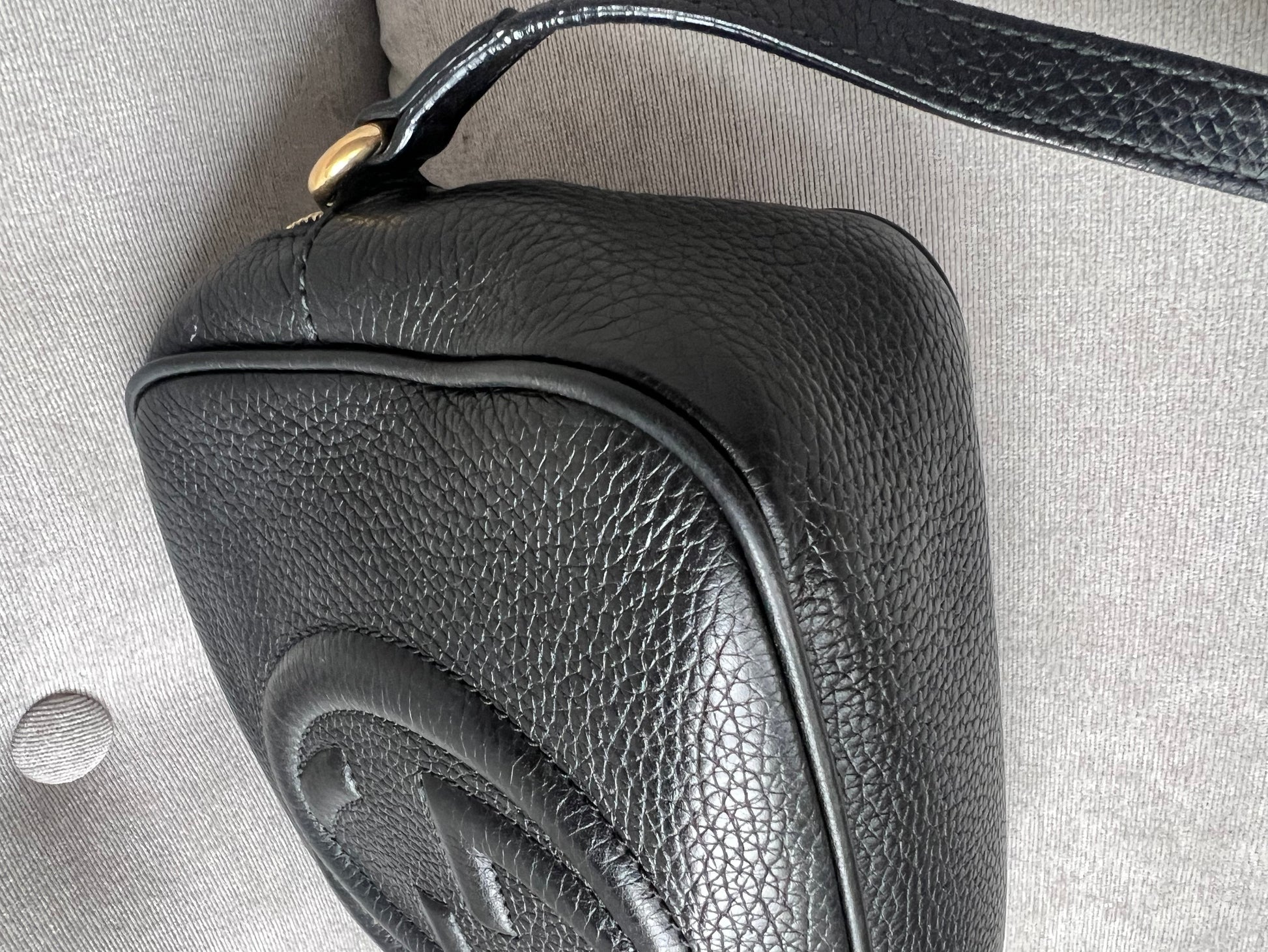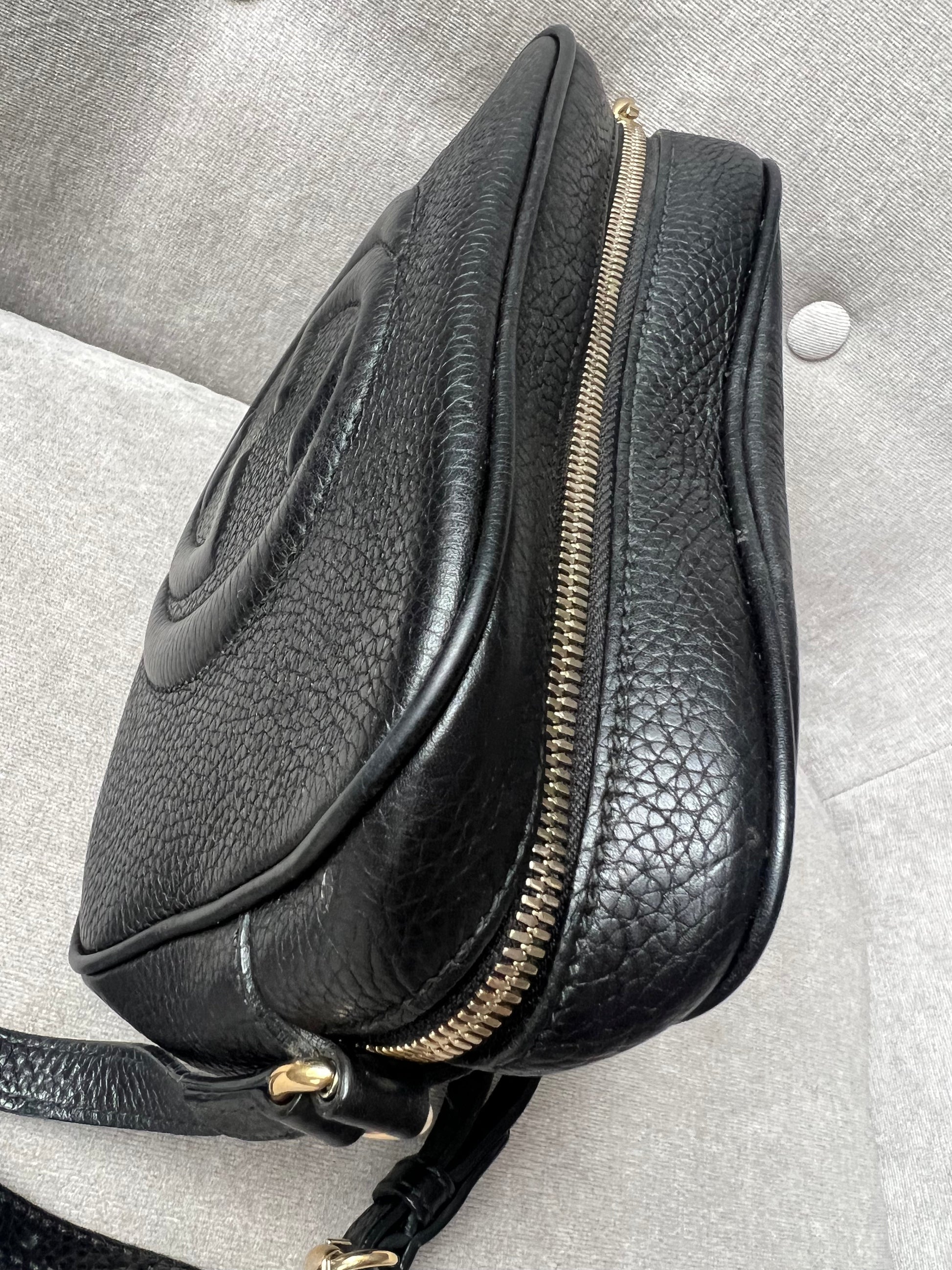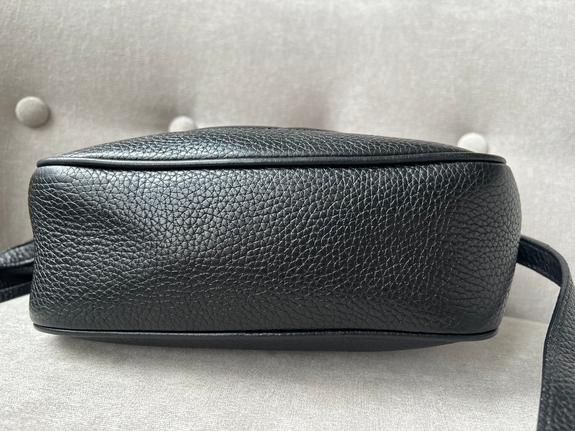 Gucci Soho Disco in Black Leather with pale gold hardware. This practical, cross body, camera style bag is compact in size but still fits a reasonable amount. Can be over shoulder or cross body. Gucci's most popular style and goes with any outfit, dressed up or down.