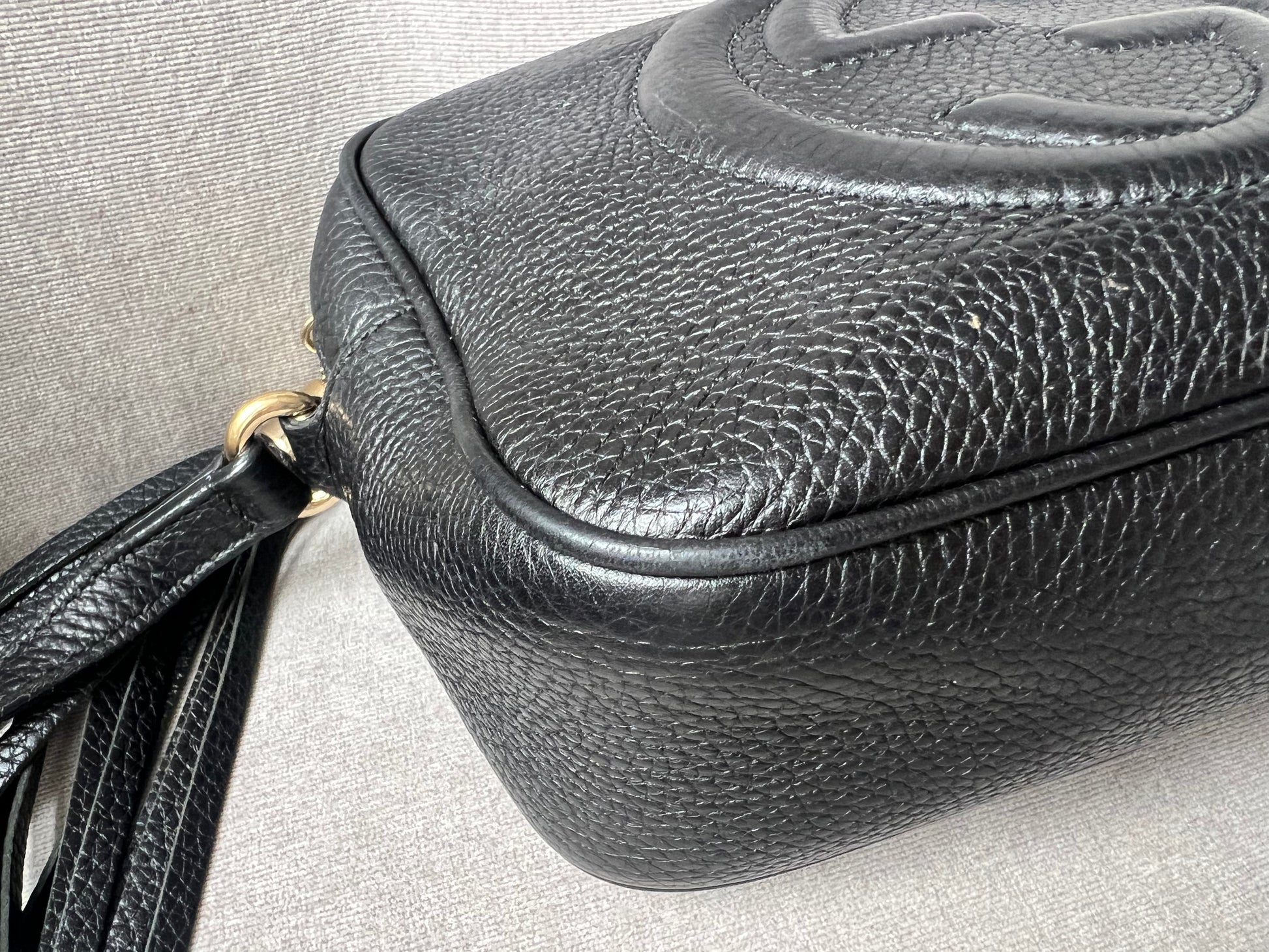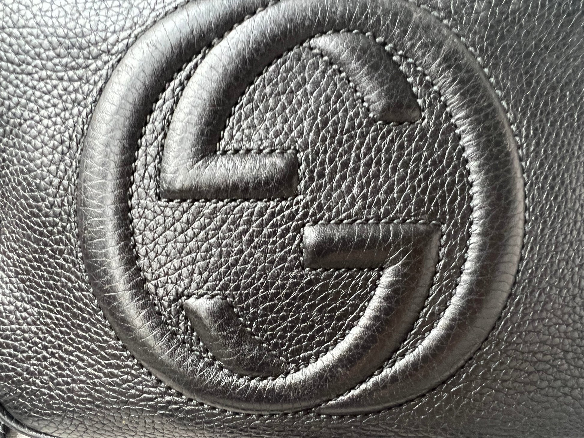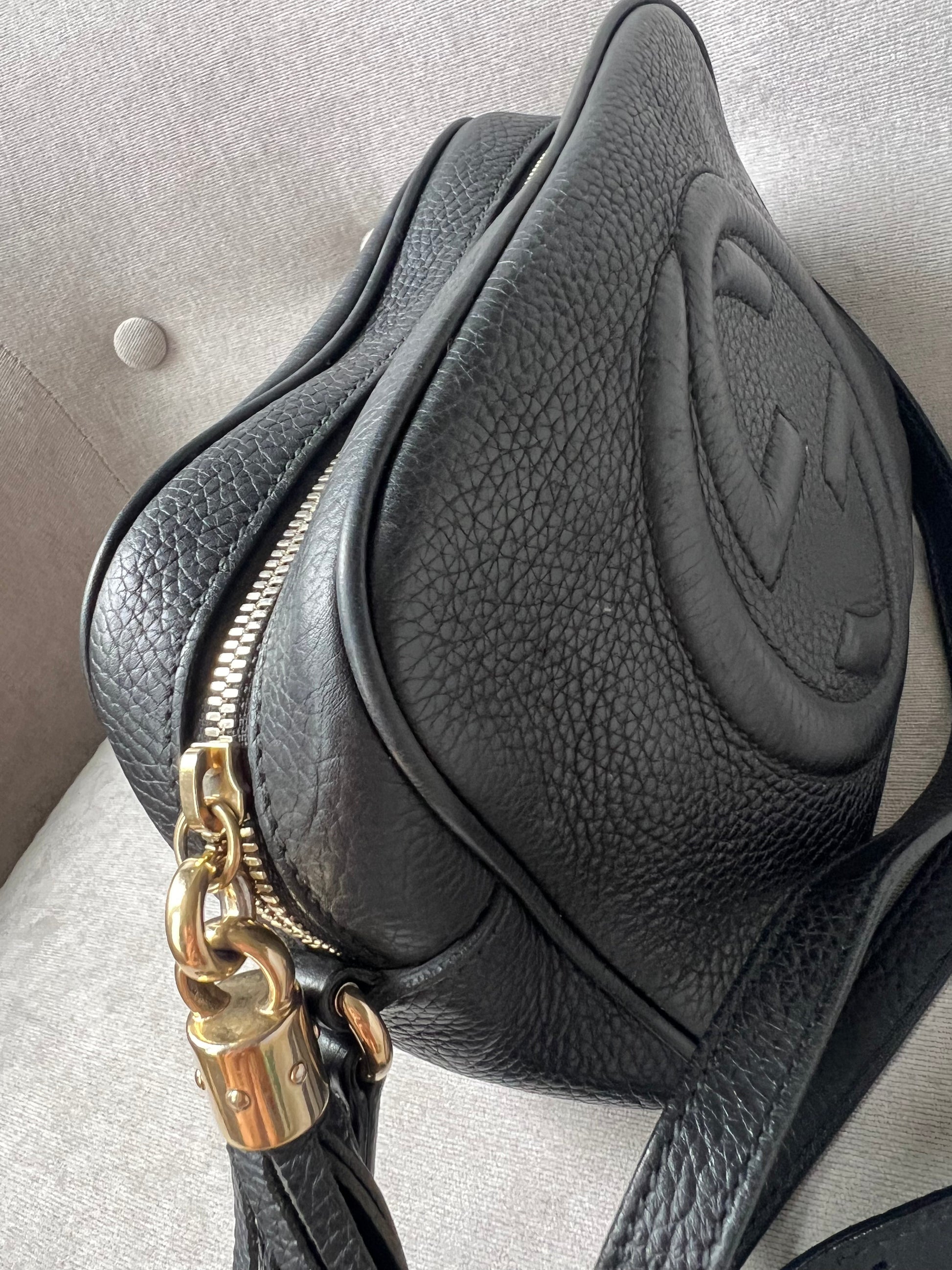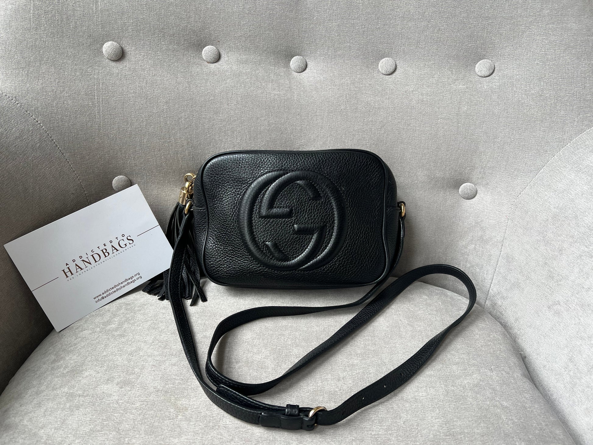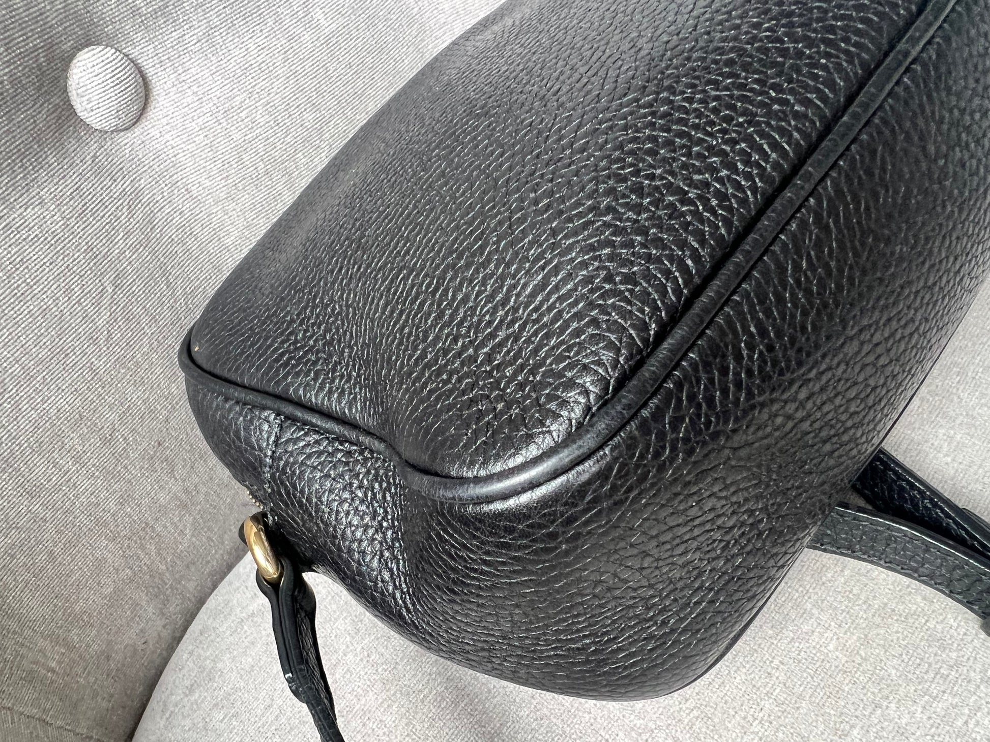 Gucci Soho Disco in Black Leather with pale gold hardware. This practical, cross body, camera style bag is compact in size but still fits a reasonable amount. Can be over shoulder or cross body. Gucci's most popular style and goes with any outfit, dressed up or down.