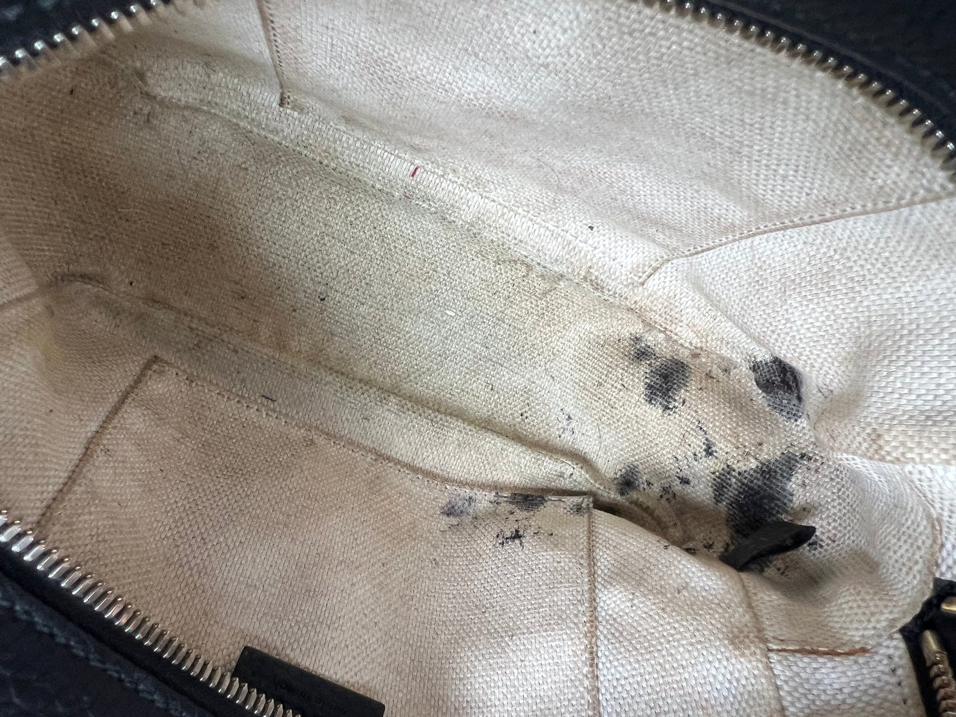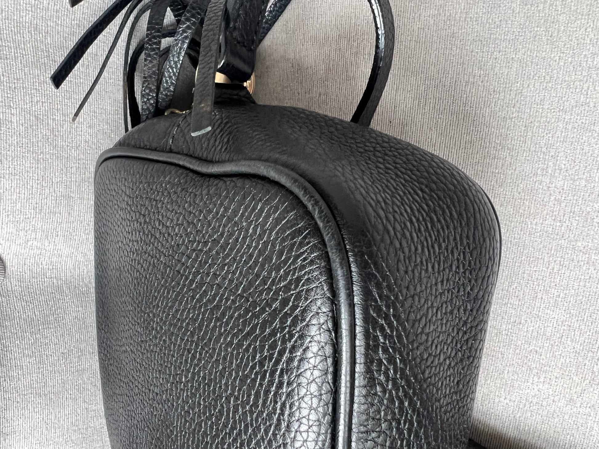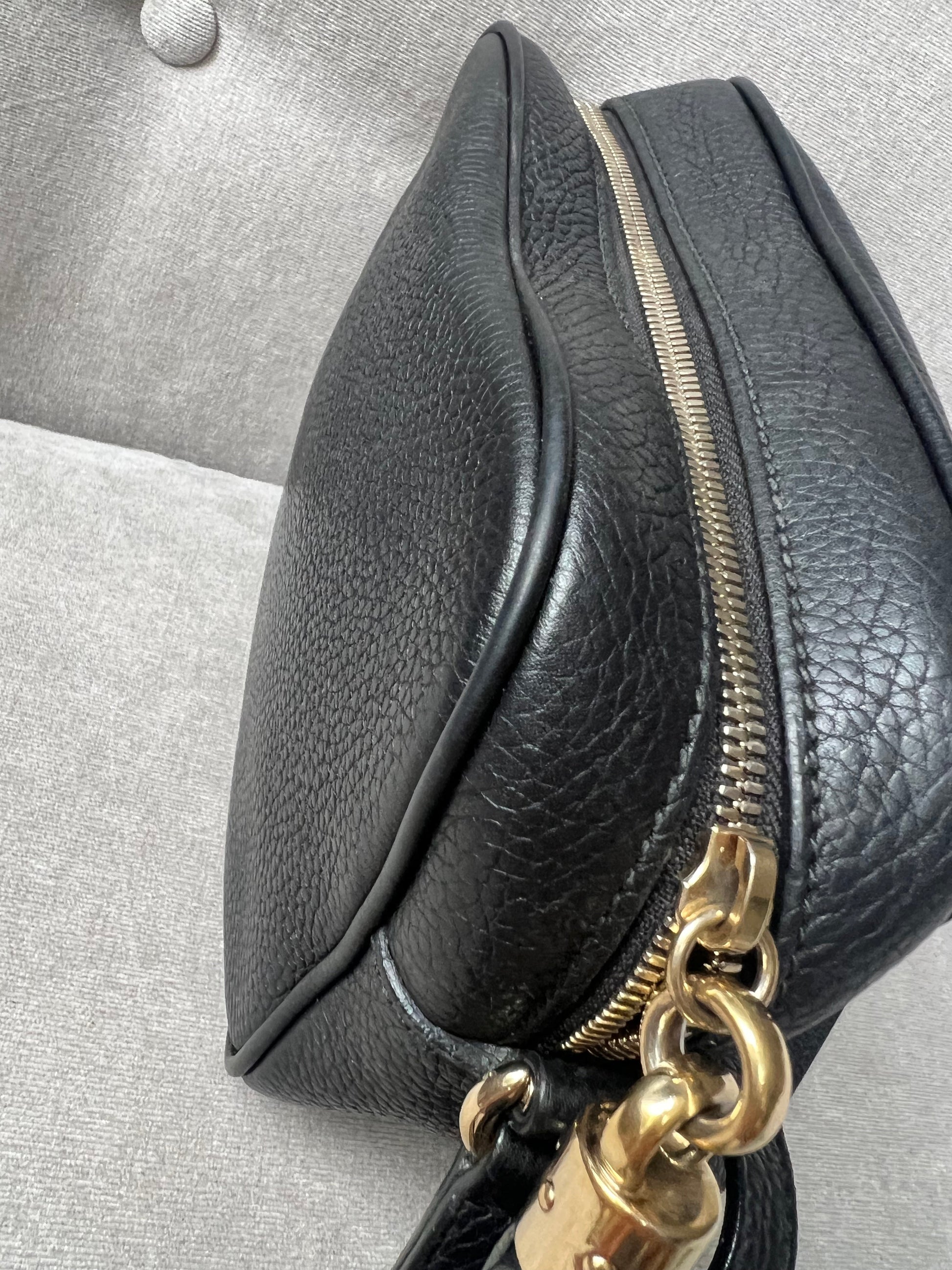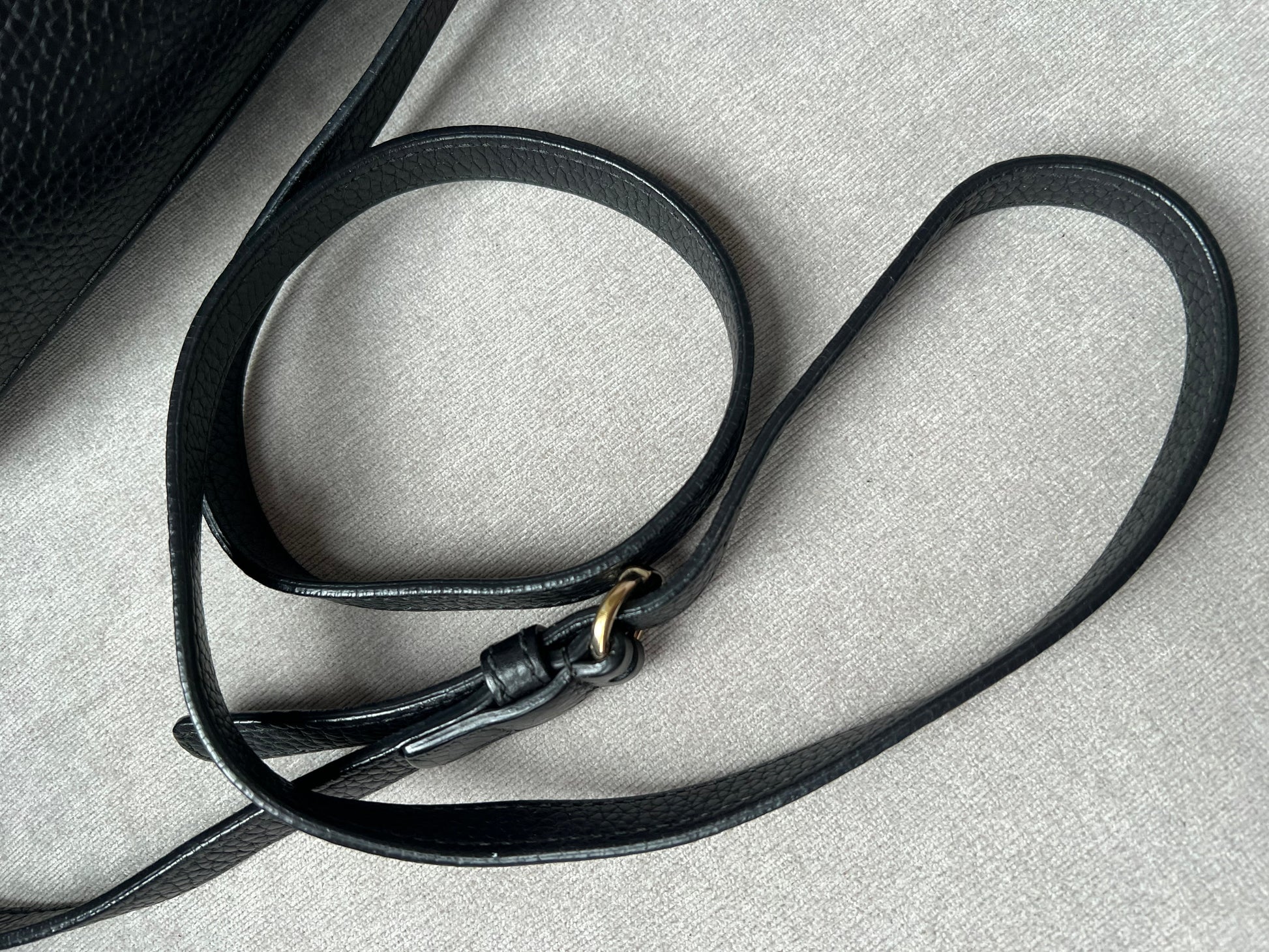 Gucci Soho Disco in Black Leather with pale gold hardware. This practical, cross body, camera style bag is compact in size but still fits a reasonable amount. Can be over shoulder or cross body. Gucci's most popular style and goes with any outfit, dressed up or down.