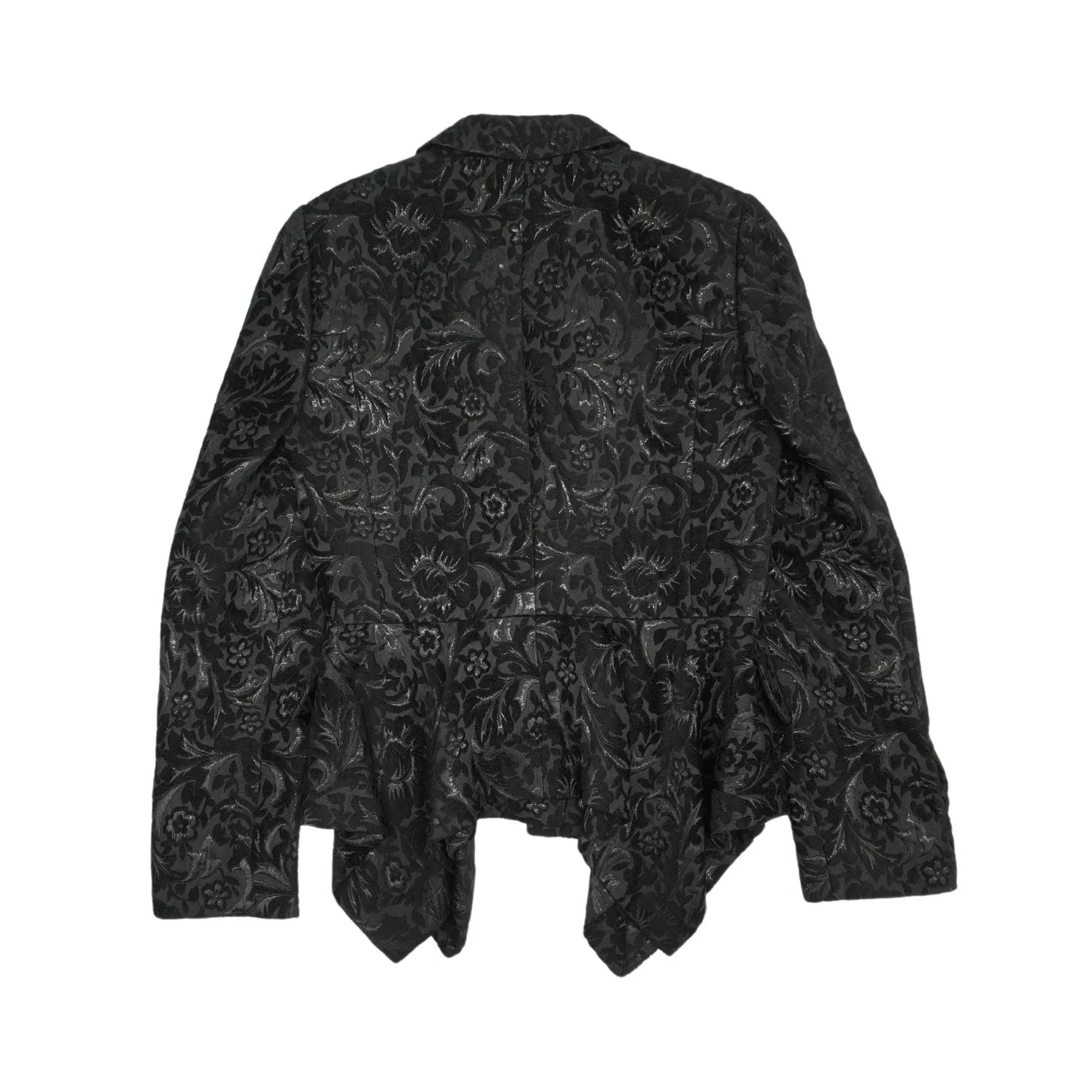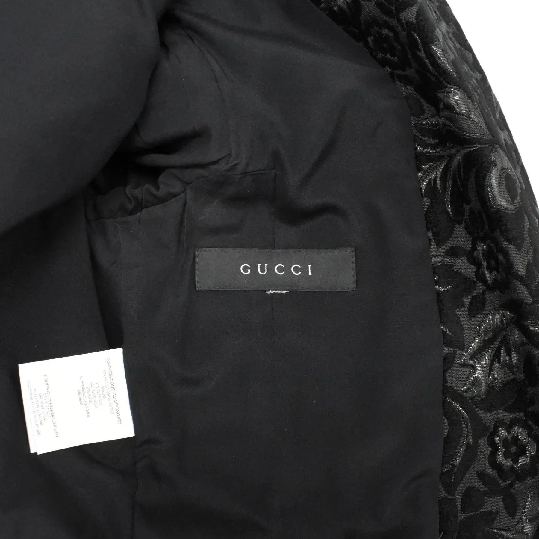 Gucci blazer in black lurex thread and tonal floral printed design with a notch lapel collar and single-breasted bee button closure in gold and rhinestones. Features an asymmetrical flowy panel on the bottom, flap pockets and button detailing on the sleeves.