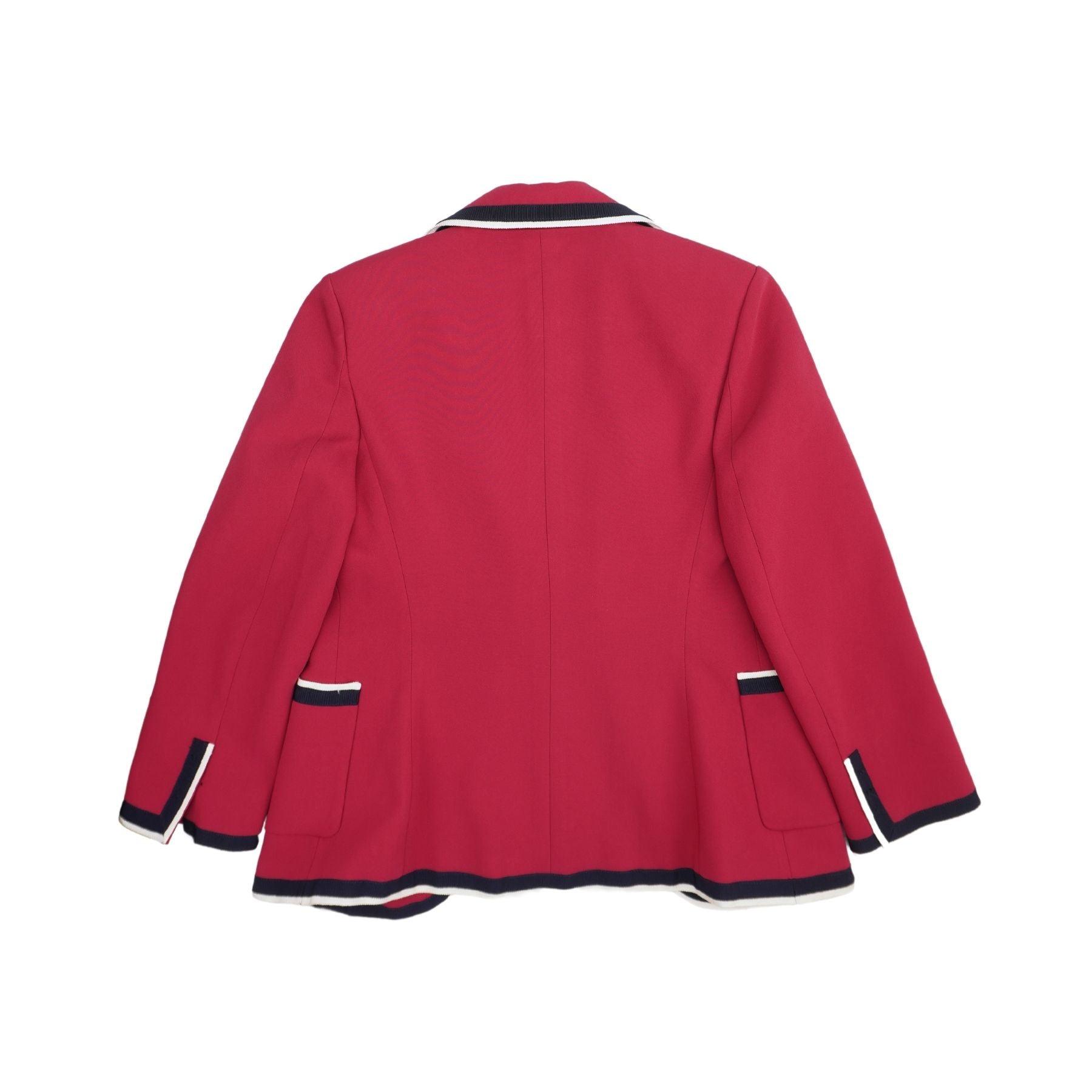 Gucci blazer in magenta with a notched lapel collar and navy and white striped trim. Features a 2-button front closure, side slip pockets, and a cream and red clover interior lining.