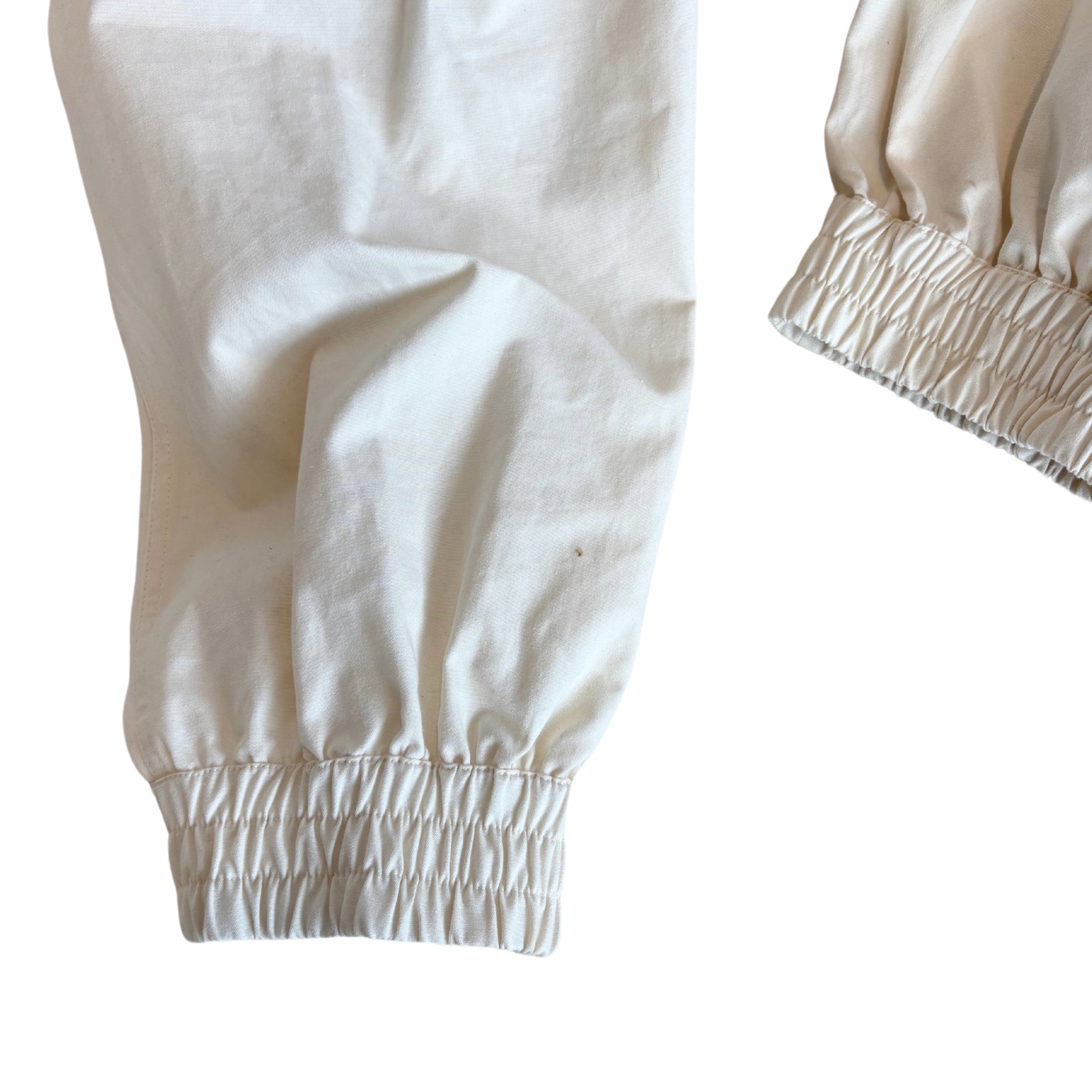 Gucci boiler suit in cream cotton with a hidden front-zip opening, front zip and slip pockets, red and green racing stripe trim, a vintage logo patch, and tonal text embroidery across the back.