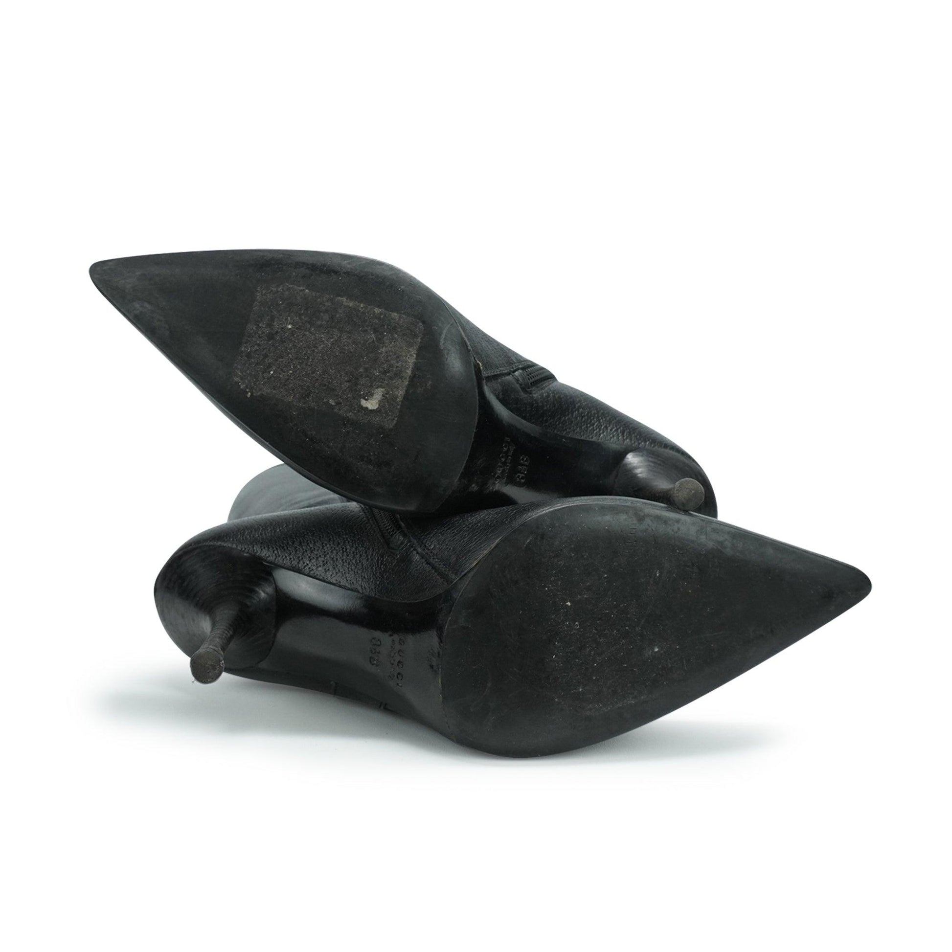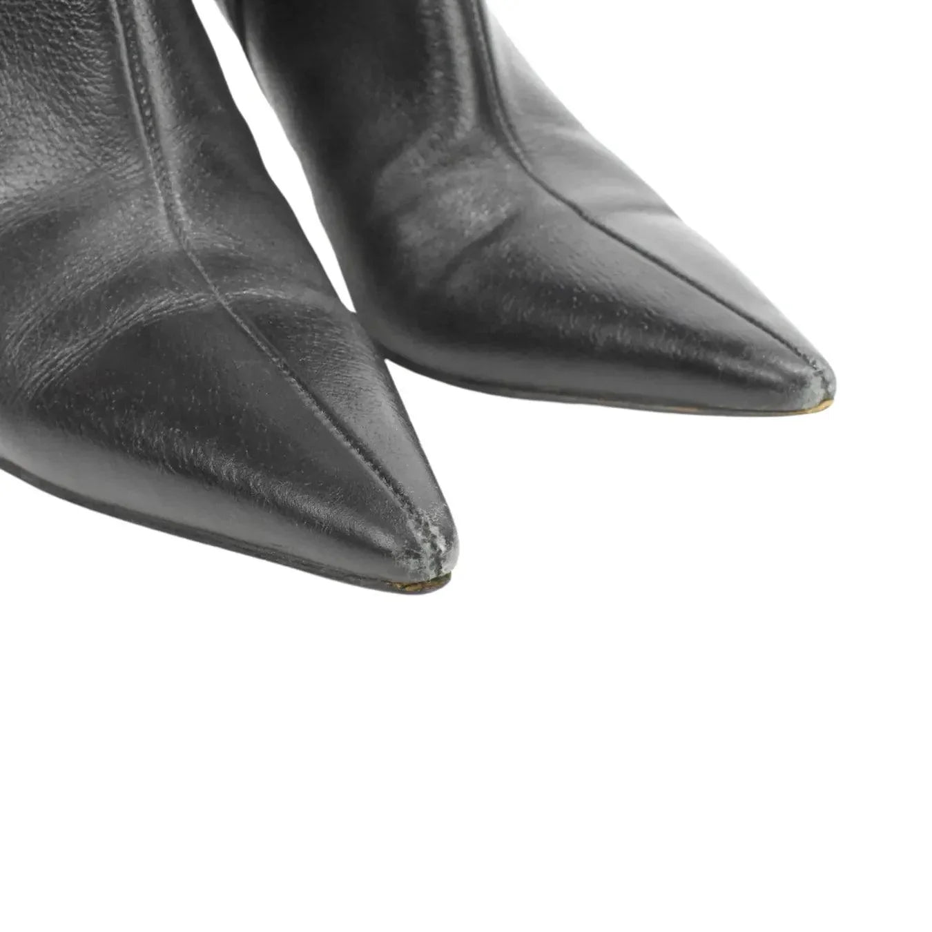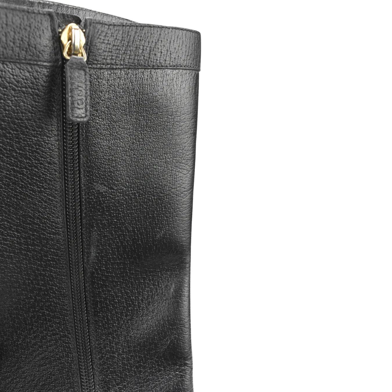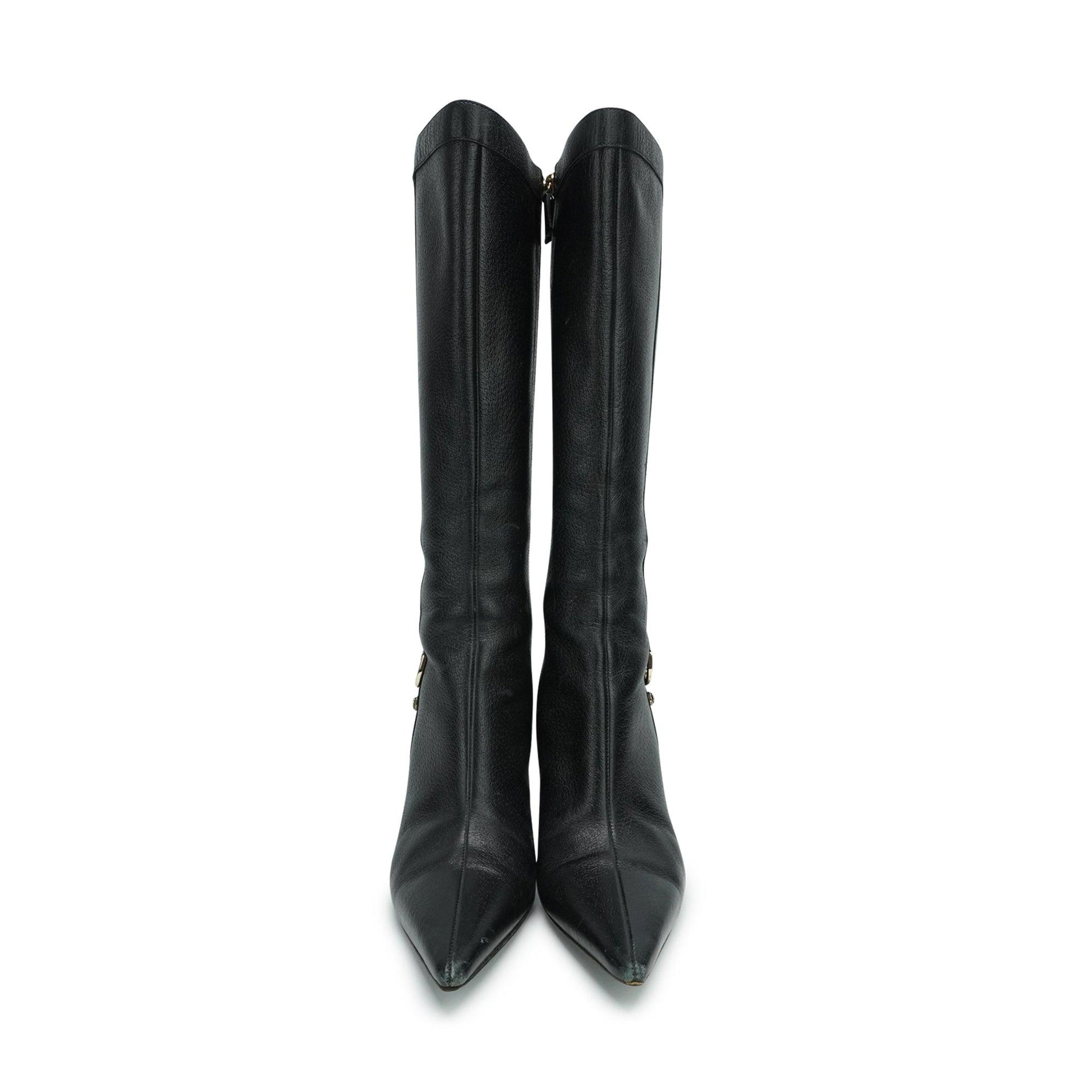 Gucci calf-high boots in black leather with a stiletto heel, a pointed toe, and side buckle hardware in soft gold.