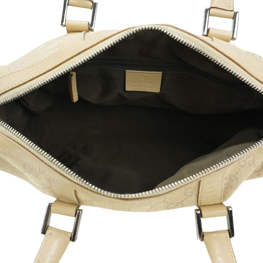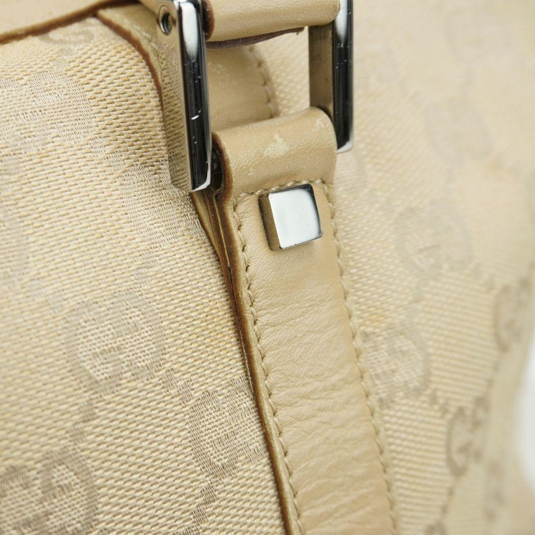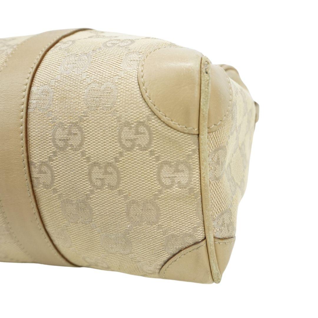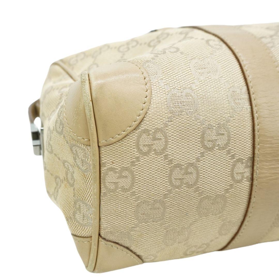 Gucci boston shoulder bag in beige monogram canvas with leather trim and handles. Features silver hardware, top zipper-closure, and a zipper-pull that clicks onto side of bag when closed. The interior is canvas lined with zip-pocket.