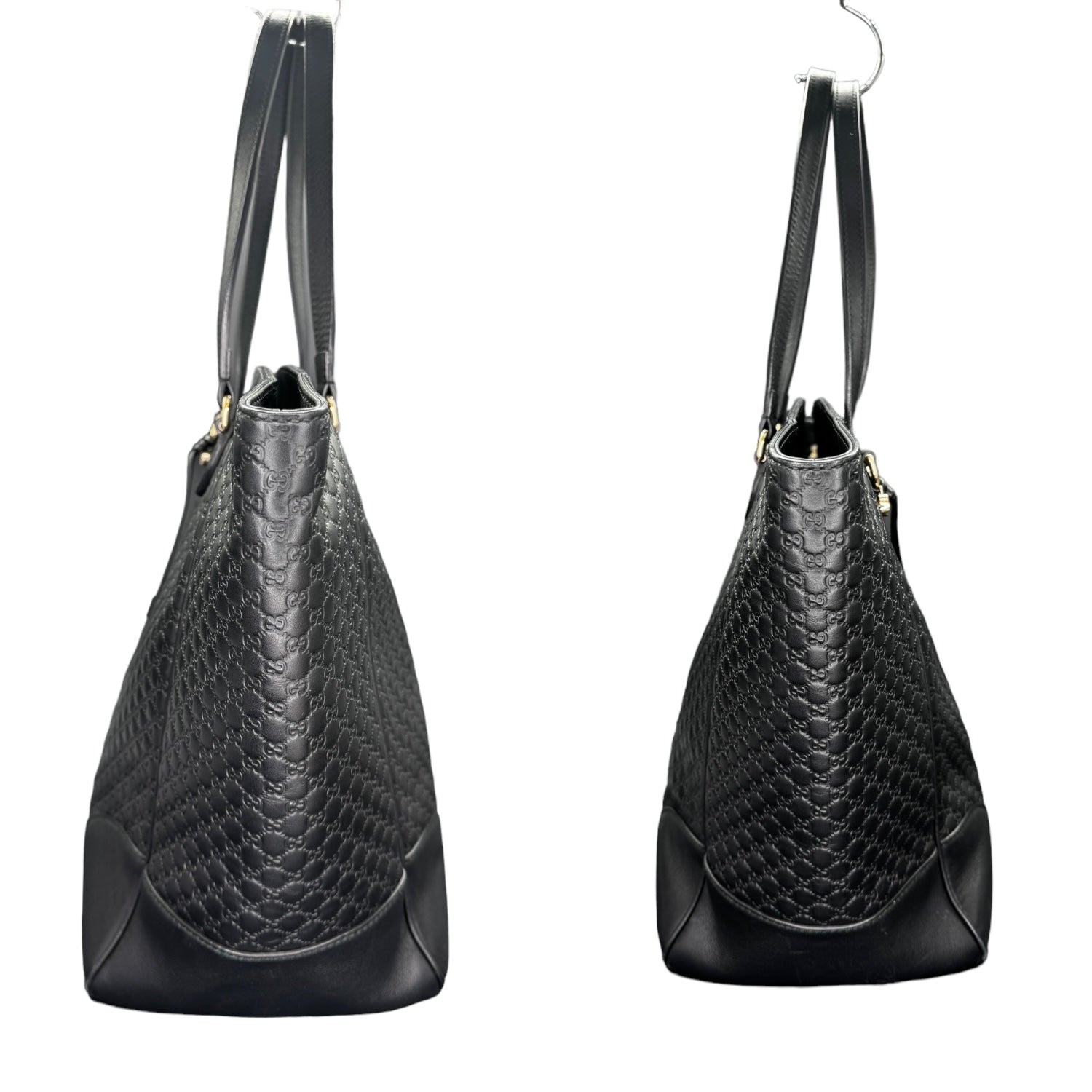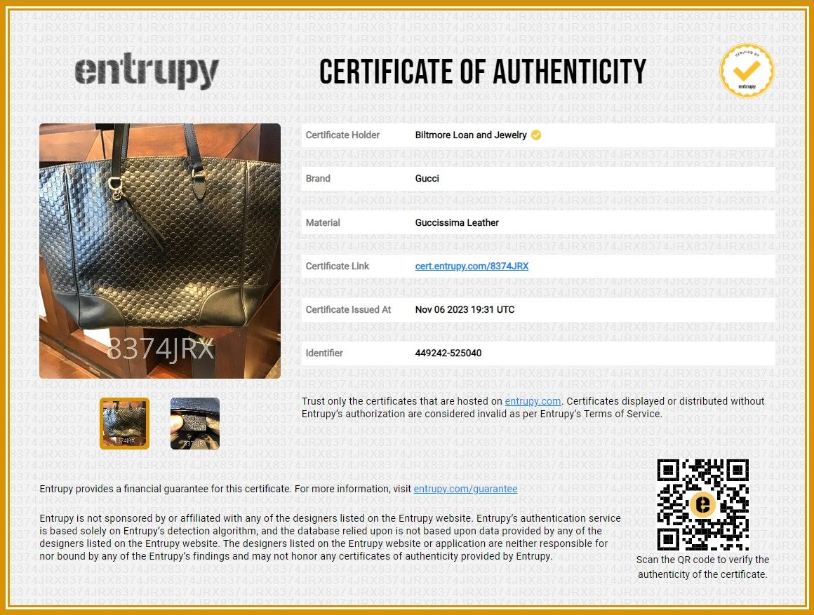 This Gucci Bree Guccissima Medium Leather Tote was made in Italy, and it is finely crafted of black Guccissima leather with black microGuccissima leather corners and black leather trim with light gold-toned hardware. It has flat double handles with 7 inch drop along with a leather string with interlocking G charm. It is certified by Entrupy!
