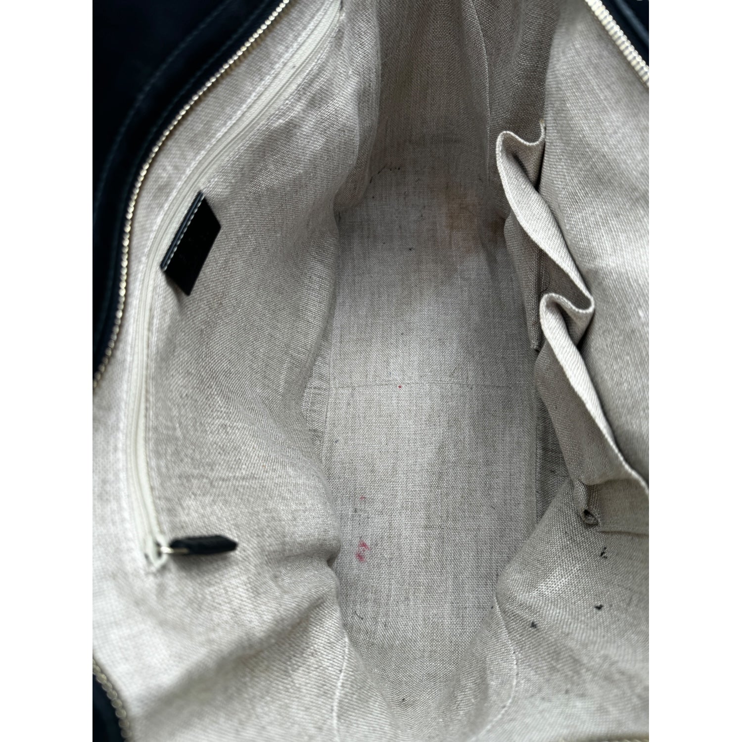 Overall Condition: Very good condition, discoloration at interior, faint scuffs at hardware, faint marks throughout leather trim.