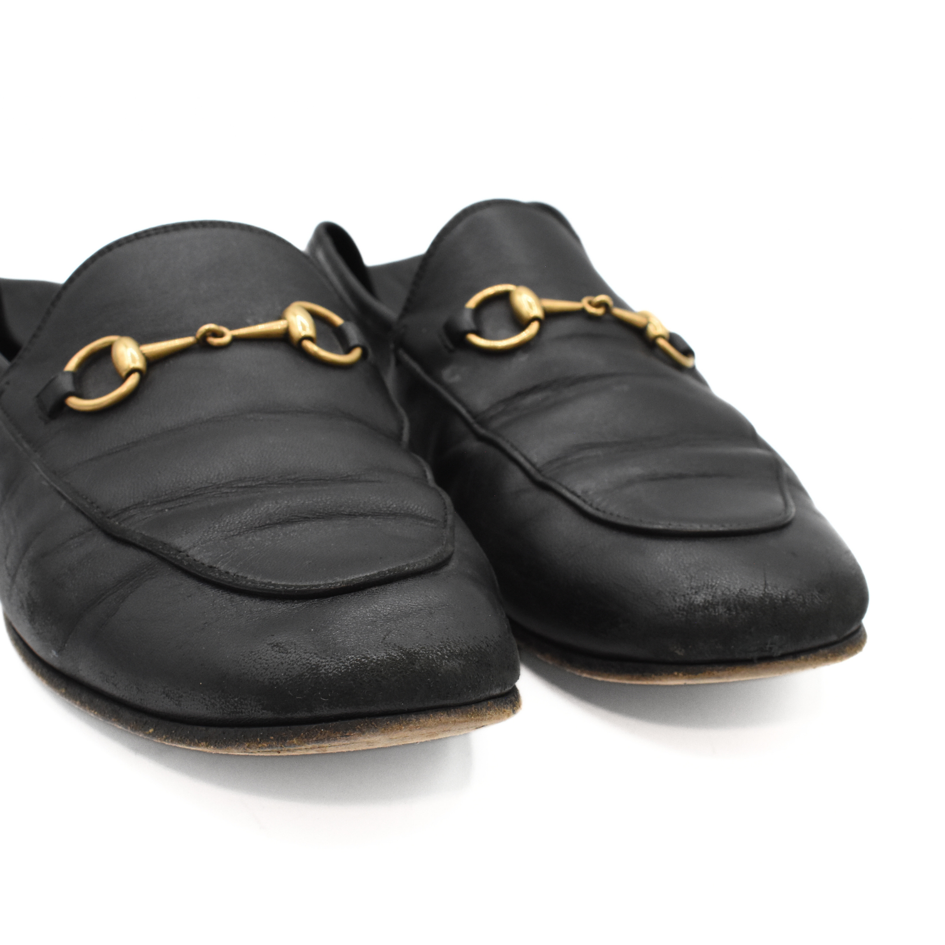 Gucci 'Brixton' loafers in supple black leather with gold horsebit hardware and optional crush back heels.