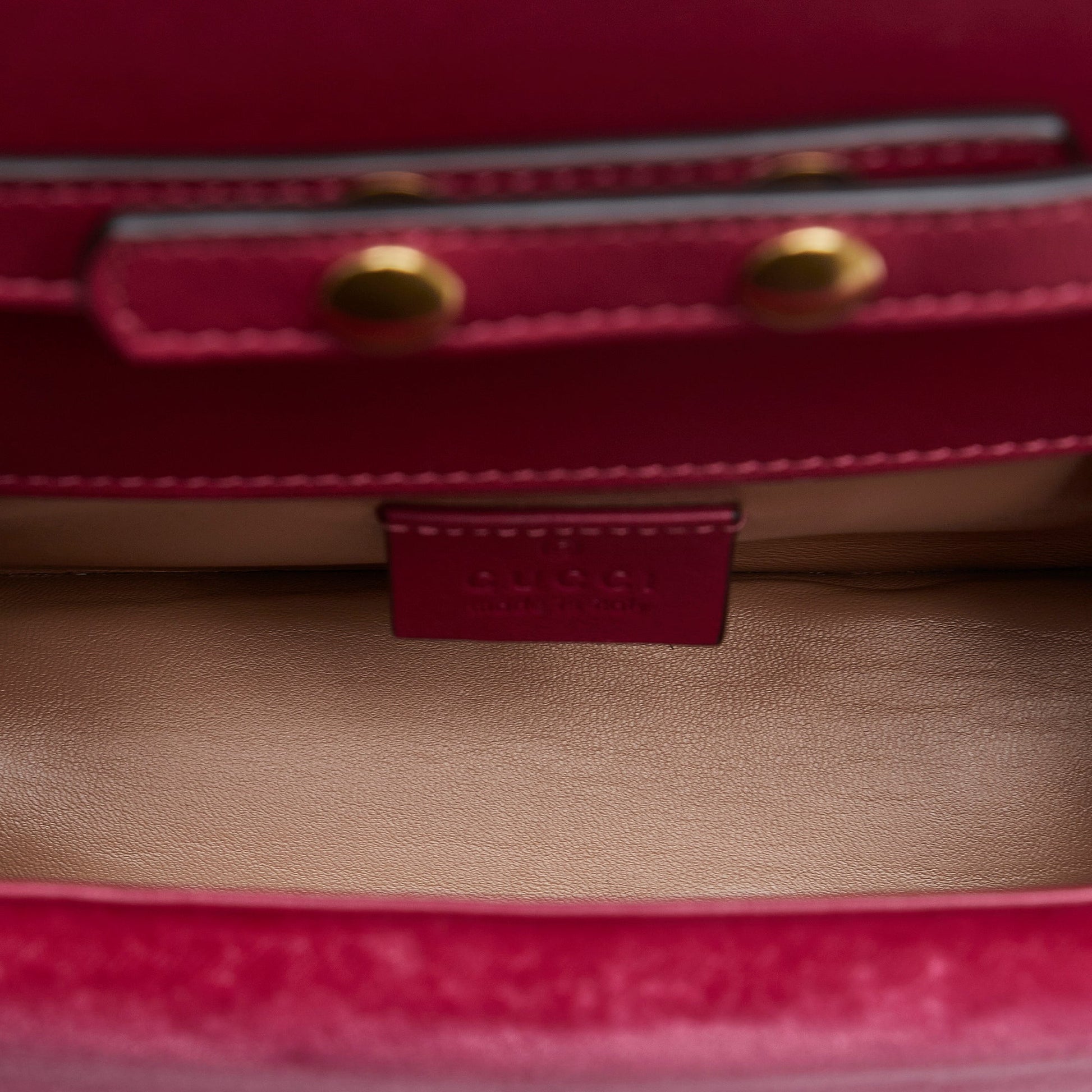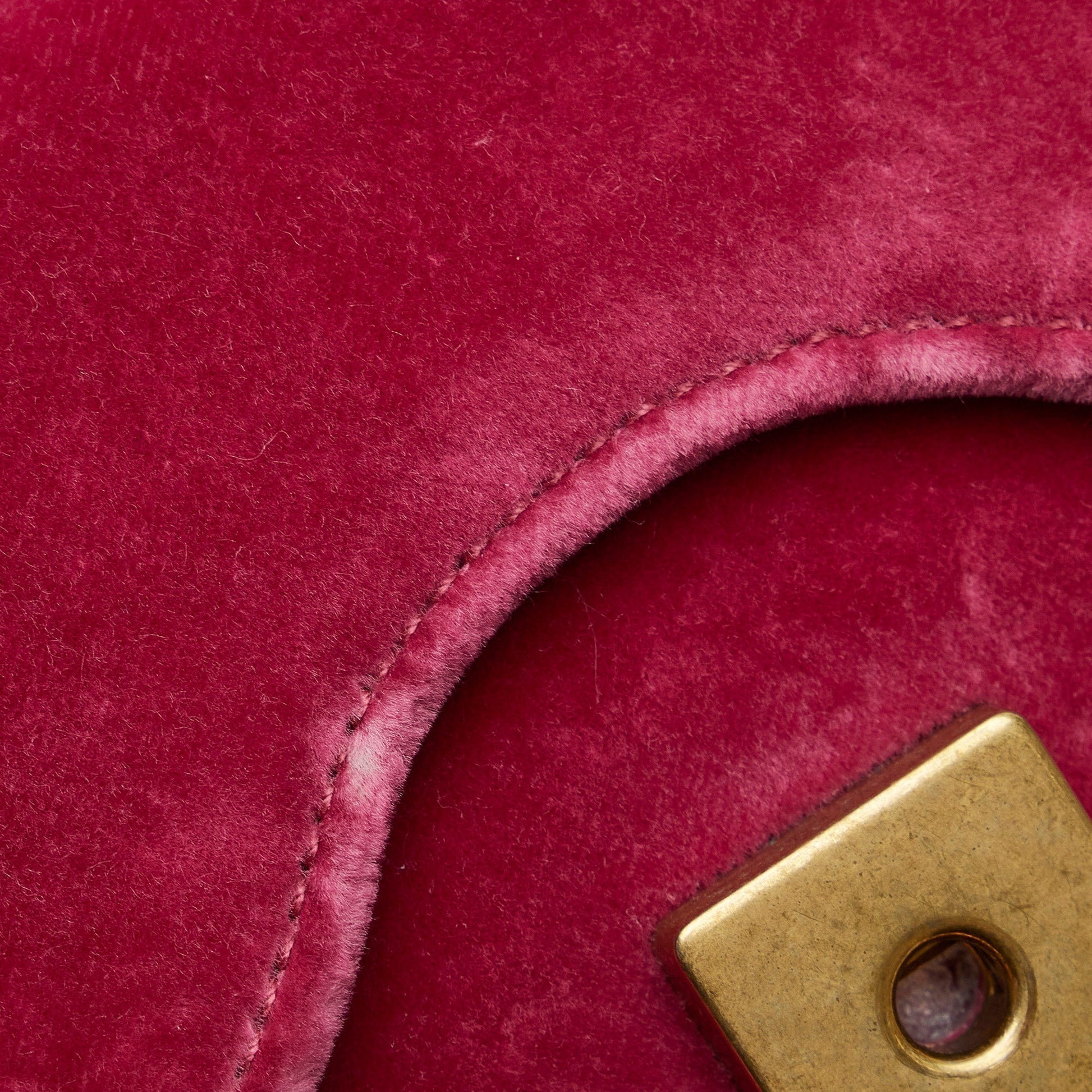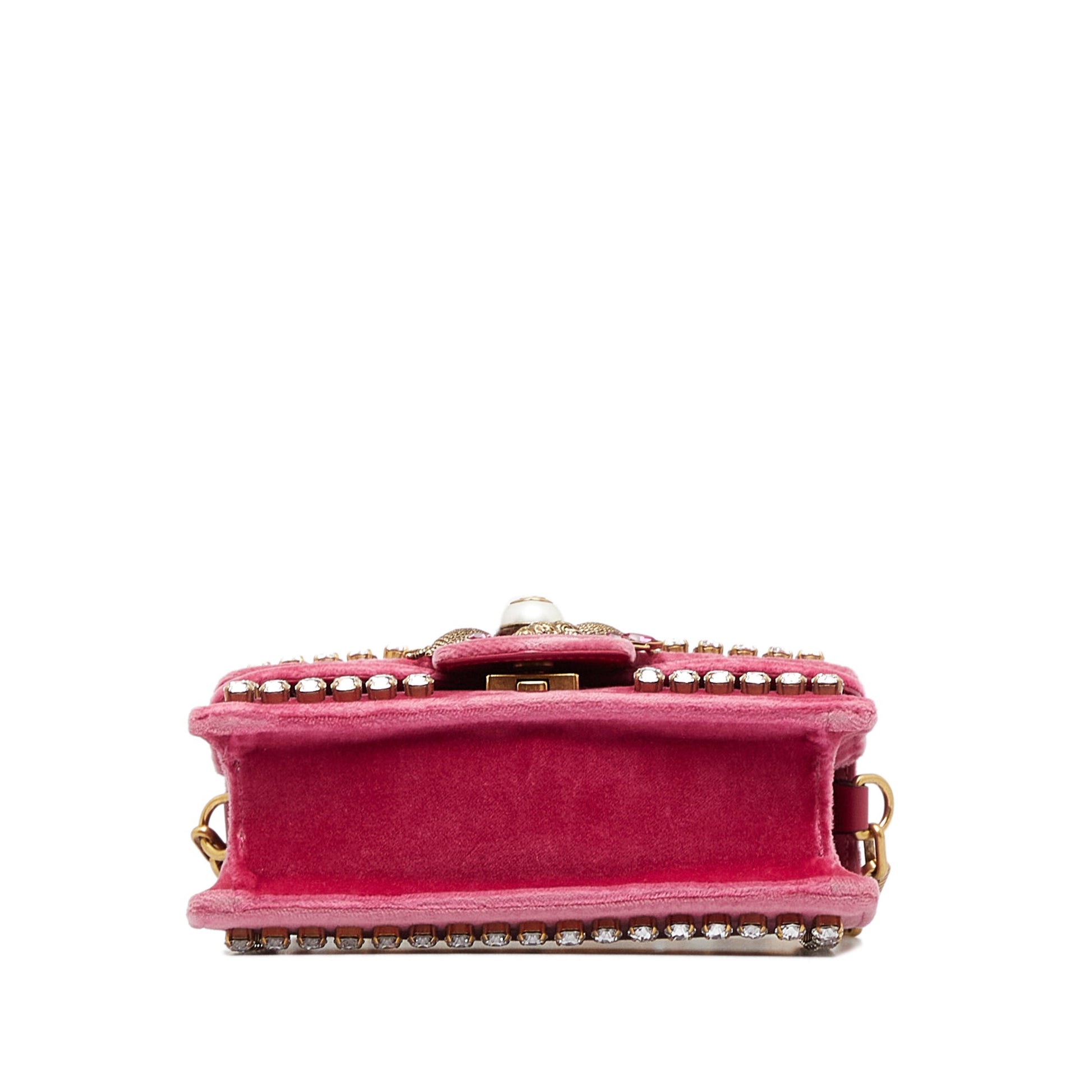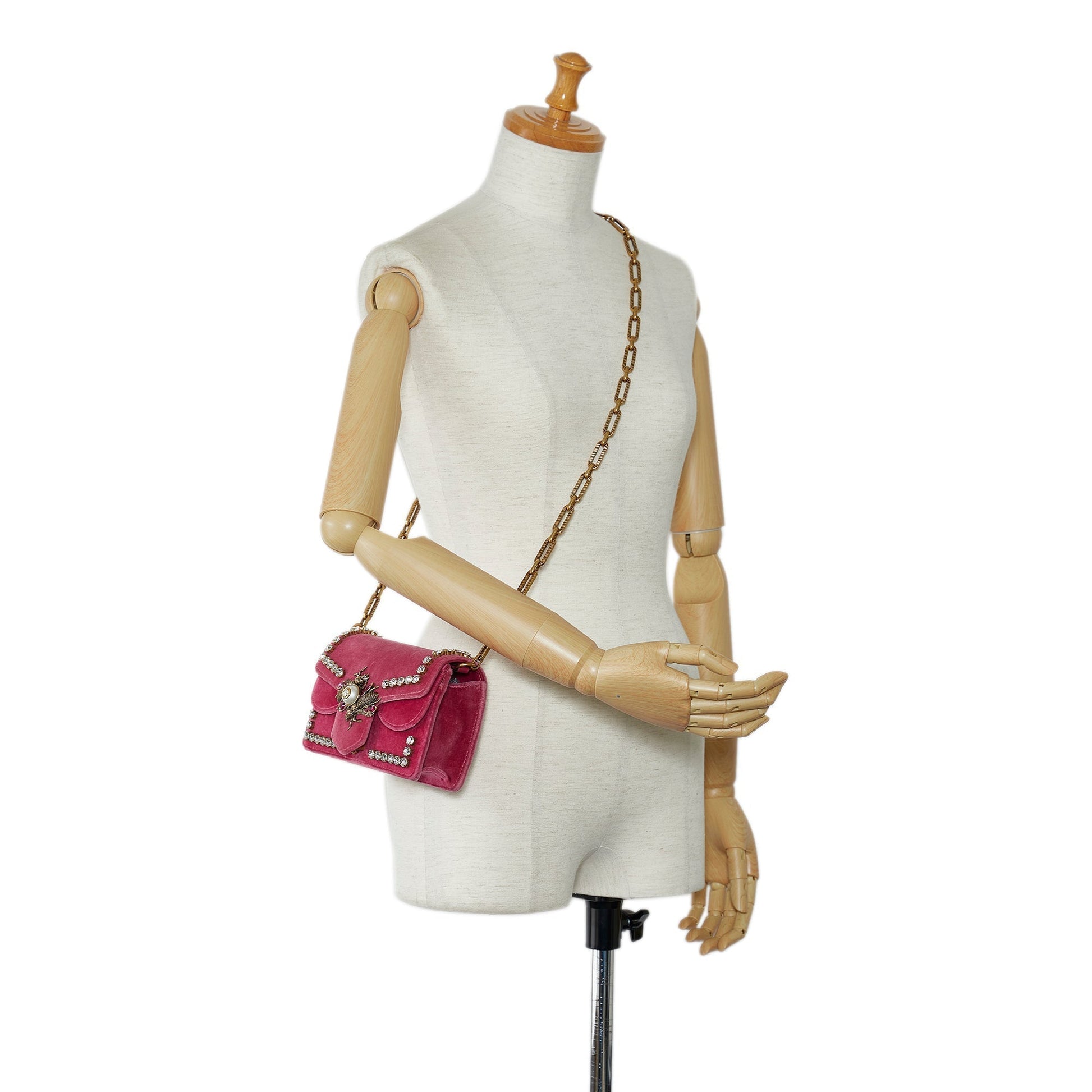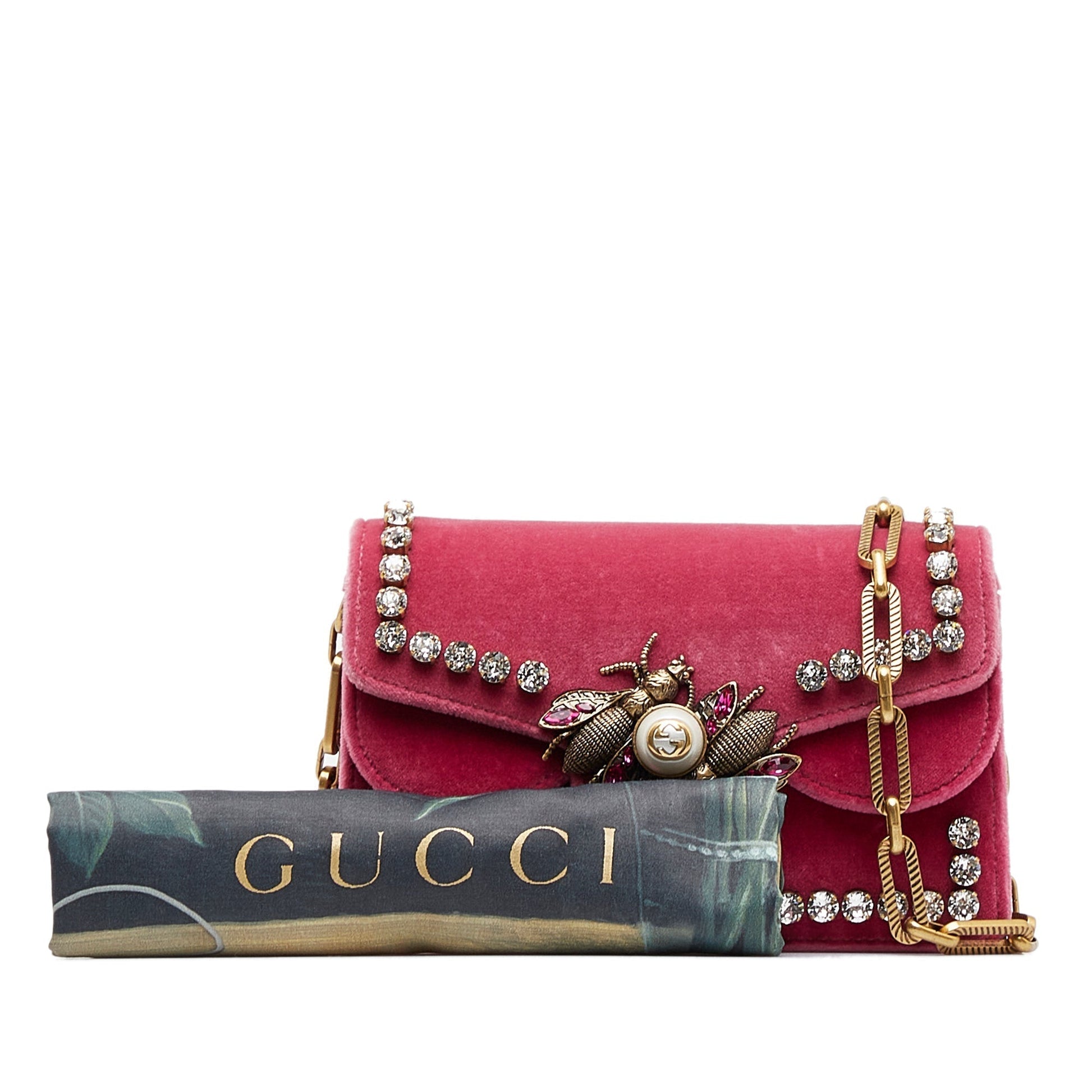 This crossbody bag features a velvet body with studs, a metal bee detail, a chain strap, a top flap with a magnetic snap button closure, and an interior slip pocket. Comes with dust bag