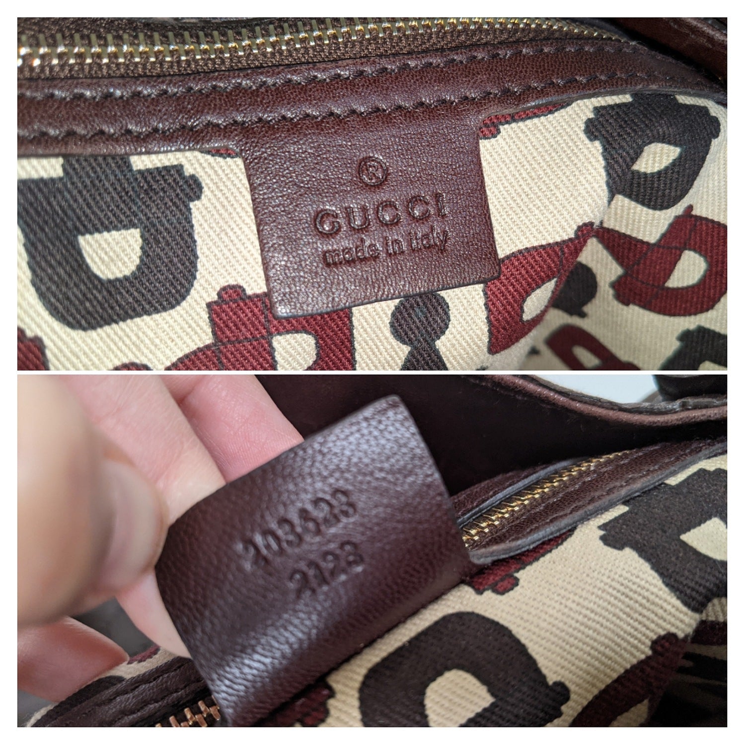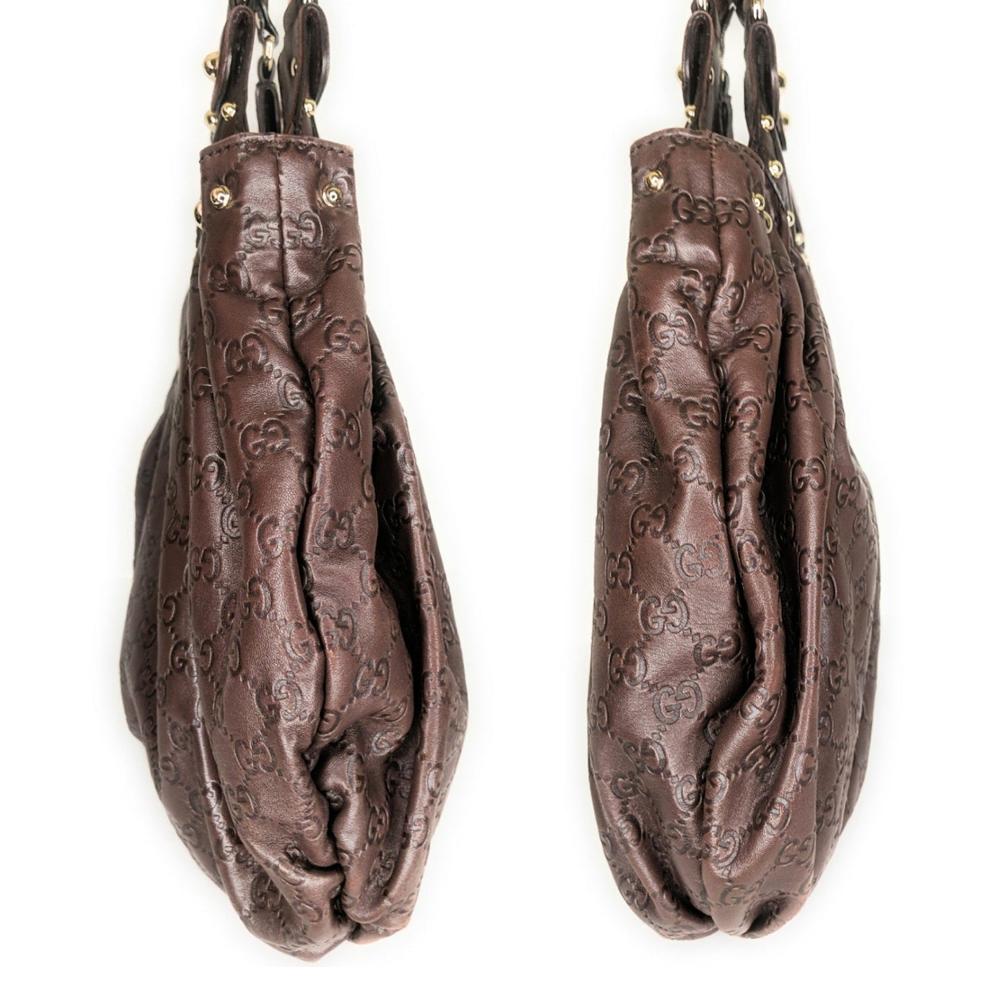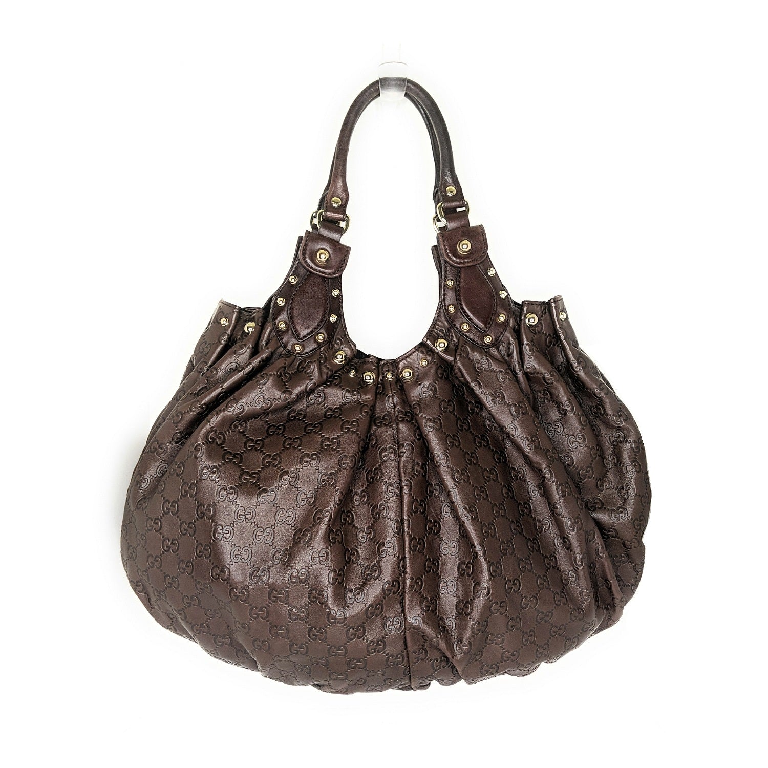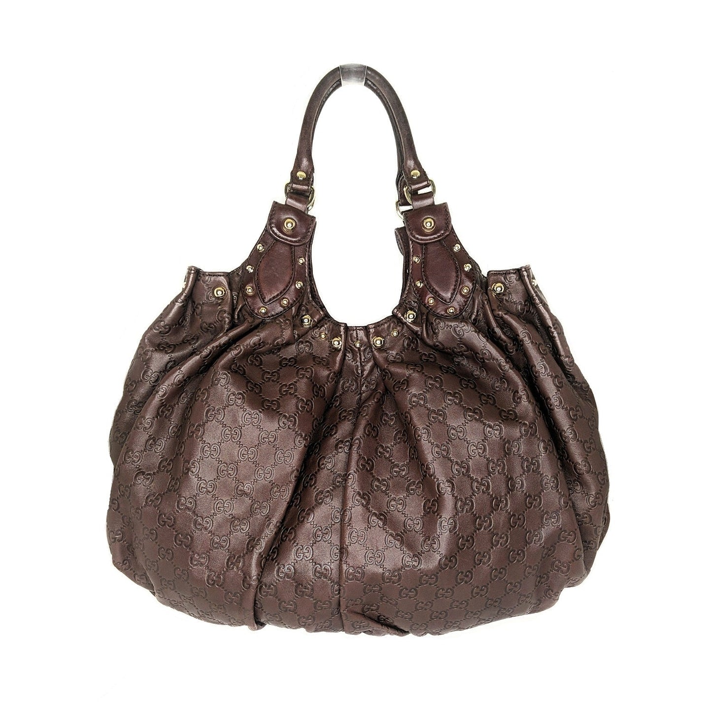 Gucci Studded Pelham Brown Tote features a chic design with gorgeous pleated and studded details on gorgeous and supple Gucci monogram embossed leather. The bag features studs on the top trim with rolled leather top handles. This opens to a fabric interior. Its roomy interior is perfect for holding all your daily essentials in style from Gucci!