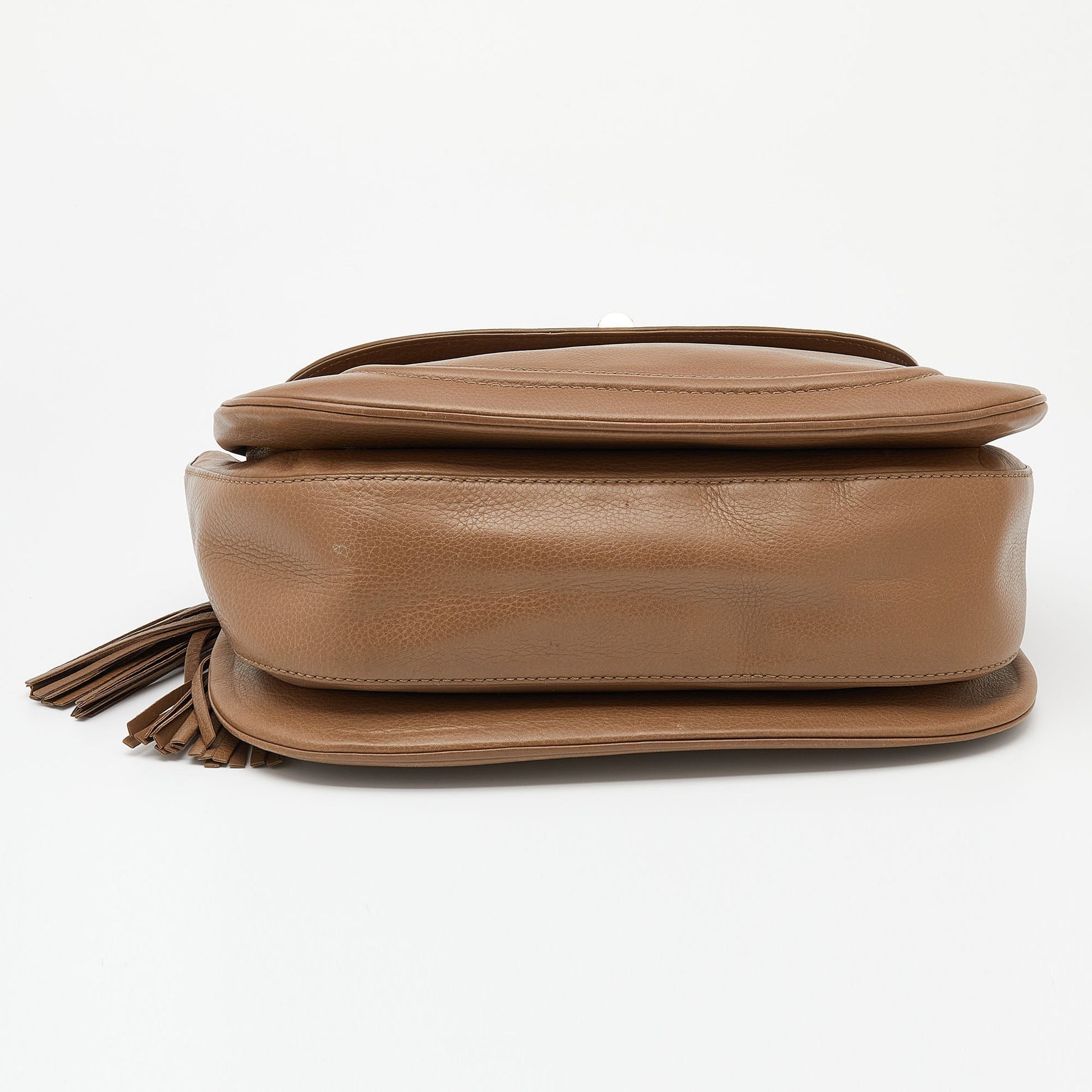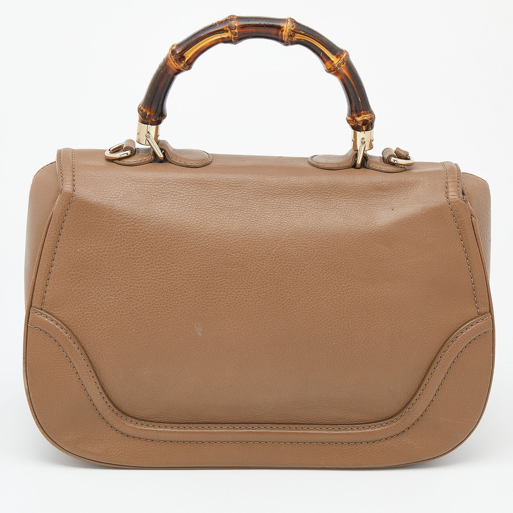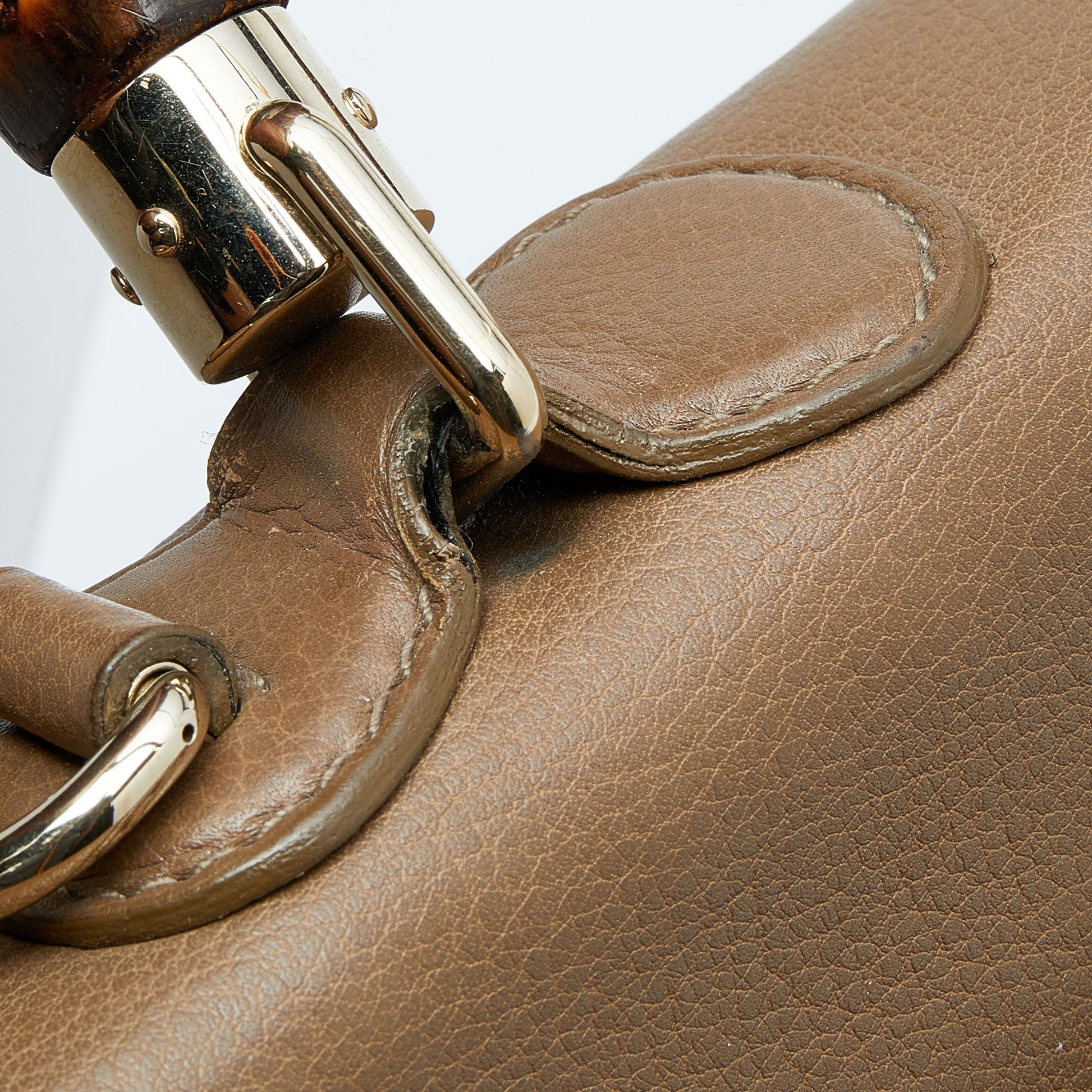 This bag from the House of Gucci is attractive sturdy and practical for everyday use. It is crafted using brown leather and showcases a Bamboo motif top handle. It is adorned with tassel charms gold toned hardware and a suede lined interior. Own this superb Gucci creation today