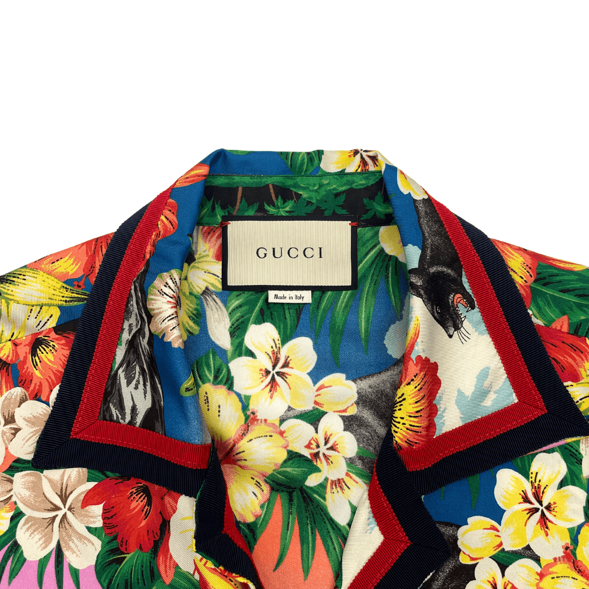 Gucci button-down shirt in silk with an allover multicolour hawaiian print and red, green and navy racing stripe trim.
