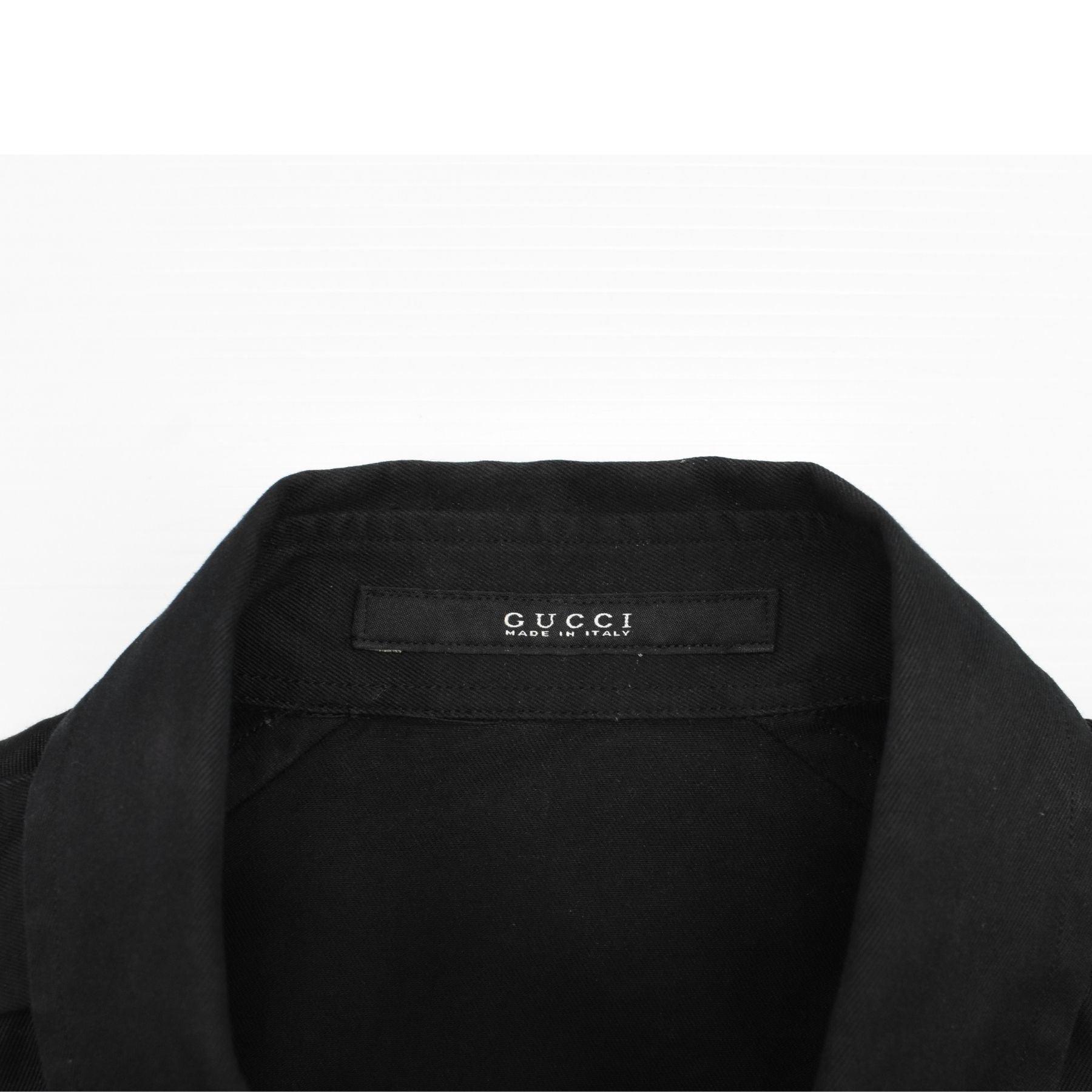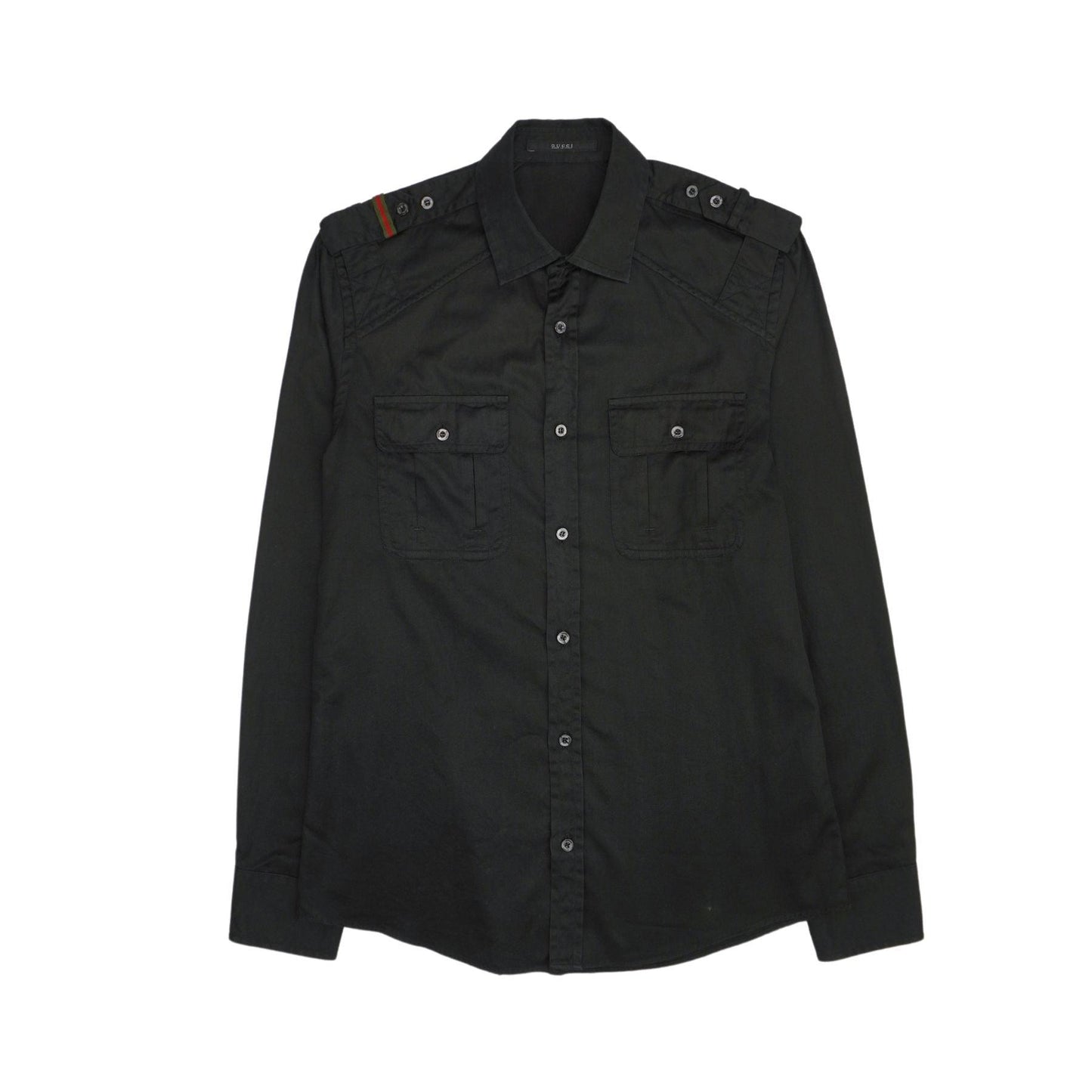 Gucci button-down shirt in black cotton with a racing stripe detail on the shoulder, large front pockets, and grey pearlescent buttons.