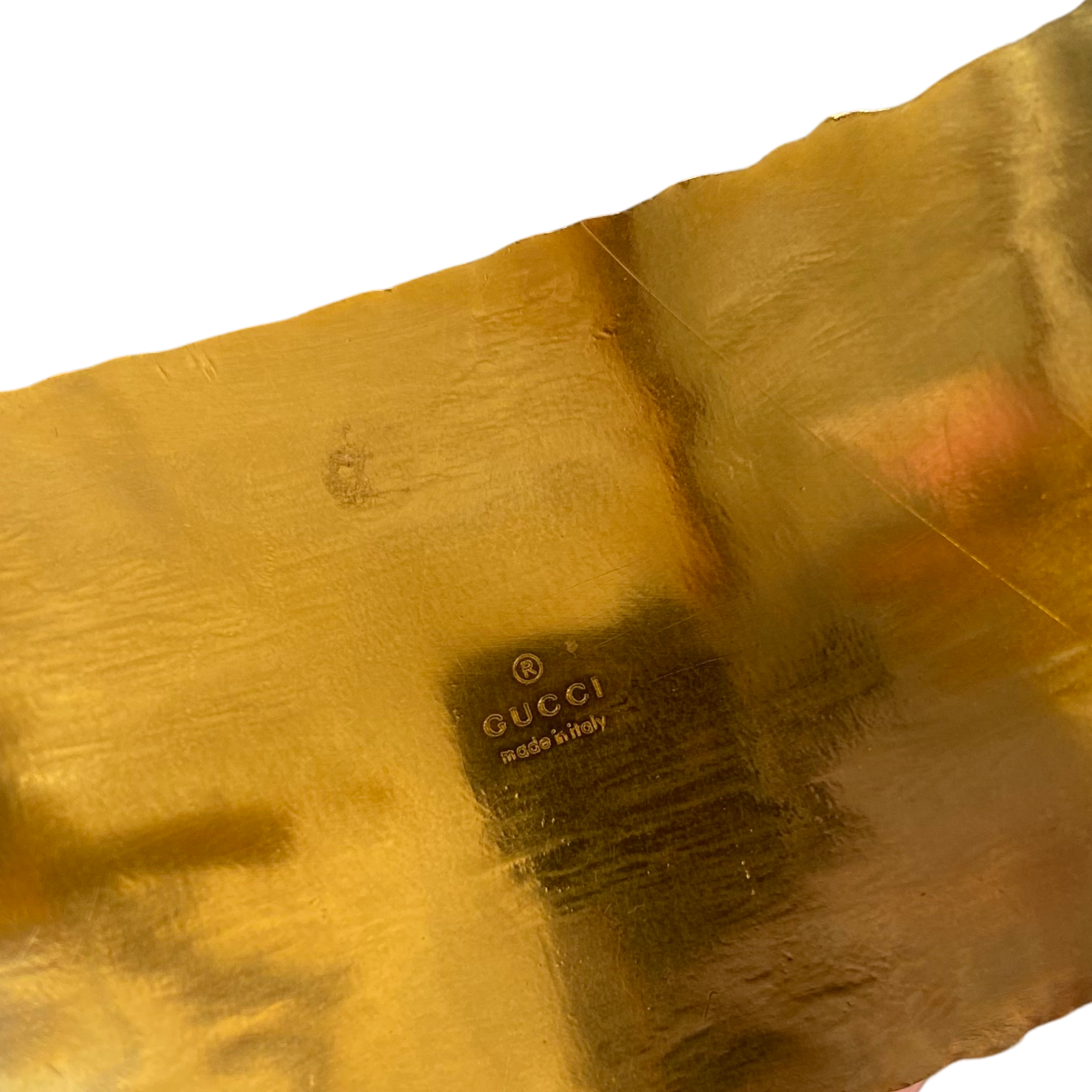 Gucci gold-tone wide cuff bracelet in textured metal with multicolour cabochon stones and GG logo on one side.