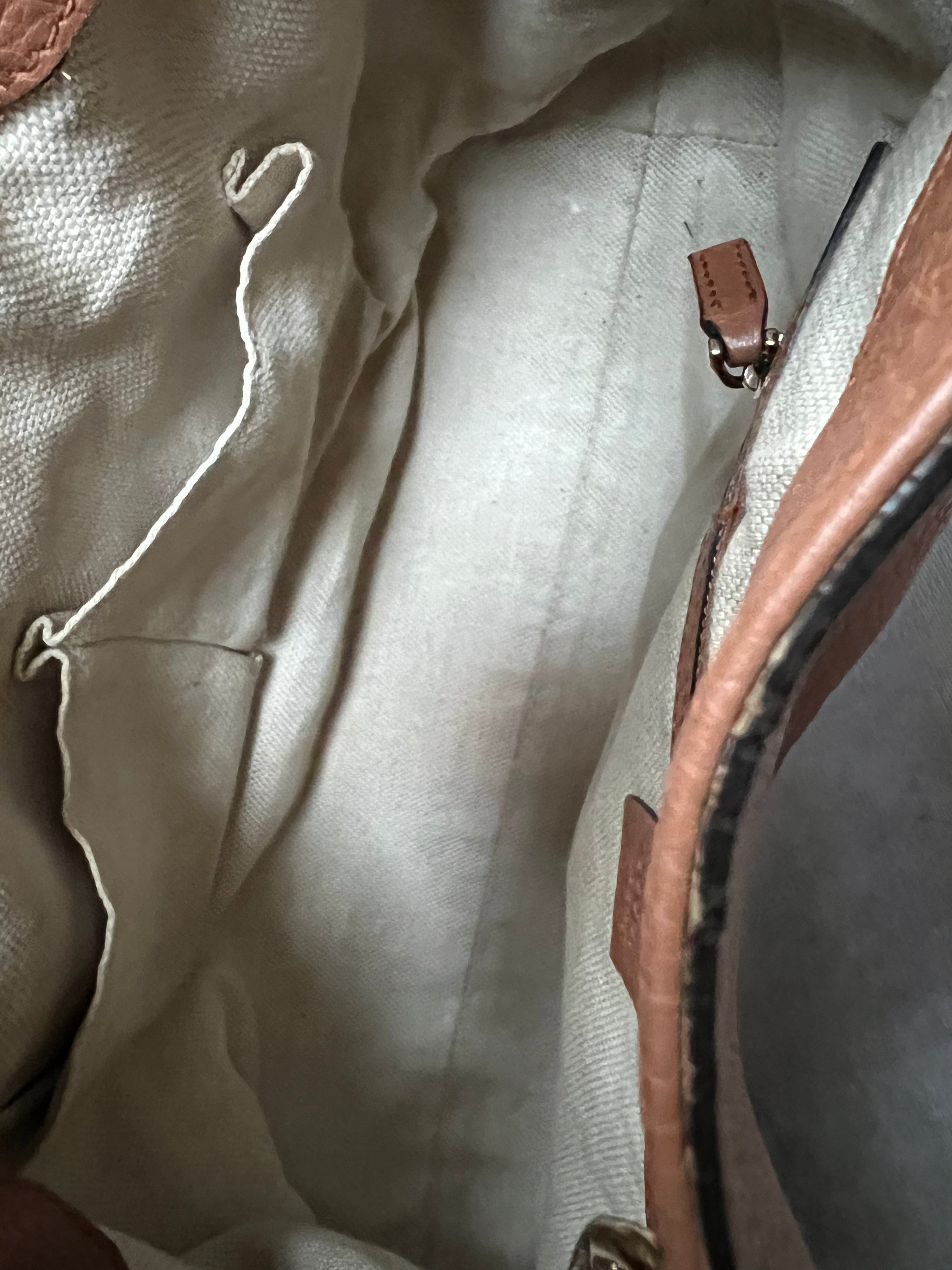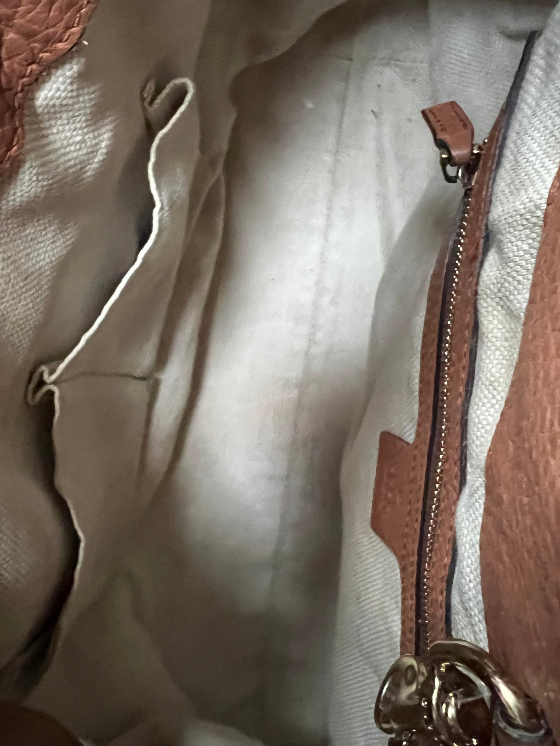 Gucci Soho Chain Tote in Brown Grained Leather with pale gold hardware. This roomy tote features chain straps with leather sections and is ideal for day to day use. Can fit comfortably over the shoulder or can be carried in the crook of the arm. Roomy in size and somewhat slouchy in shape. Lovely brown caramel shade.
