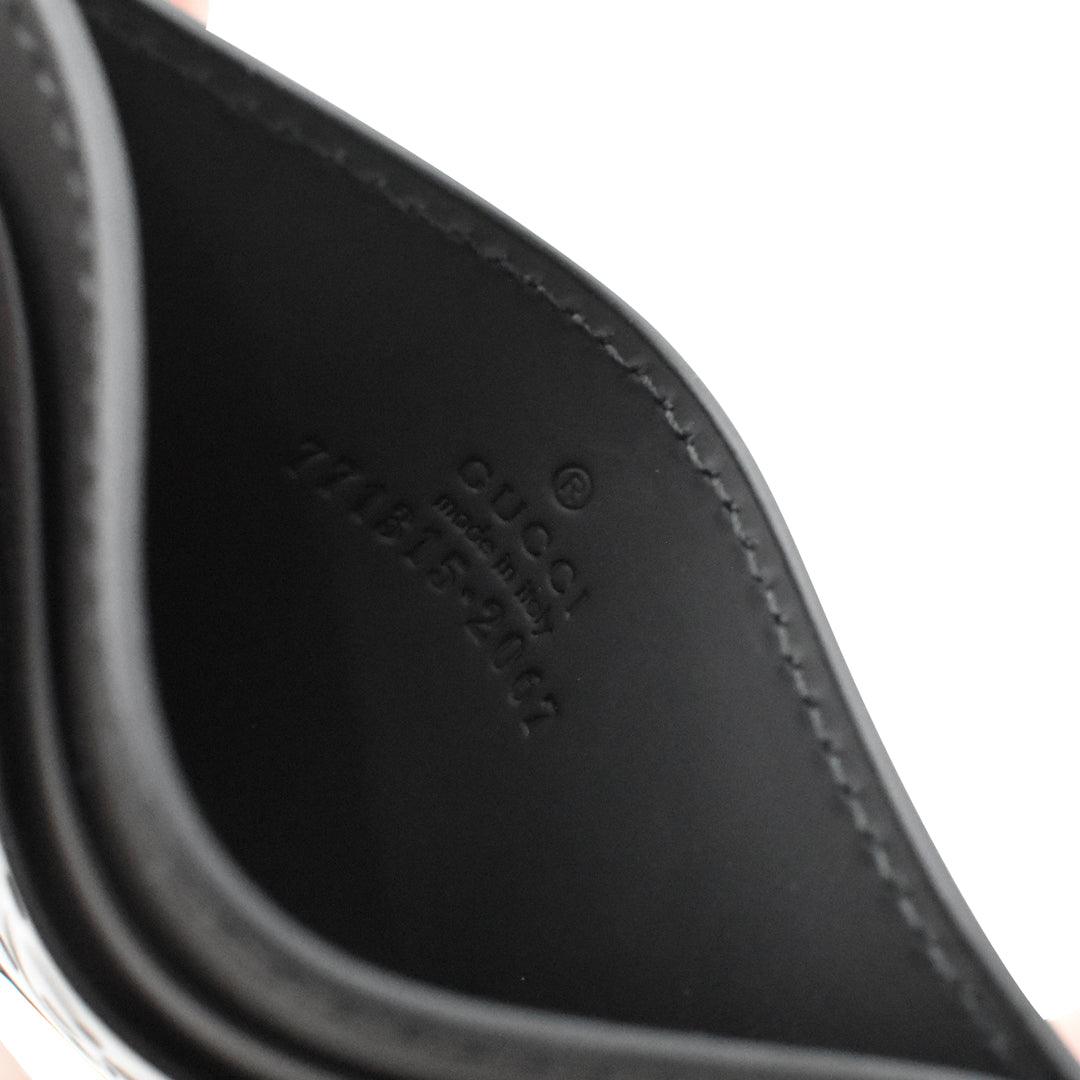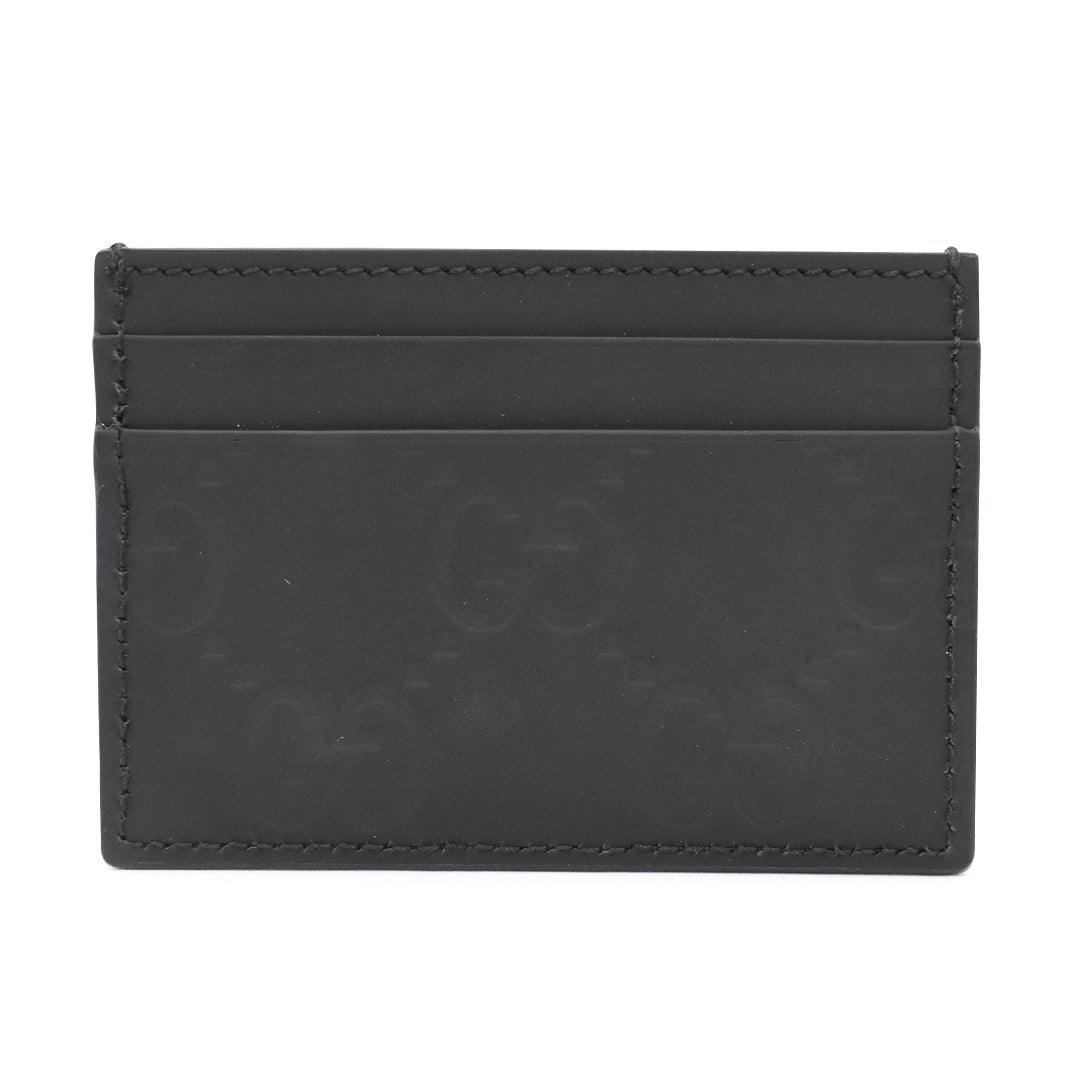 Gucci cardholder wallet in matte black monogram embossed leather with five card slots.