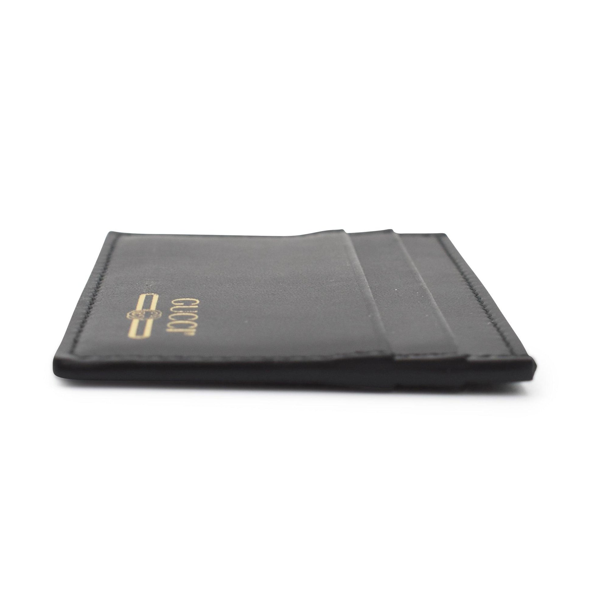 Gucci card holder wallet in black smooth leather with a gold embossed vintage logo.