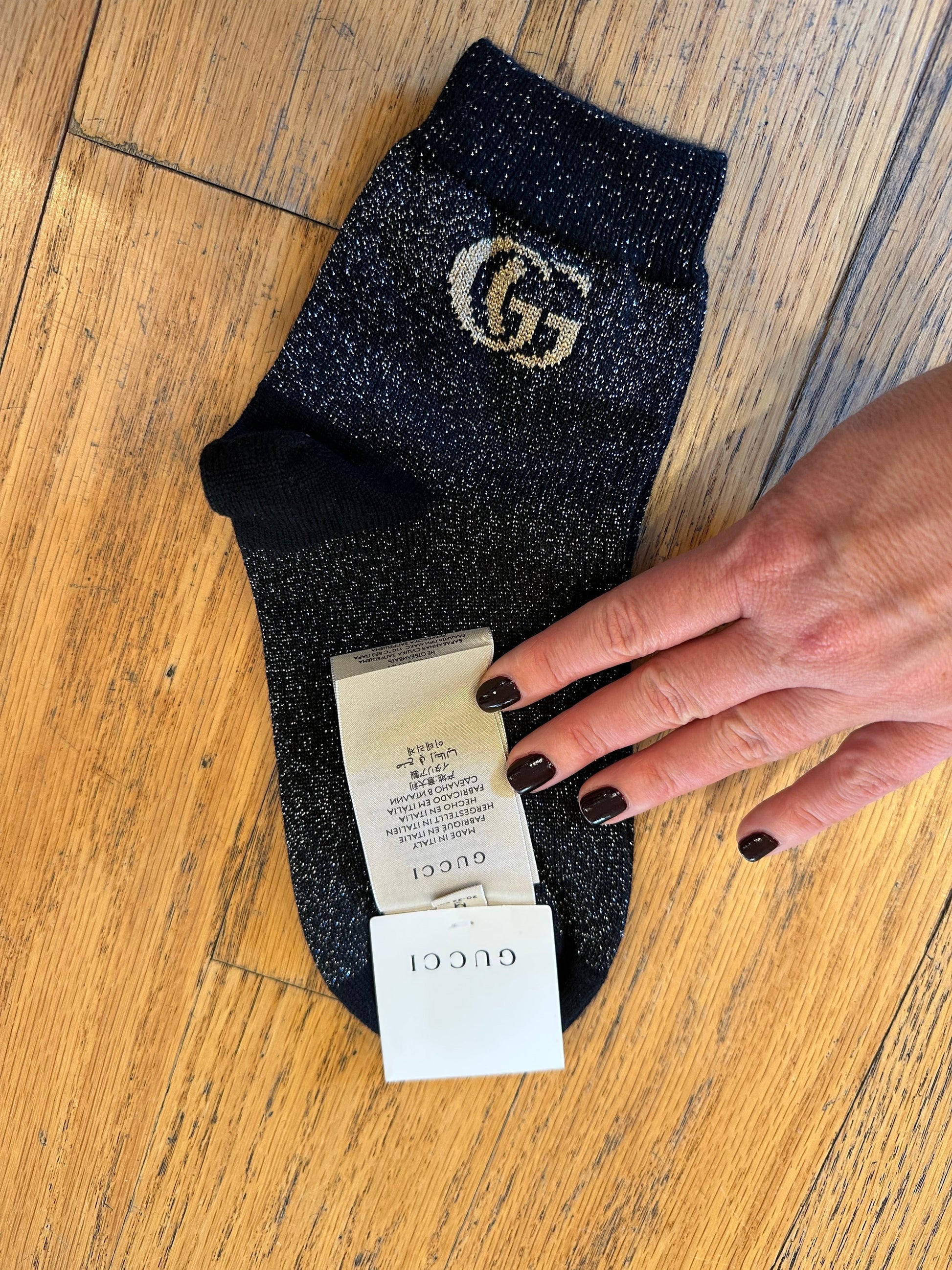 Add some pep and funk to your feet with these Gucci ankle socks. TheGold threading in the interlocking GG gives a touch of sparkle. Shine on with these socks! Perfect for giving the gift to a loved one or set gifting!