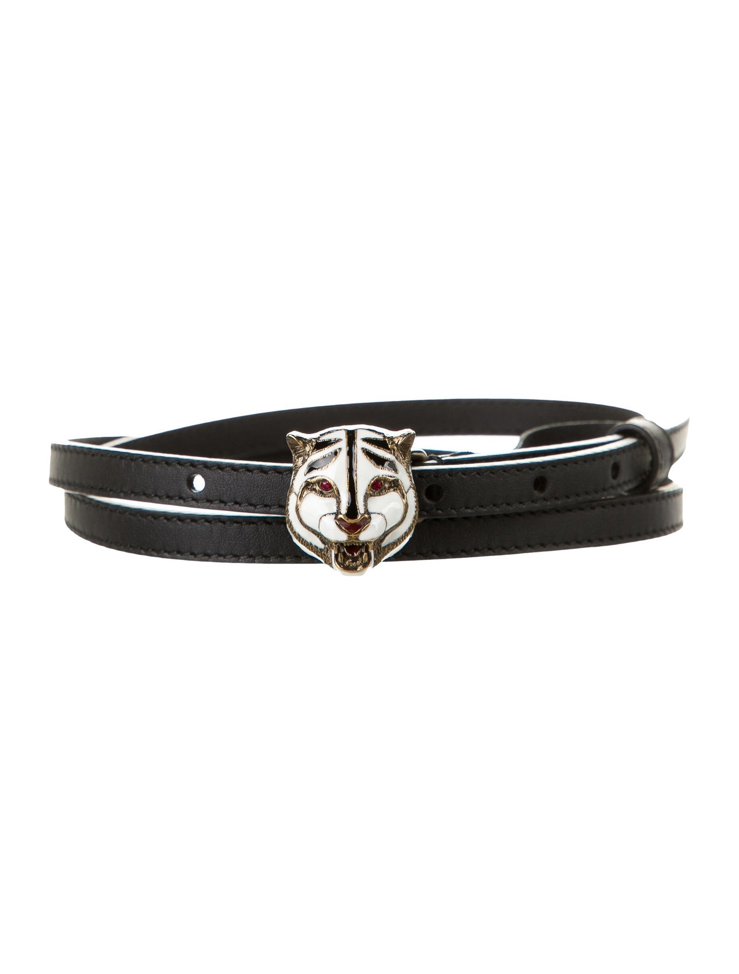 The Gucci Ceramic Tiger Clasp Belt in Black is a classic style black leather adjustable belt. A white ceramic tiger head with gold and black detailing sits at the clasp, which is fastened with a pin in hole style closure.