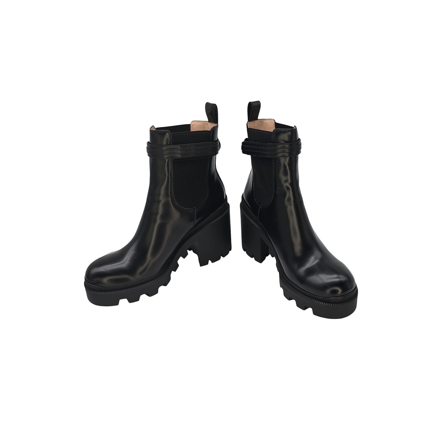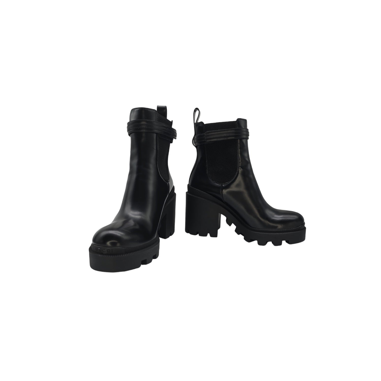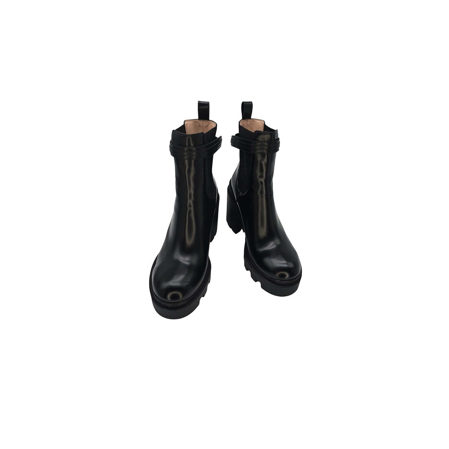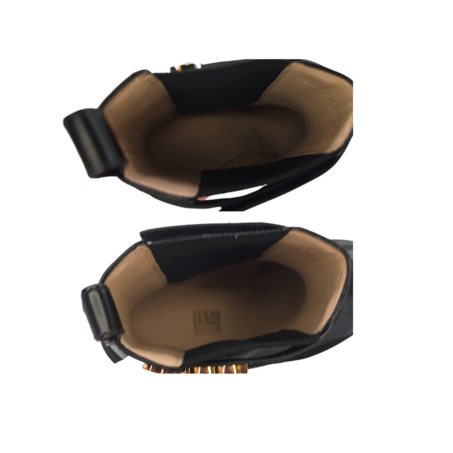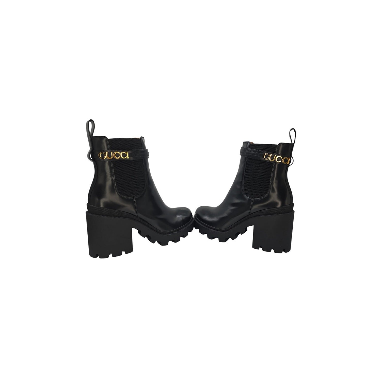Exude sophistication and style with these Gucci Chelsea High Heel Boots. Crafted with luxurious leather, these ankle boots feature a black leather strap embellished with a gold tone Gucci logo. The round toe and 2.75 inch heel add a touch of elegance to any outfit. Made in Italy, these boots come with their own original box, dust bags, and literature. Elevate your wardrobe with these timeless, designer boots.