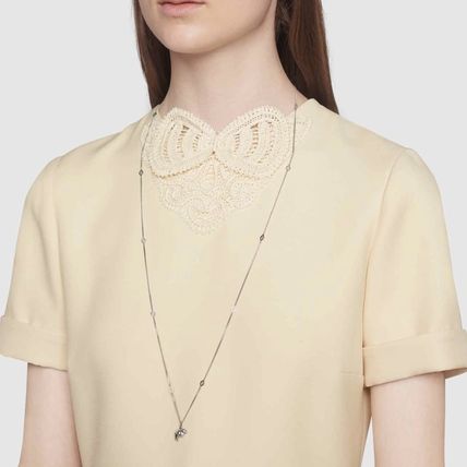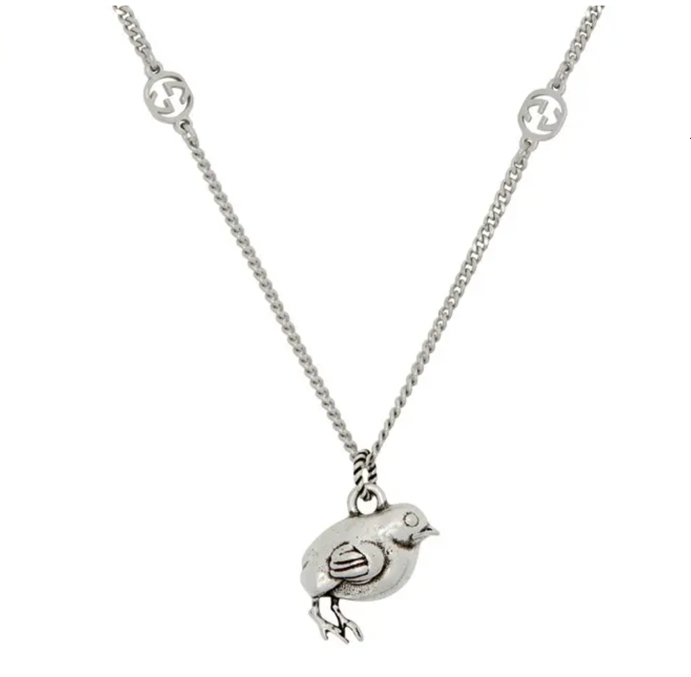 TheGucci Chick Motif Necklace in Silver is crafted from a sterling silver in Italy. This necklace features a cute chick charm hanging from a long style necklace that has intermittent interlocking GG logos.