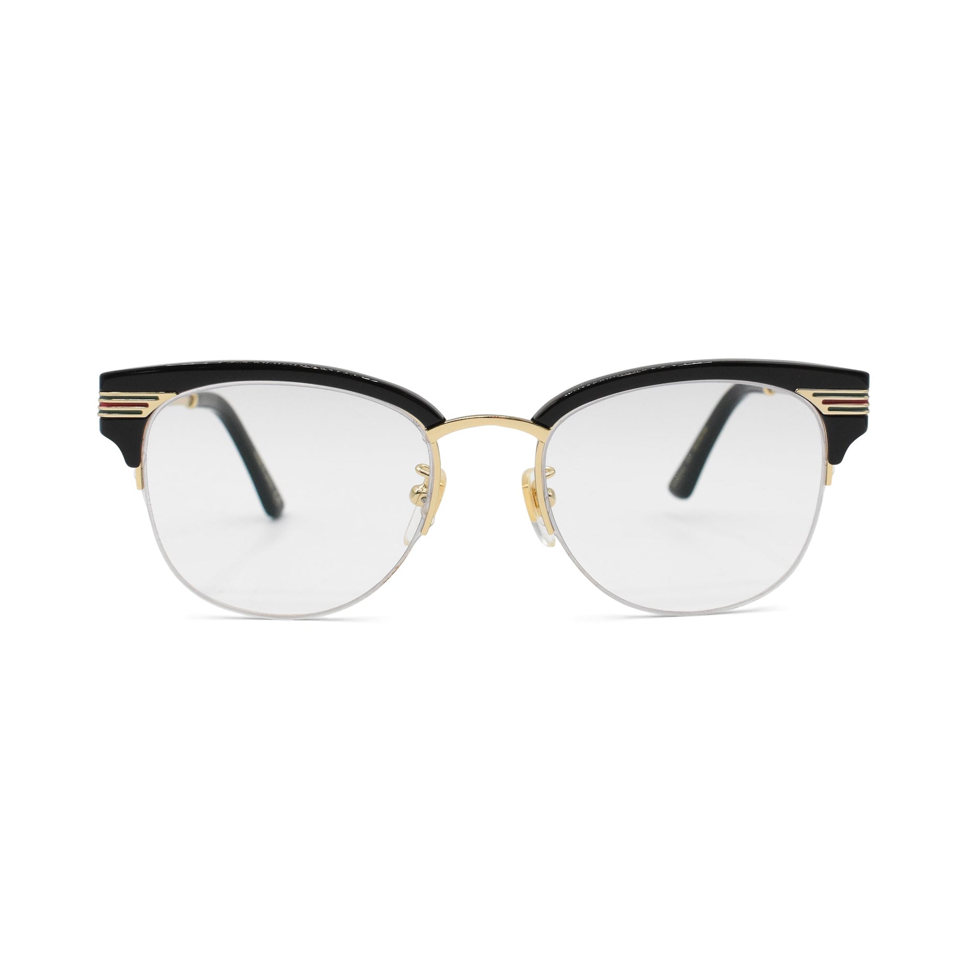 Gucci 'Clubmaster' half frame eye glasses in black acetate with gold arms and red-green racing stripe detailing. Feature clear non prescription lenses.