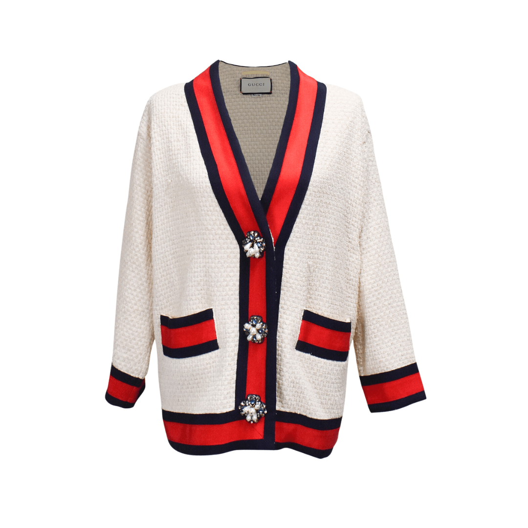 Gucci cardigan in cream tweed cotton with red/navy trim and beaded button details.