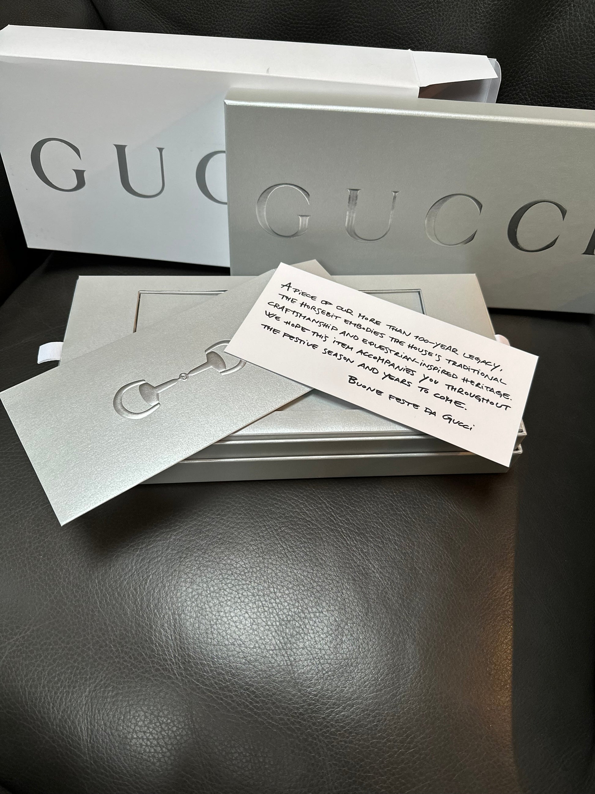 This Gucci Card Case comes in a limited edition gift box with oversized playing cards, making it the perfect hostess gift. The luxurious horsebit design adds a touch of sophistication, while the oversized playing cards offer a unique and playful twist on traditional card games. Elevate your gift-giving game with this stylish and practical accessory.