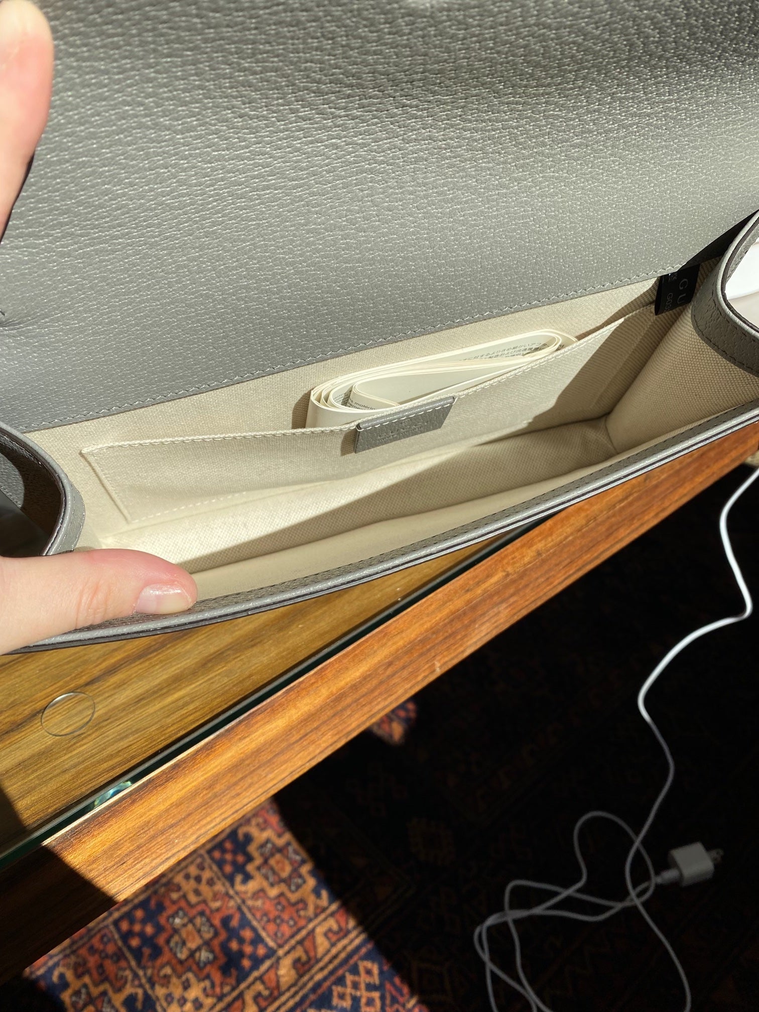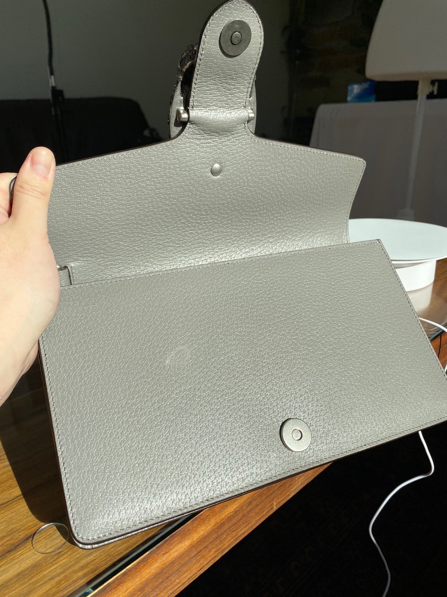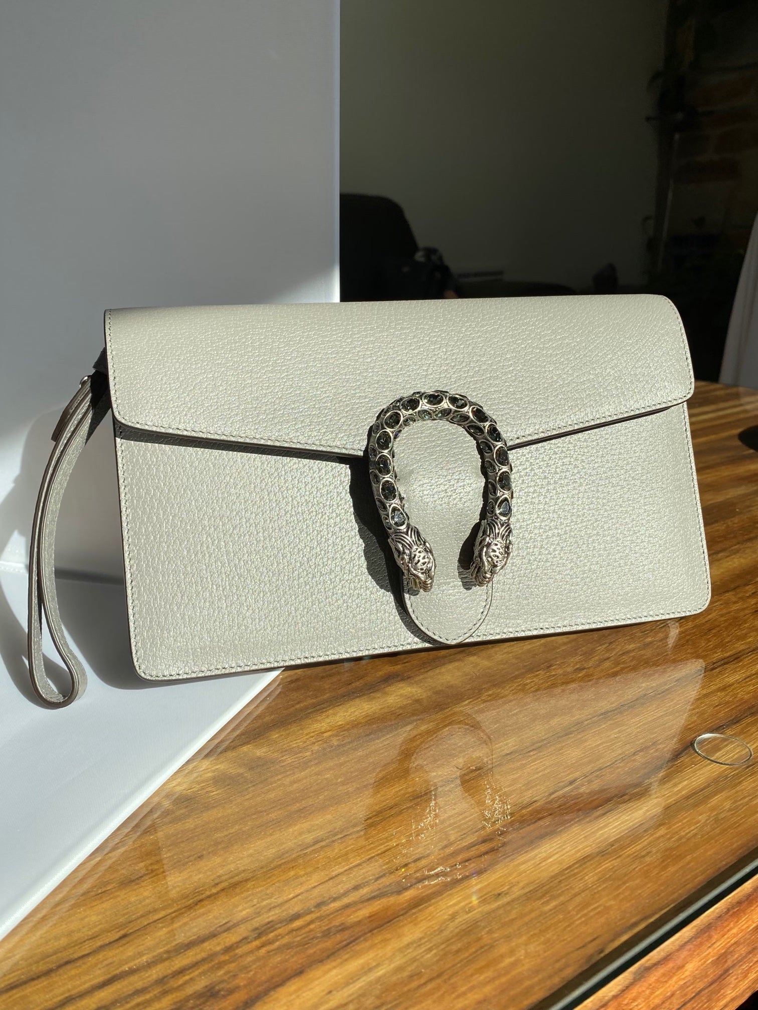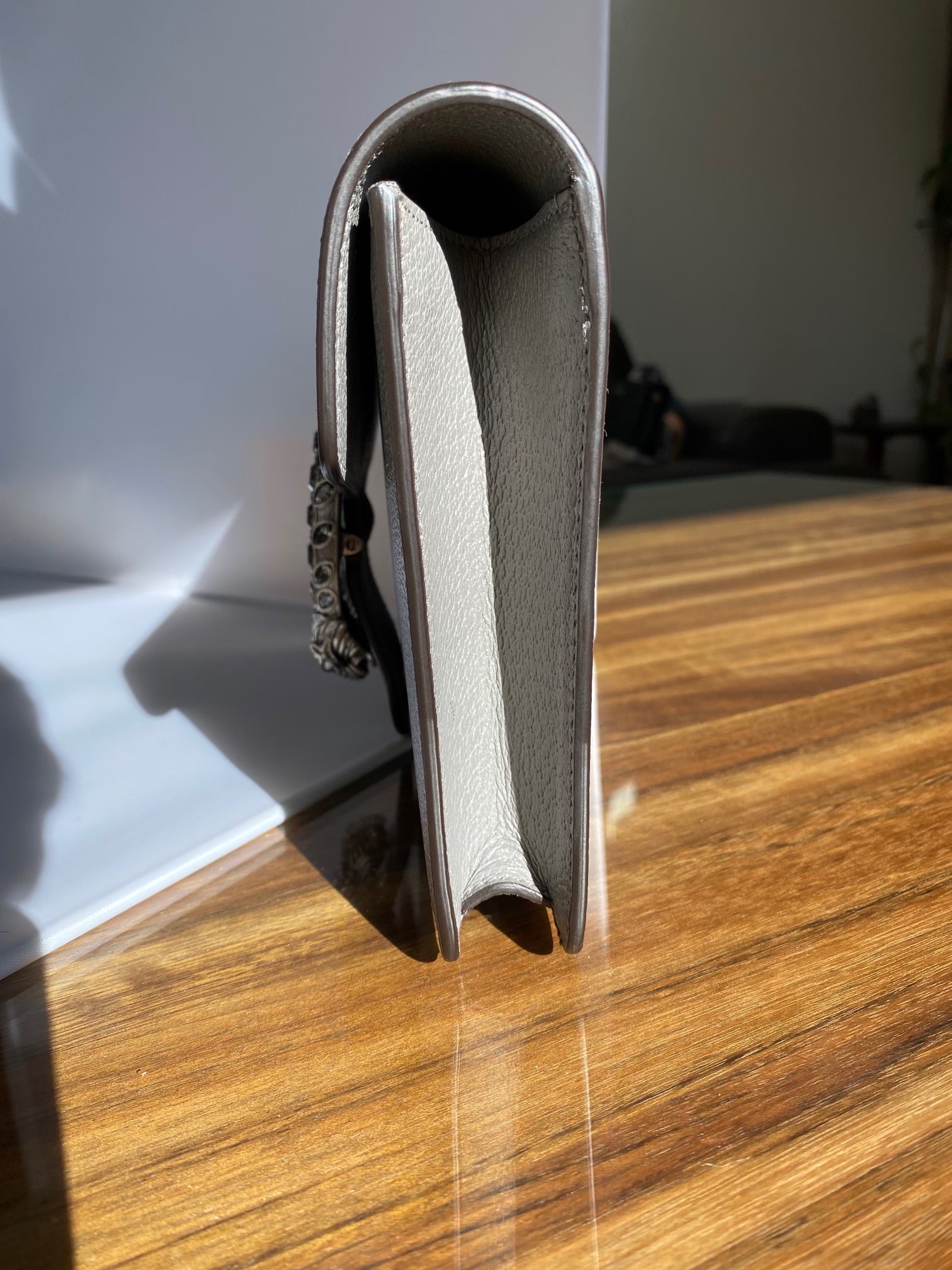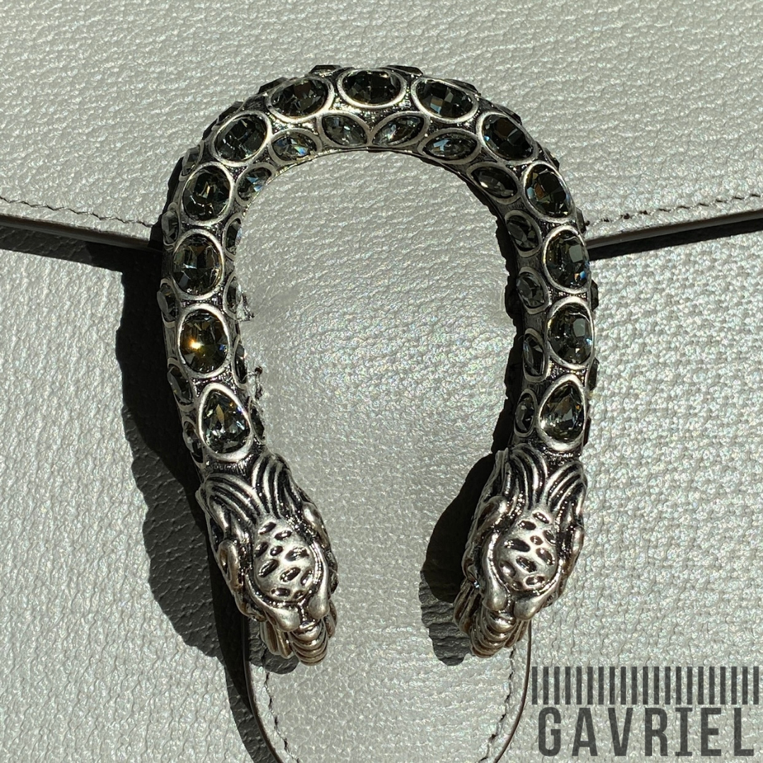 Gucci Dionysus LeatherPurse inGray is crafted from texturedblack leather. The envelope-style shape is finished with a detachable wrist strap and the lines defining tiger head closurea reference to the Greek god Dionysusencrusted with sparkling crystals. The Dionysus clutch was introduced for Spring 2020 in a folded flap design.