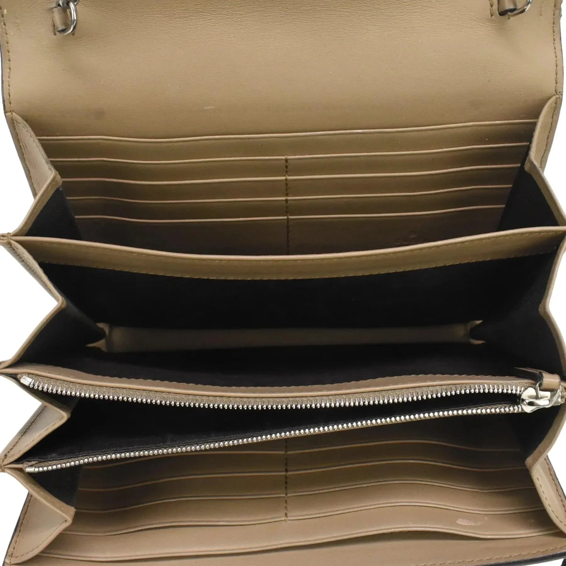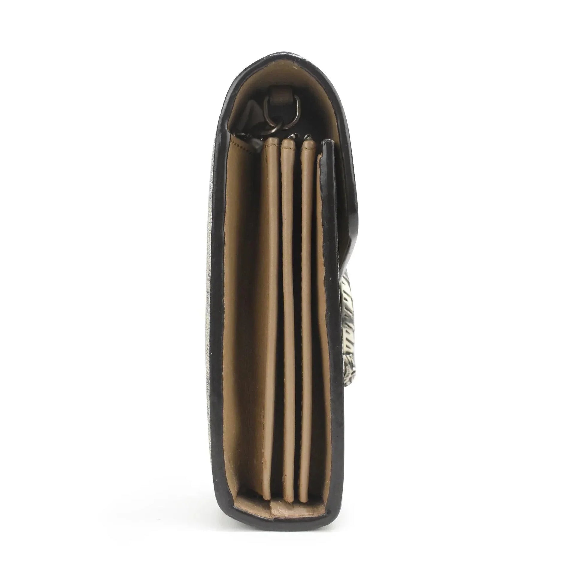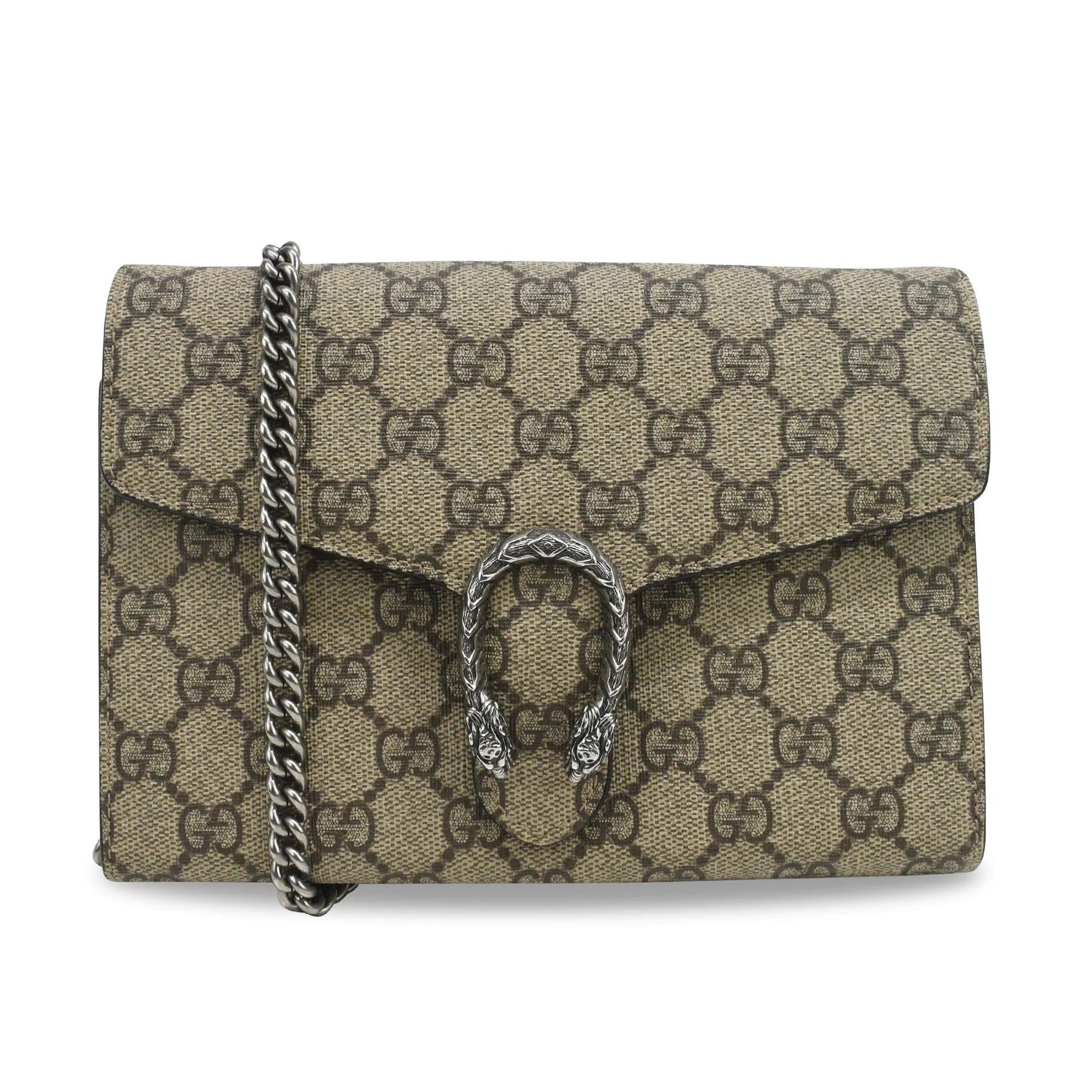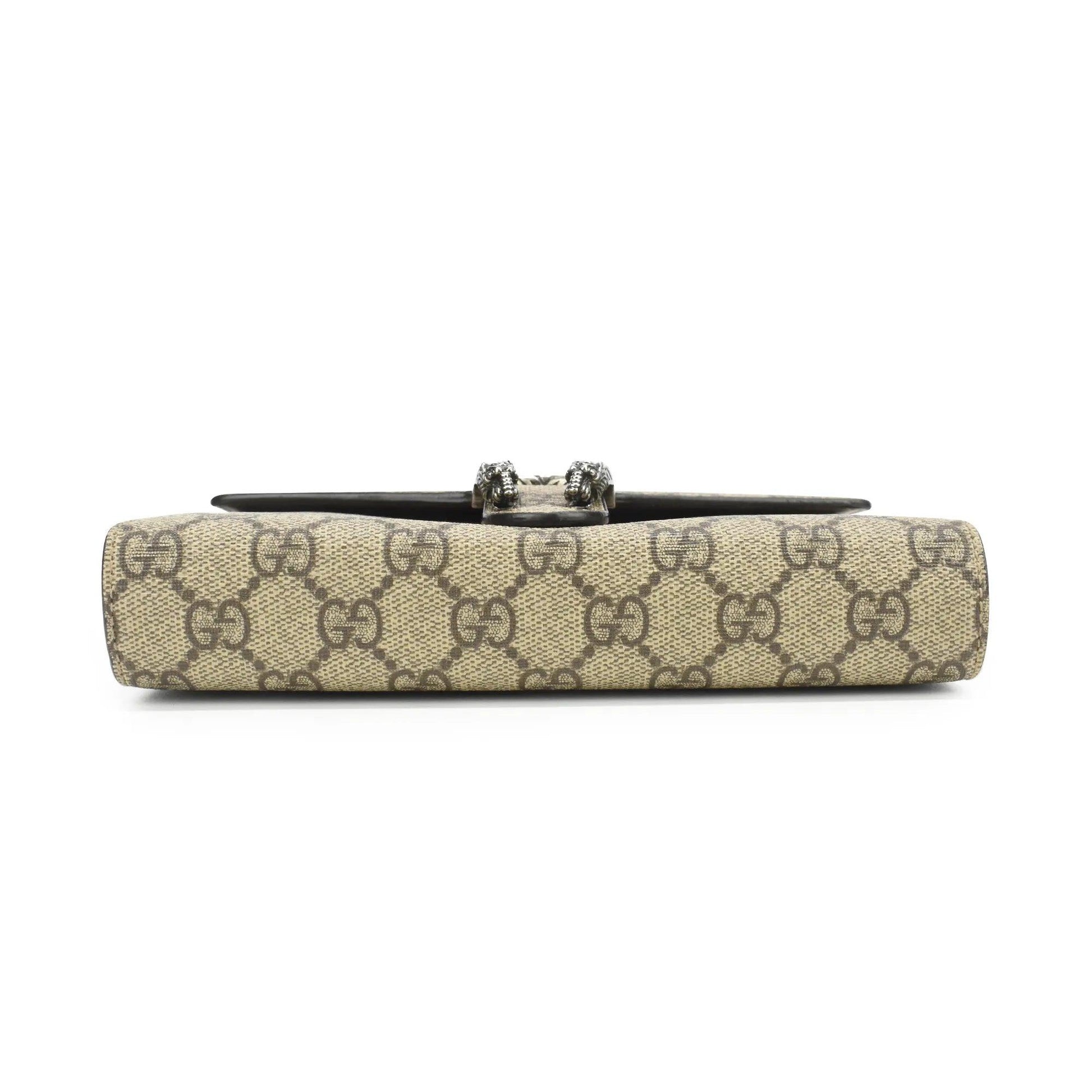 Gucci 'Dionysus' wallet on chain in beige and brown monogram coated canvas with aged silver hardware and taupe leather gussets. Features a horseshoe dragon head buckle on the front flap concealing a snap button closure. The accordion style interior is lined with taupe leather and features 16 card slots, multiple cash pockets, and a zip pocket in the centre.