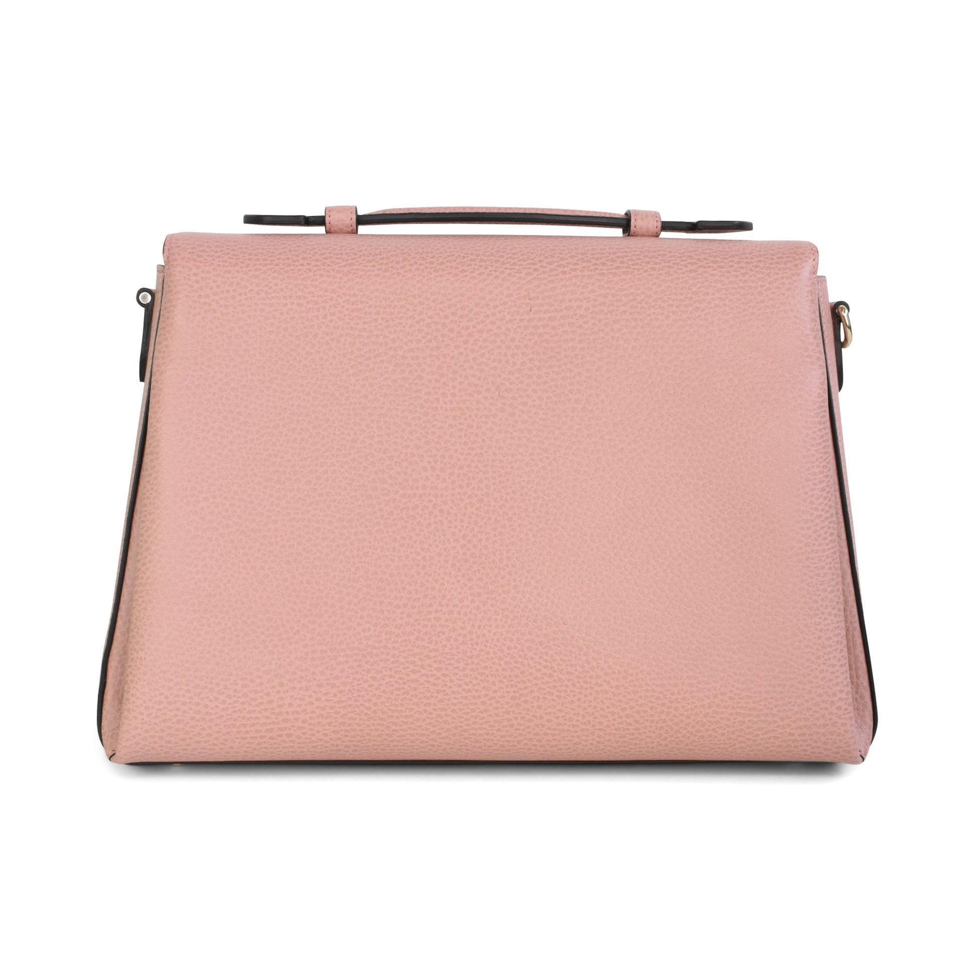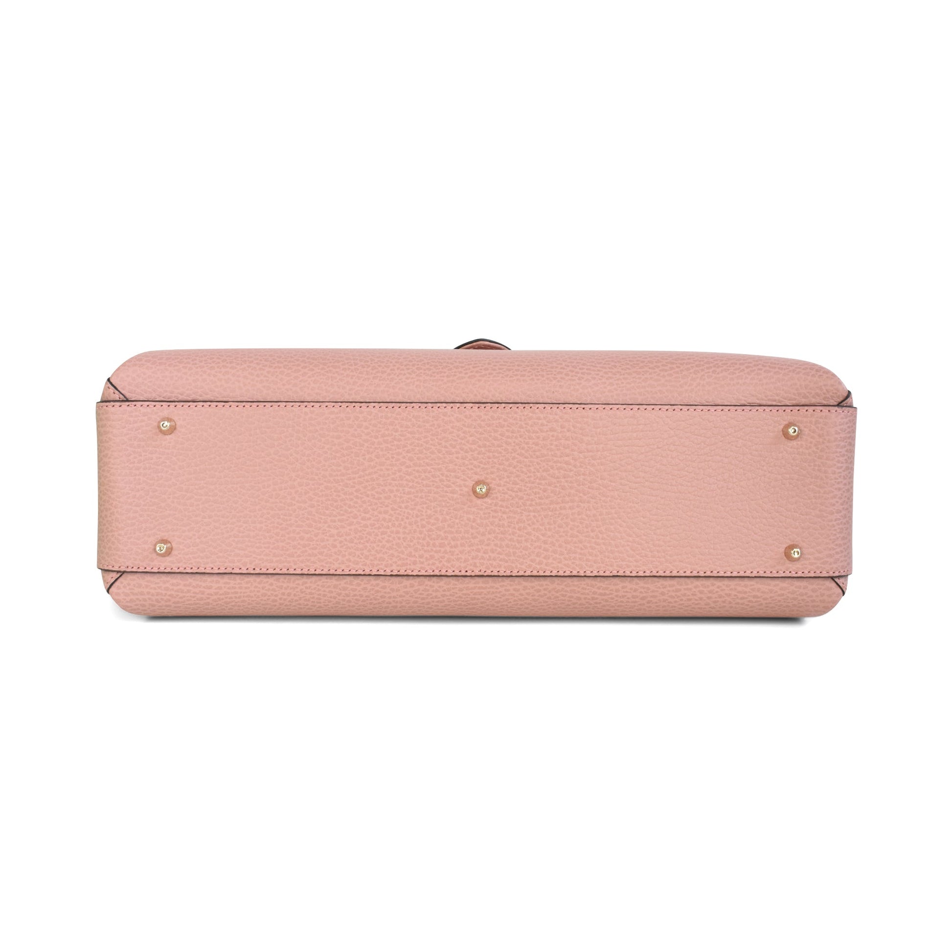 Gucci 'Dollar Interlocking' hand bag in pink pebbled leather with a top handle, a top-flap opening with an interlocking 'GG' buckle closure, and a beige canvas interior lining with dual compartments and both zip and slip pockets.