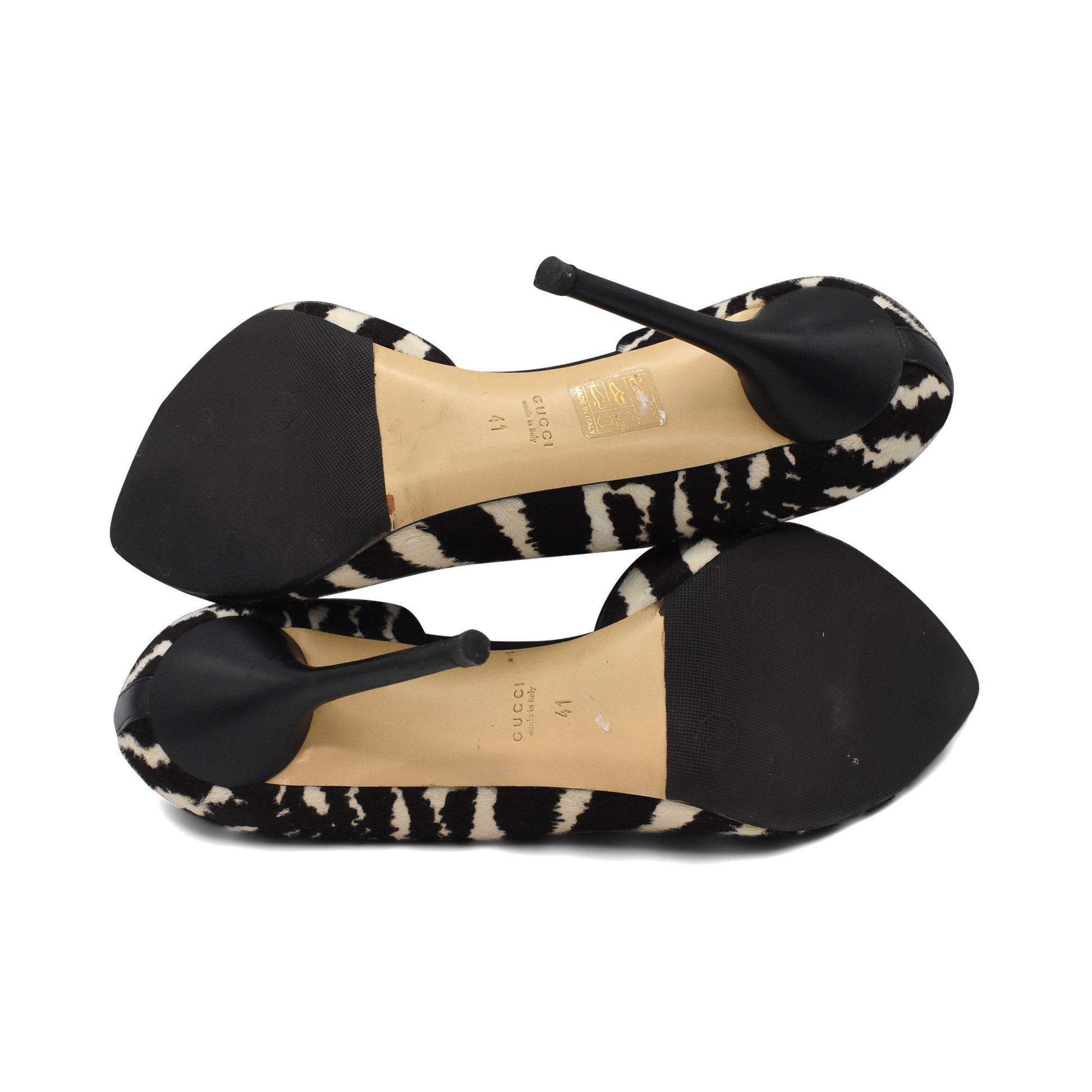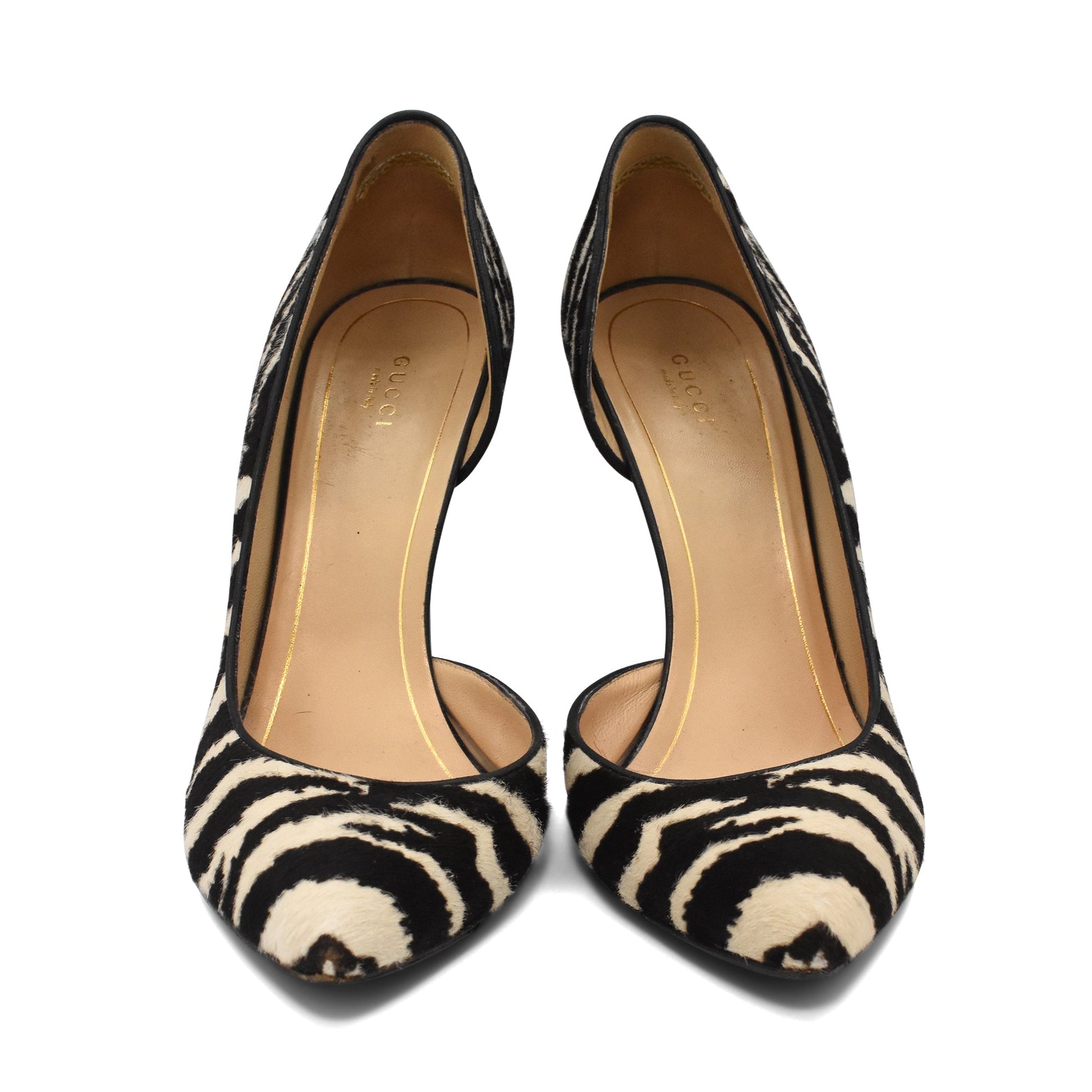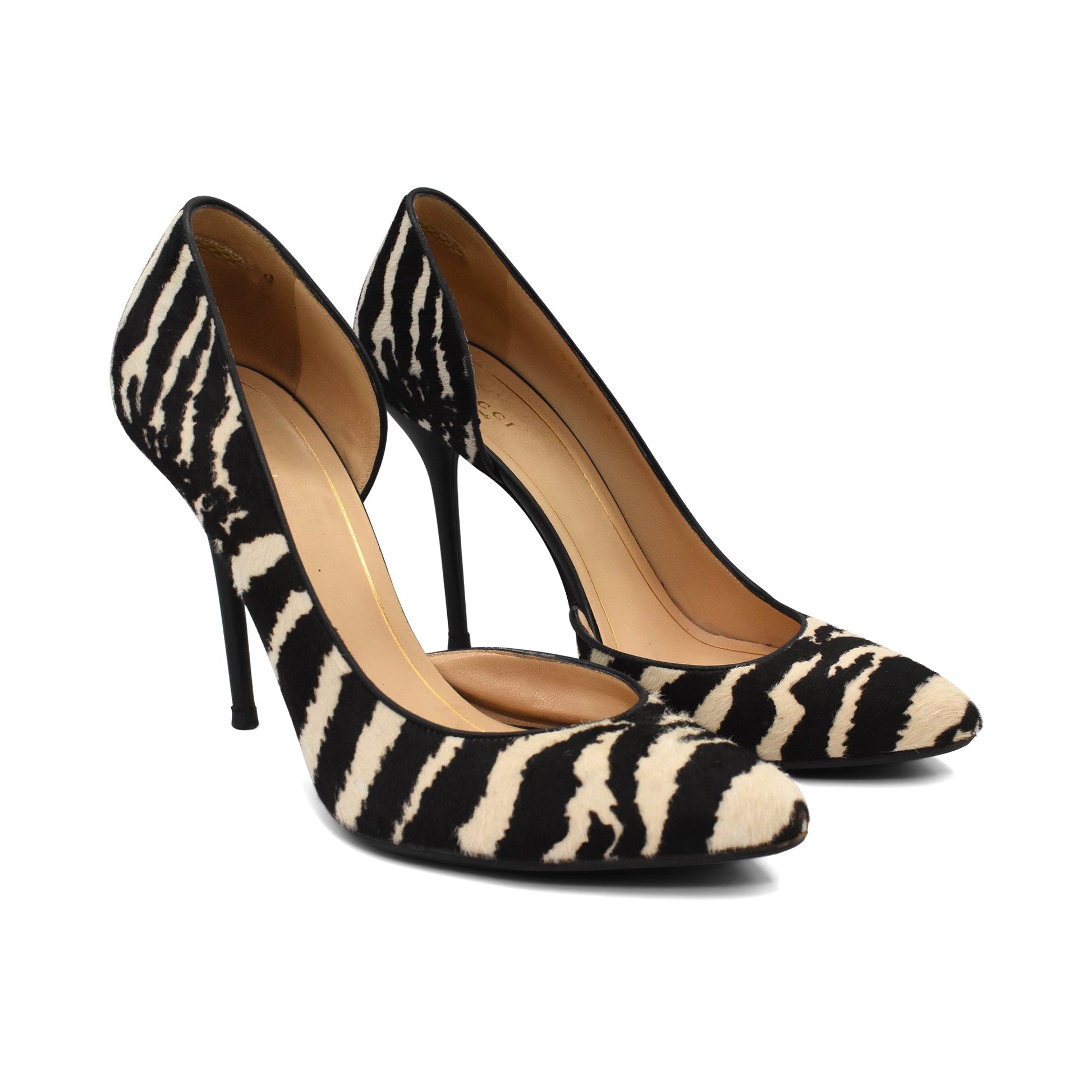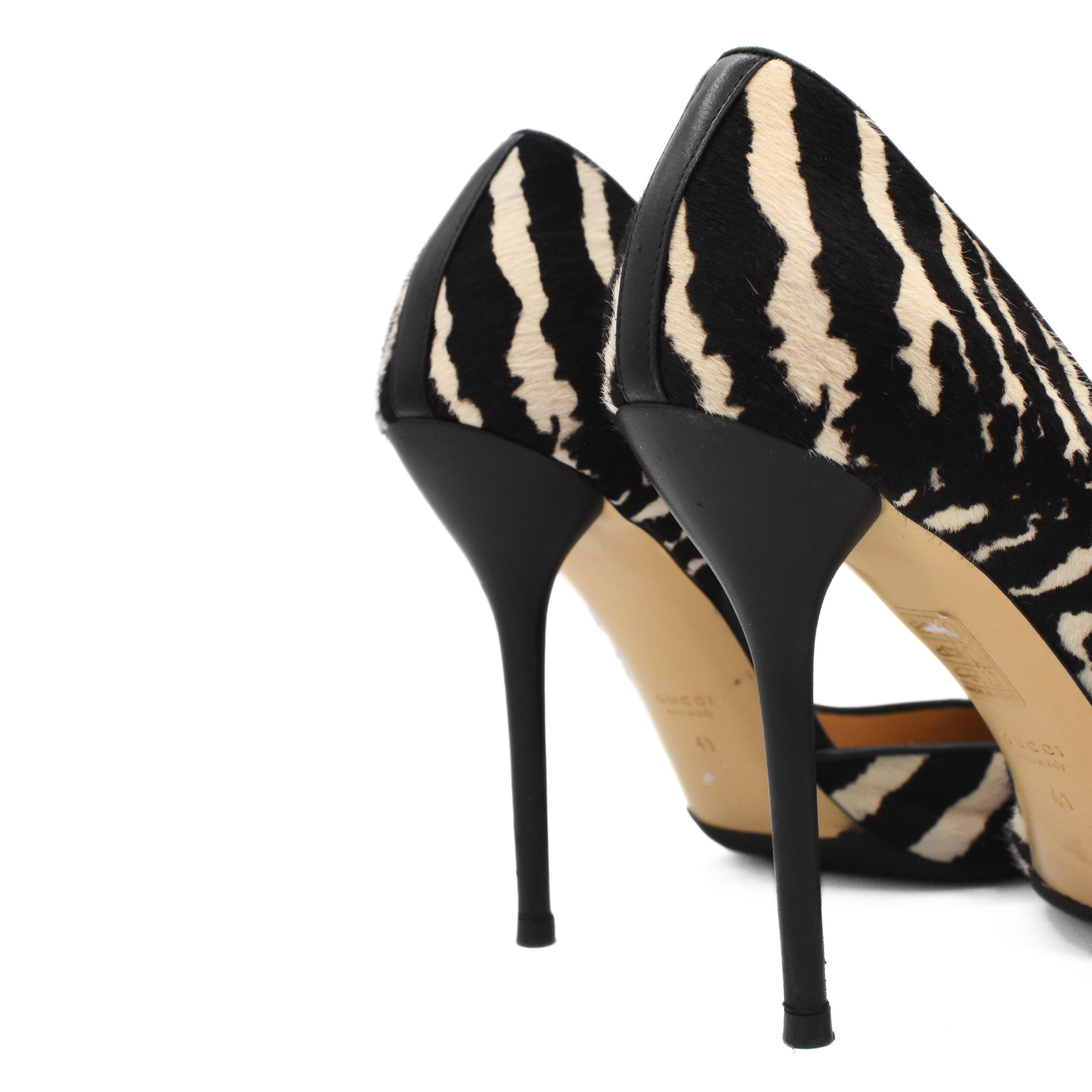 Gucci 'D'Orsay' heels in dark brown and white pony hair with zebra striping, a cut-out on the sides, a black leather heel, and a pointed toe.