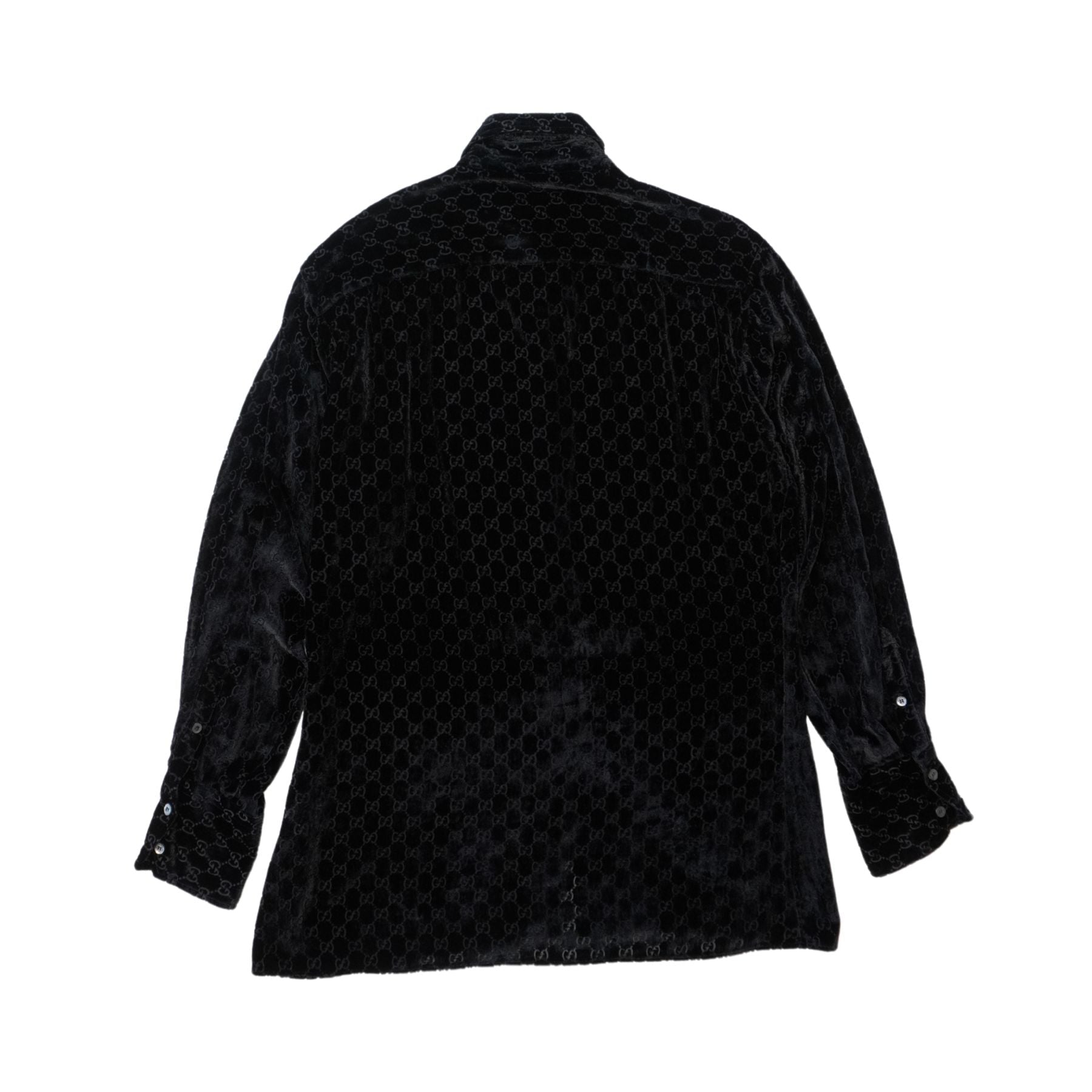 Gucci vintage oversized button-down shirt in black velvet with an all-over 'GG' monogram print, mother of pearl buttons, and a collar.