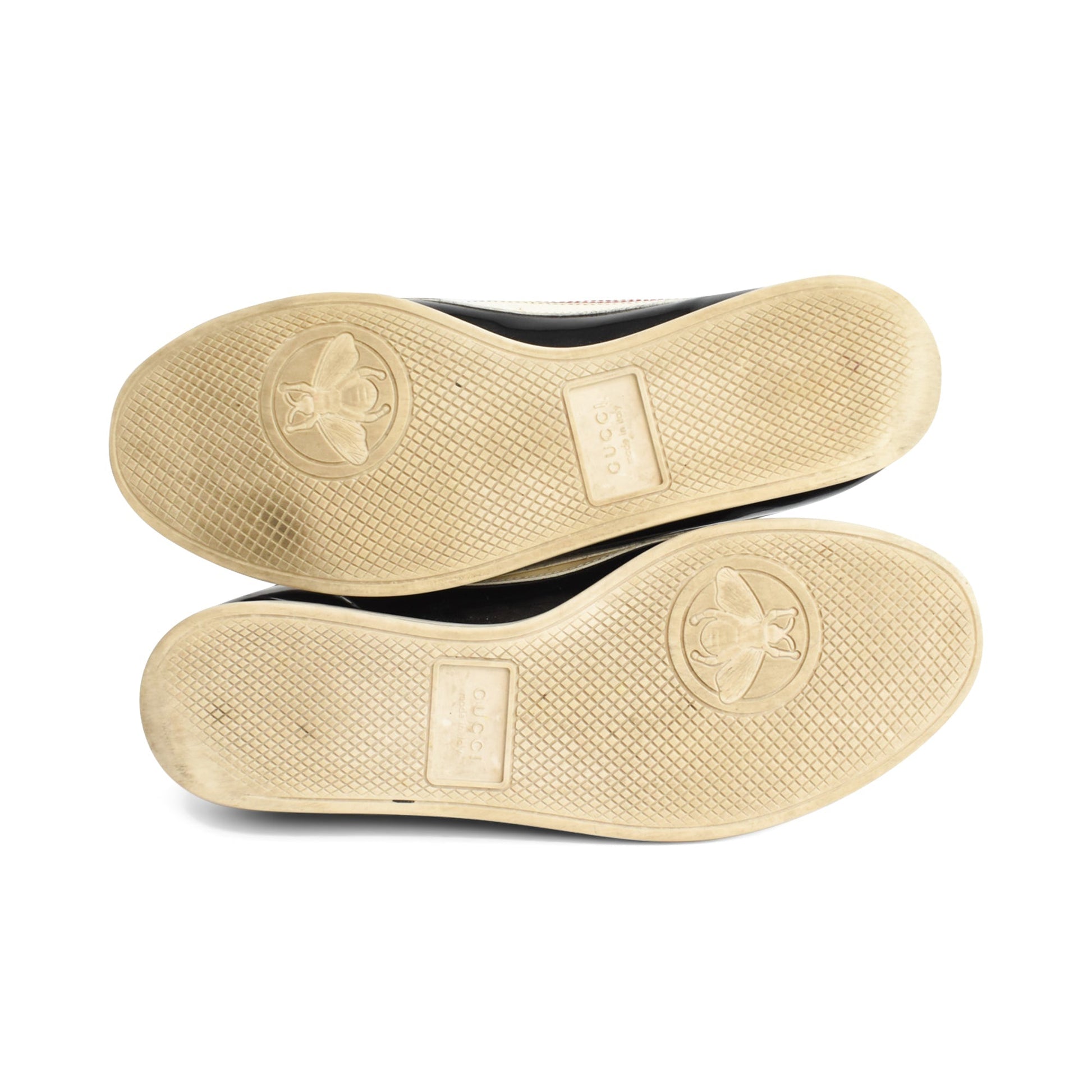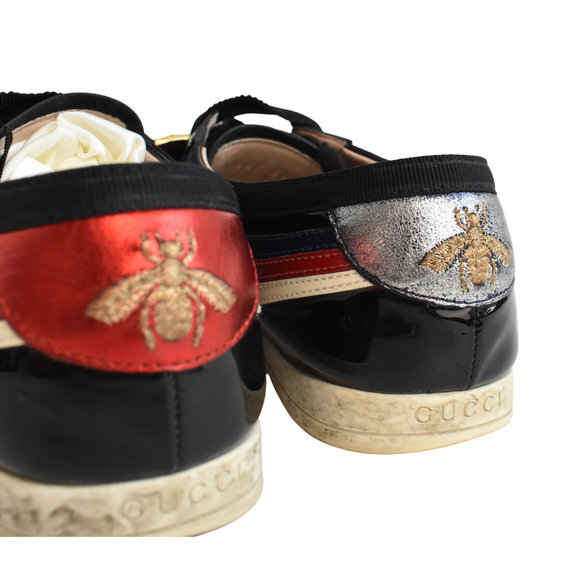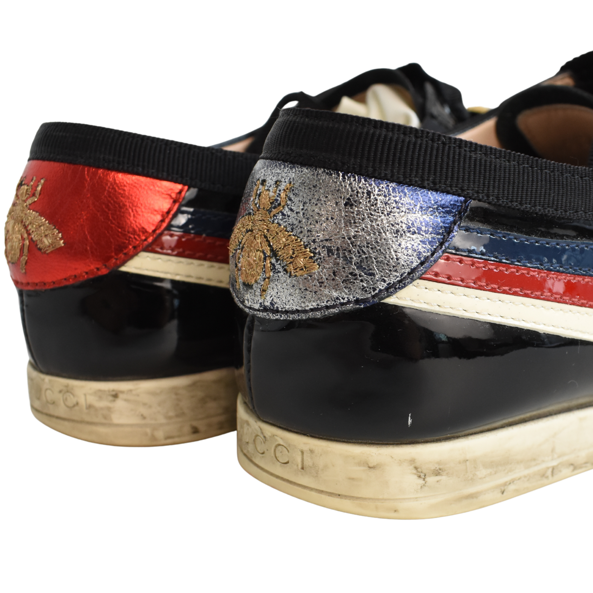 Gucci 'Falacar' low top sneakers in black patent leather with red, white, and navy swooping stripes and gold embroidered bees on the heels. Feature ribbon laces and oversized butterfly lace lock in aged gold and faux pearl.
