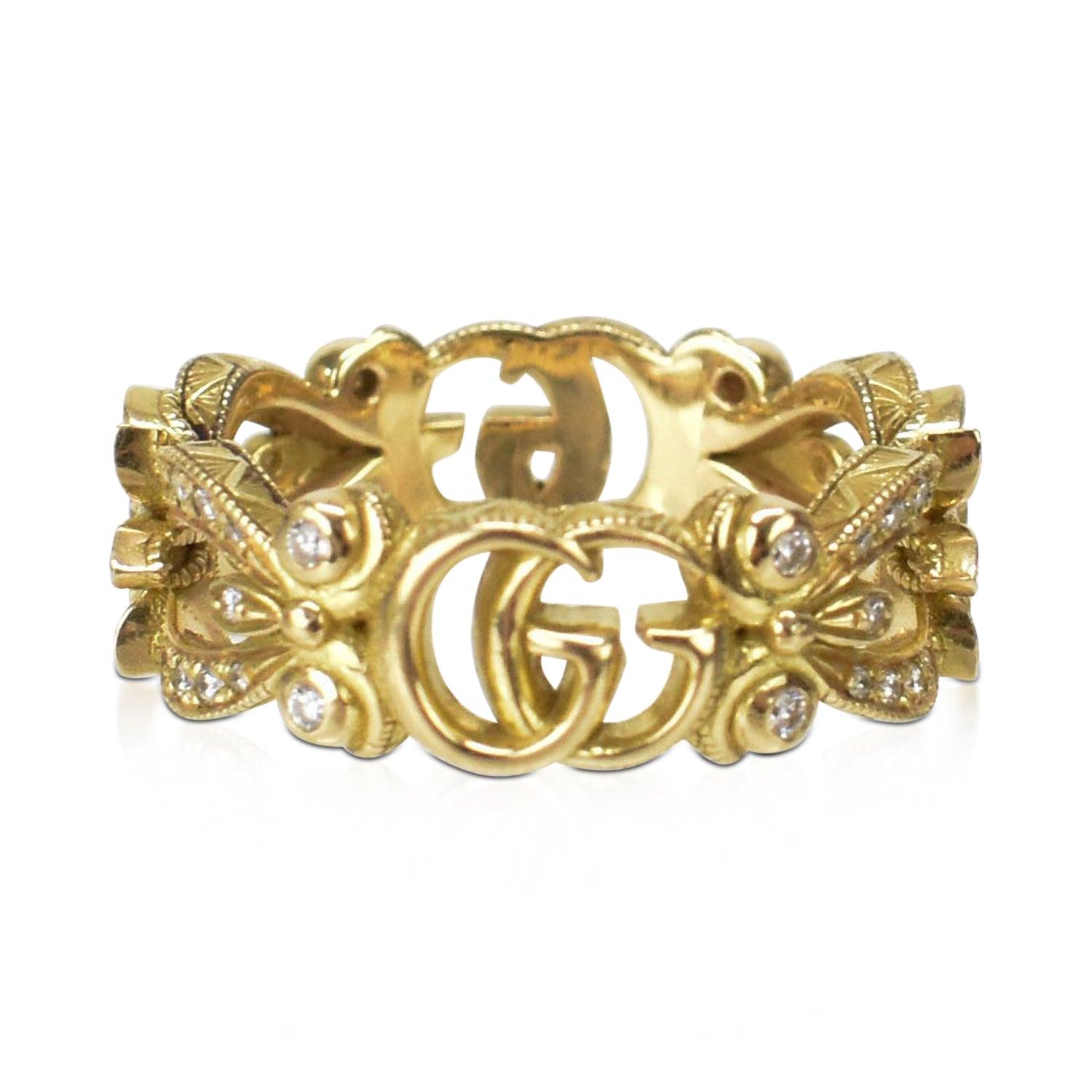 Gucci 'Flora' ring in 18k gold with pave white diamonds. Features double GG and flower detail.