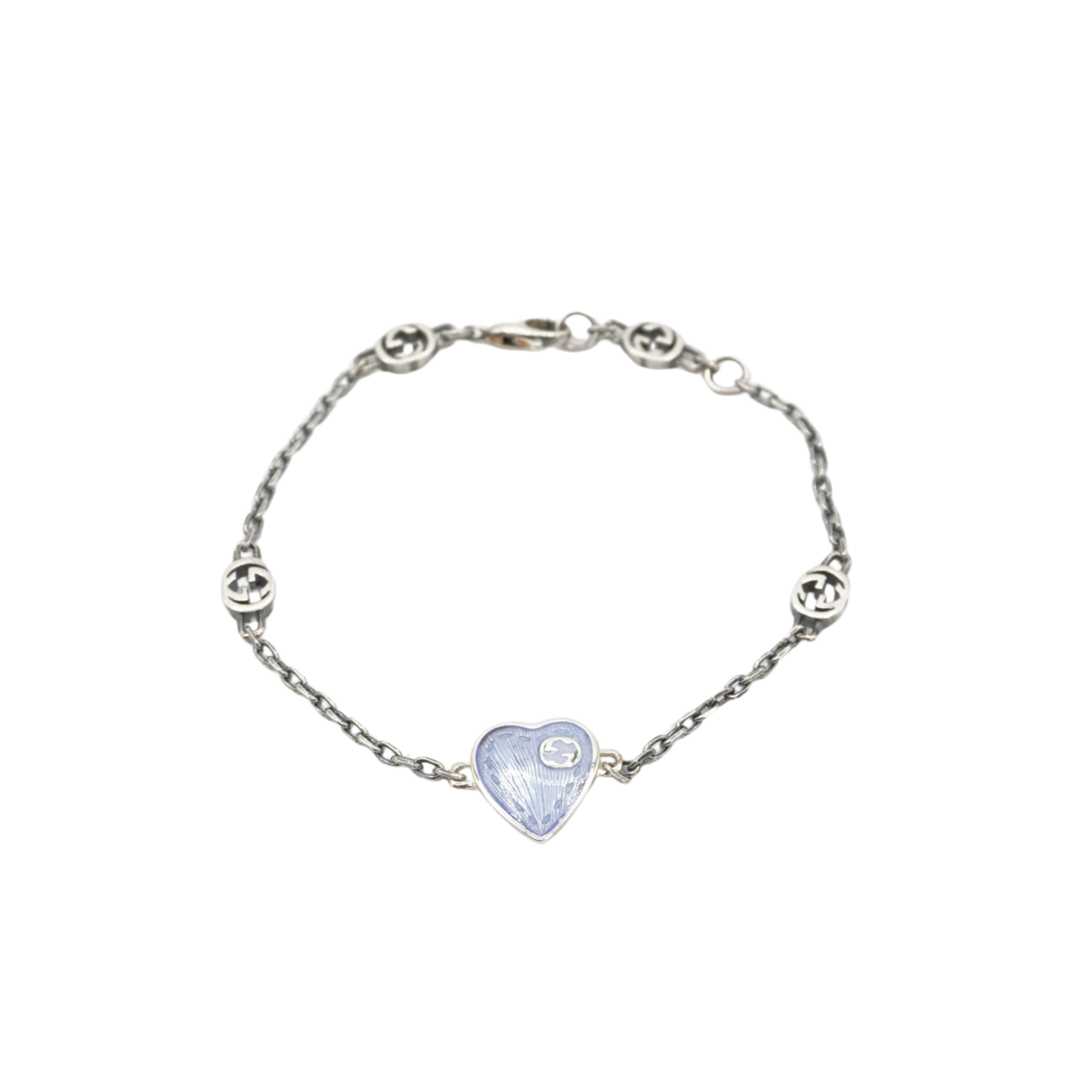 Gucci thin sterling silver bracelet with four interlocking GG logo links and a heart charm filled with light blue enamel.