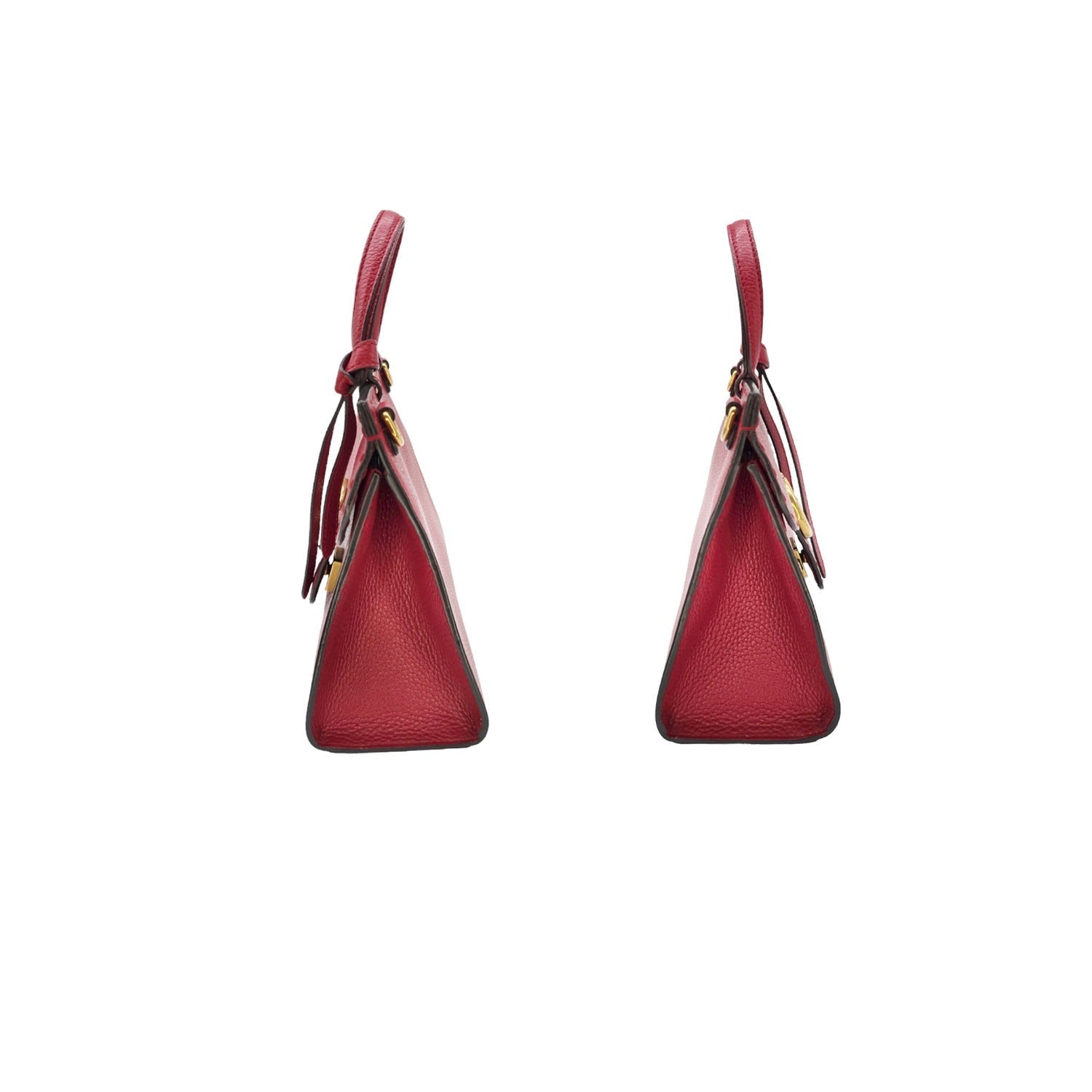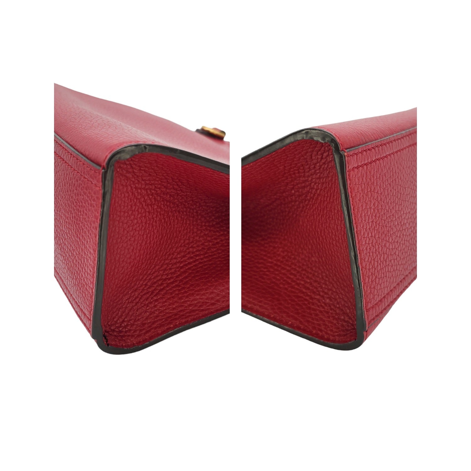 Carry elegance and sophistication with the Gucci GG Marmont Top Handle Bag. Crafted in red leather with antique gold-tone hardware, this bag features a spacious interior with one slip pocket for organization. The flap closure with push lock ensures the security of your items. Made in Italy, it comes with a from Entrupy. In very good condition, this bag will elevate your style with a touch of luxury.