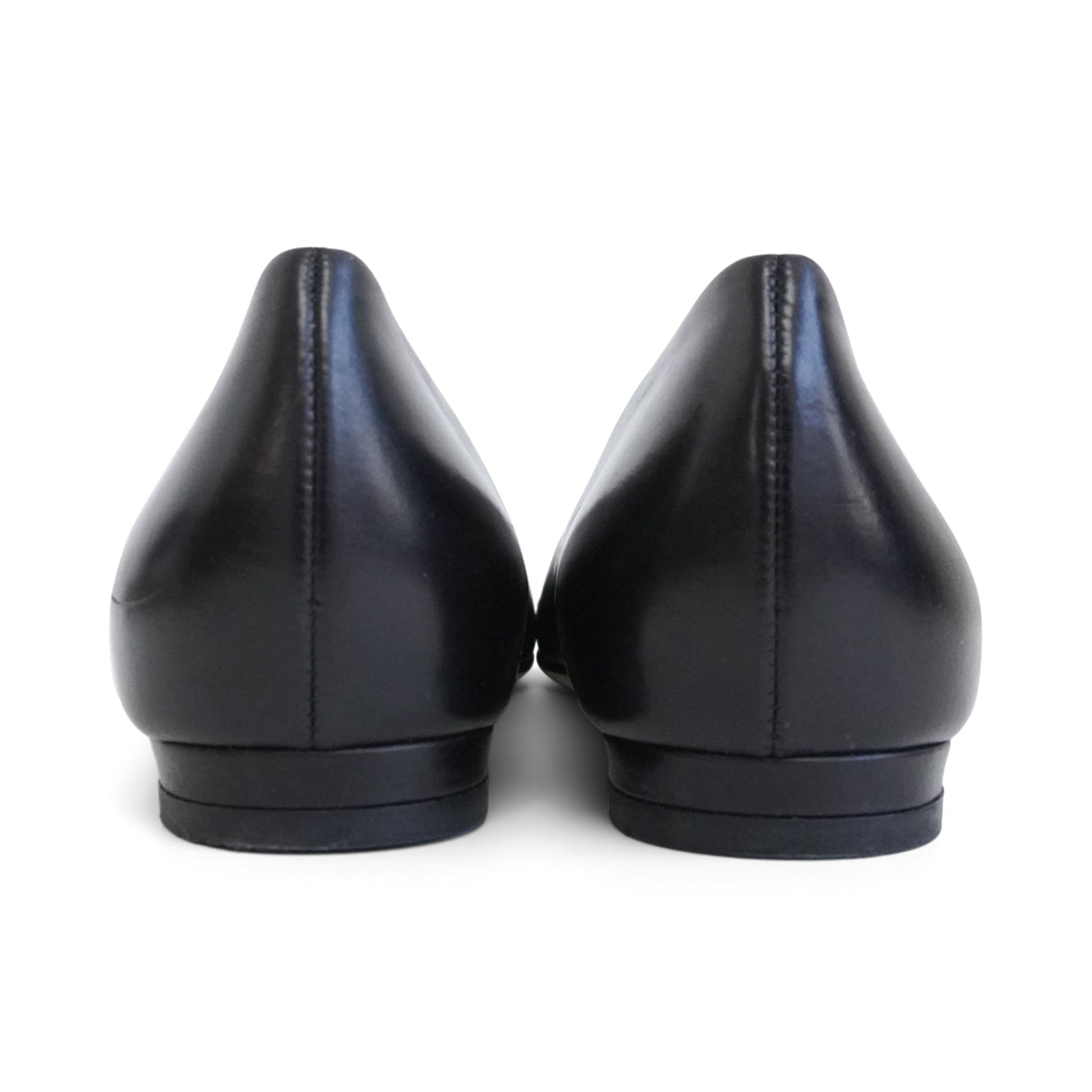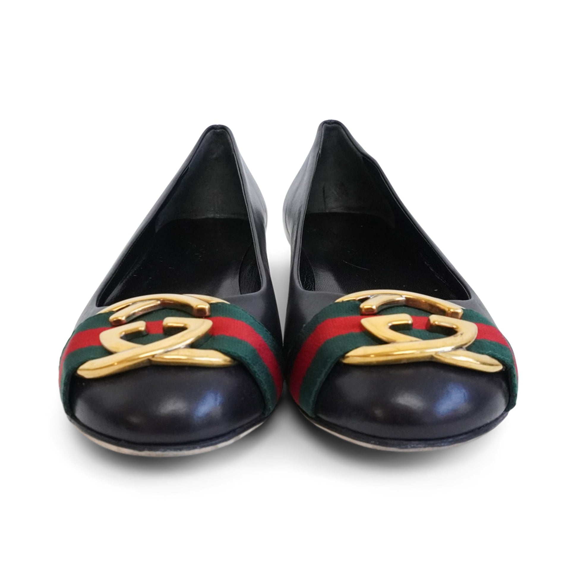 Gucci smooth black leather flats with aged gold interlocking 'GG' hardware and red-green racing stripe webbing.