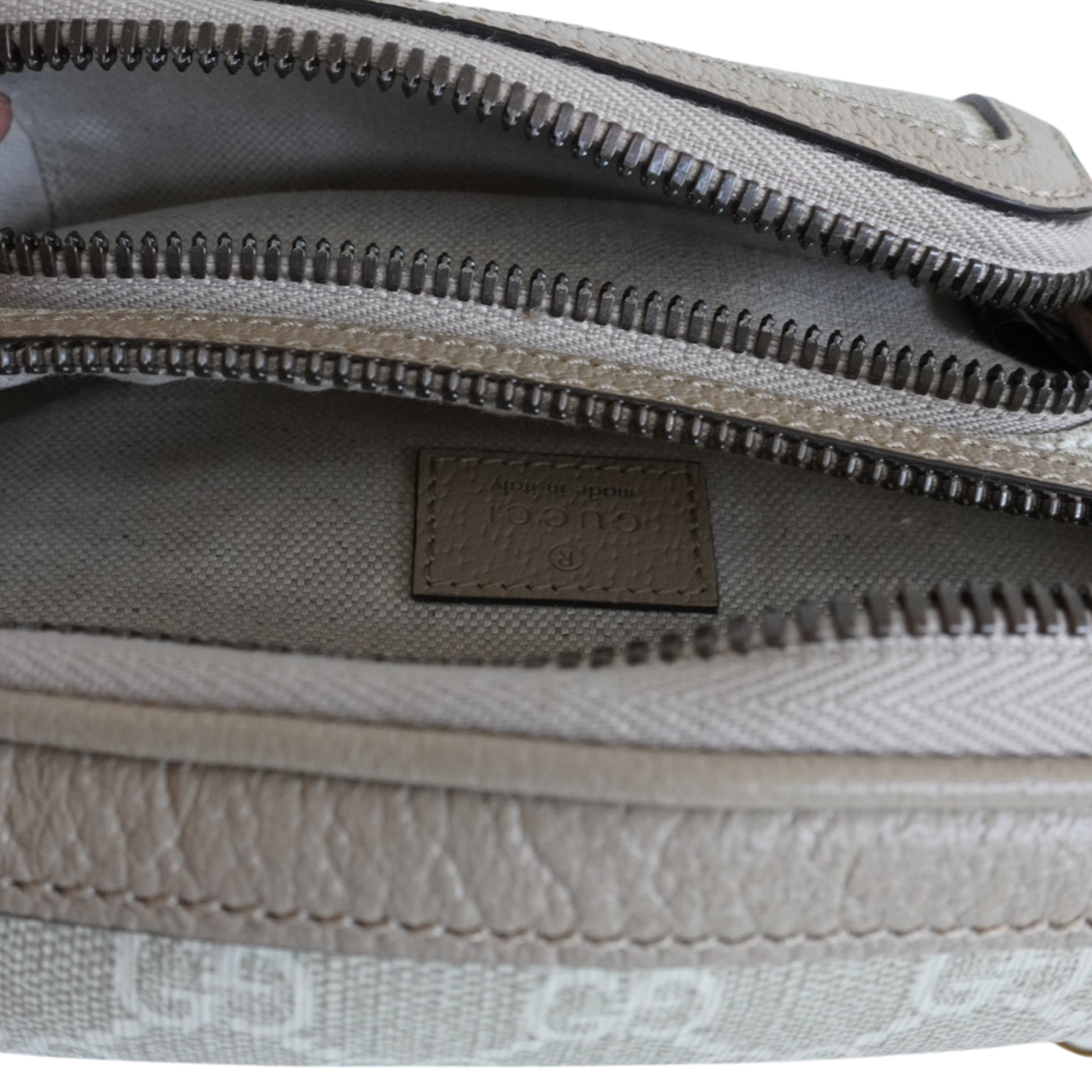Gucci 'GG Supreme' belt bag in cream and beige monogram coated canvas with beige leather accents and aged gold hardware. Features two front zip pockets and a back zip pocket with cream canvas lining. Can be worn around the waist or crossbody with the adjustable red-green racing stripe belt.