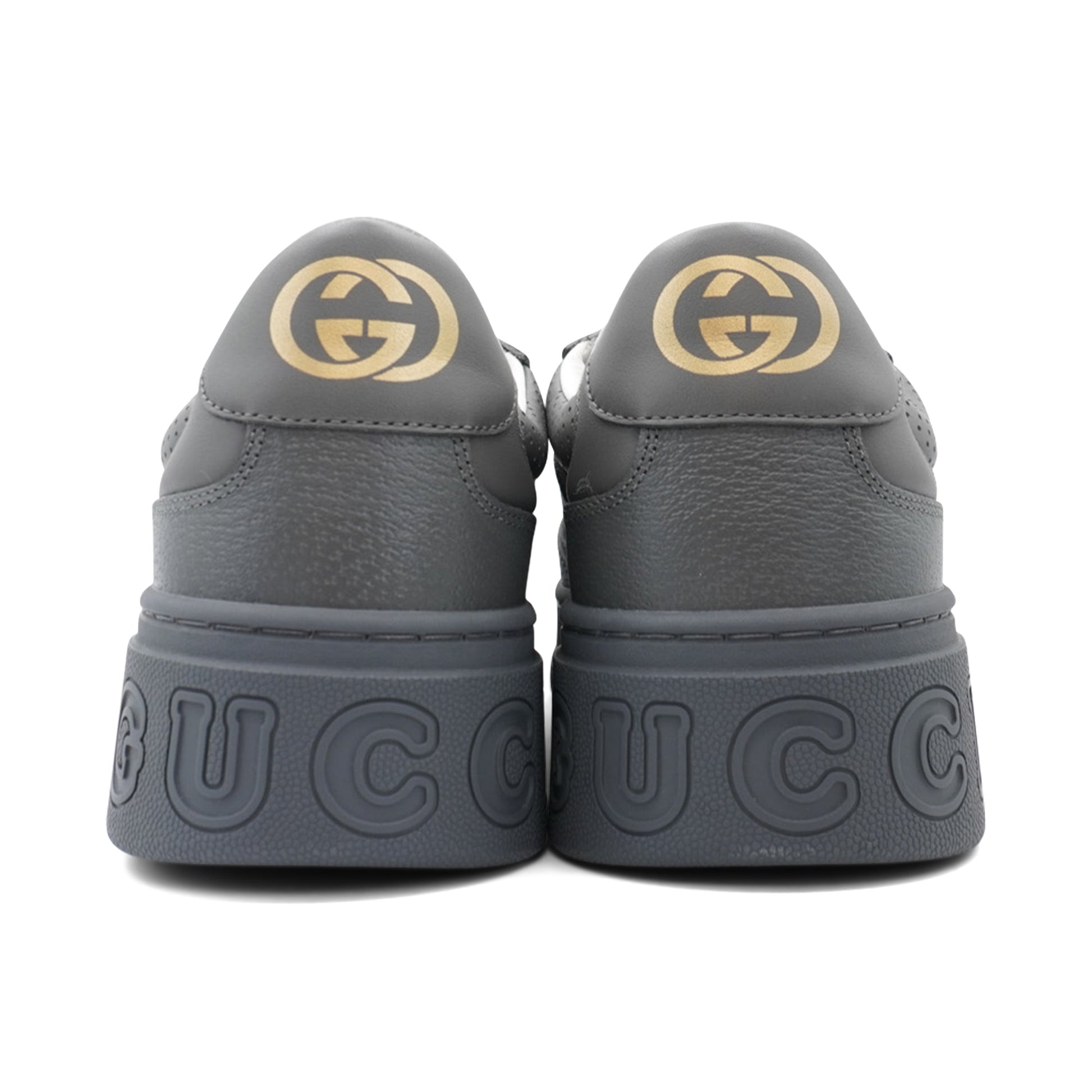 Gucci 'GG Supreme' low-top sneakers in grey monogram coated canvas with grey leather trim, tonal laces, a gold foil logo on the back heel, and a thick rubber sole.