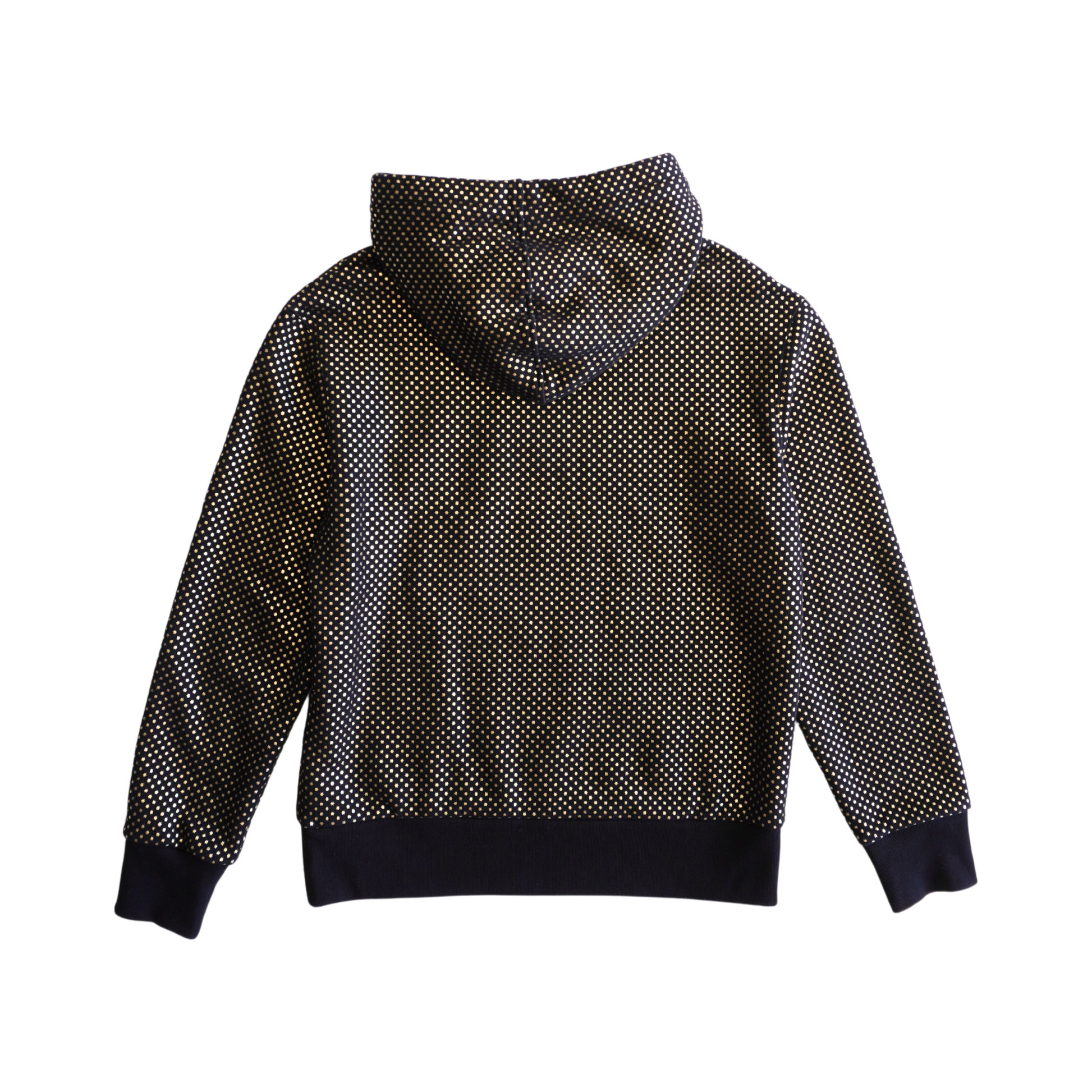 Gucci hoodie in black cotton with all-over metallic gold foil stars, a vintage 'GUCCY' logo across the chest, and a drawstring hood.