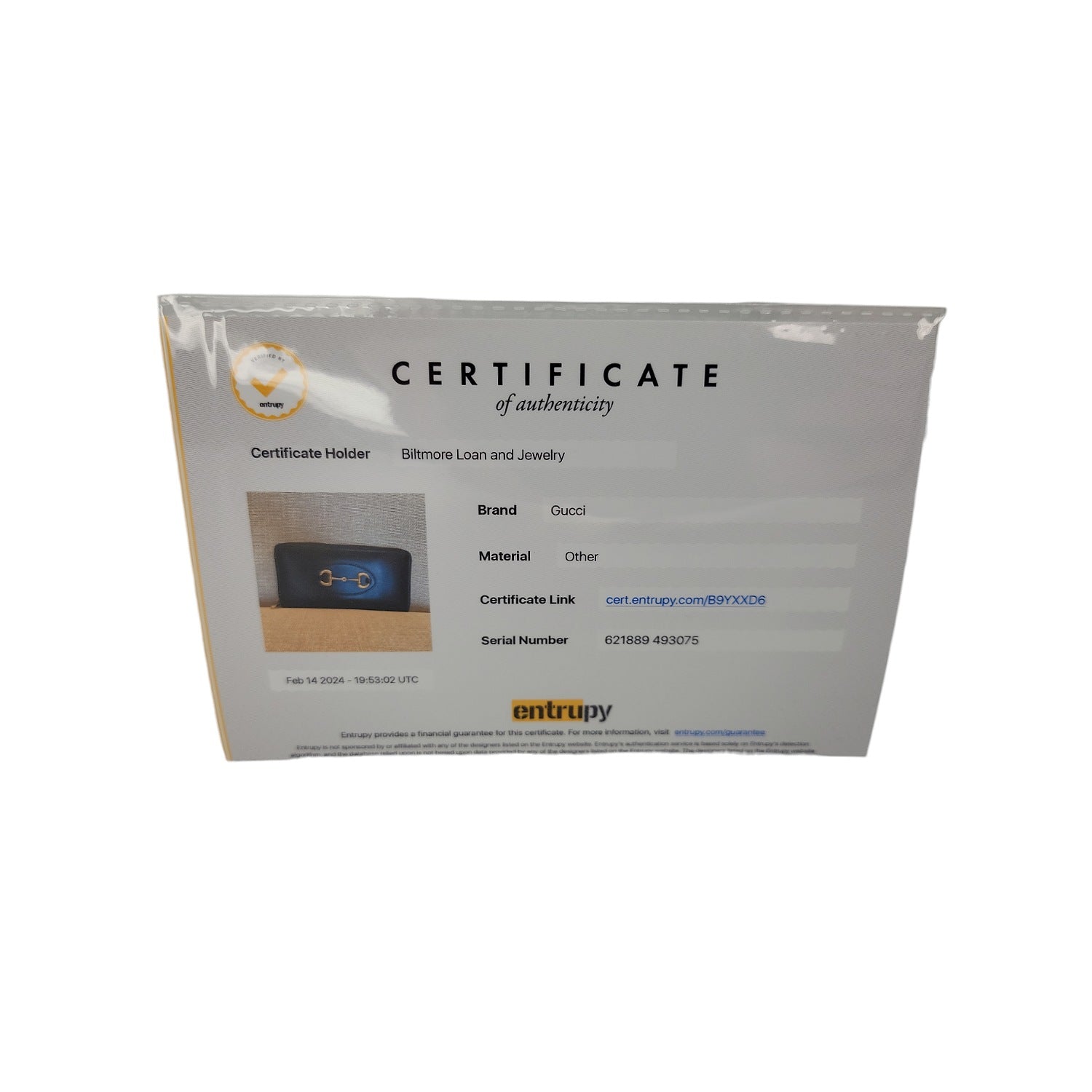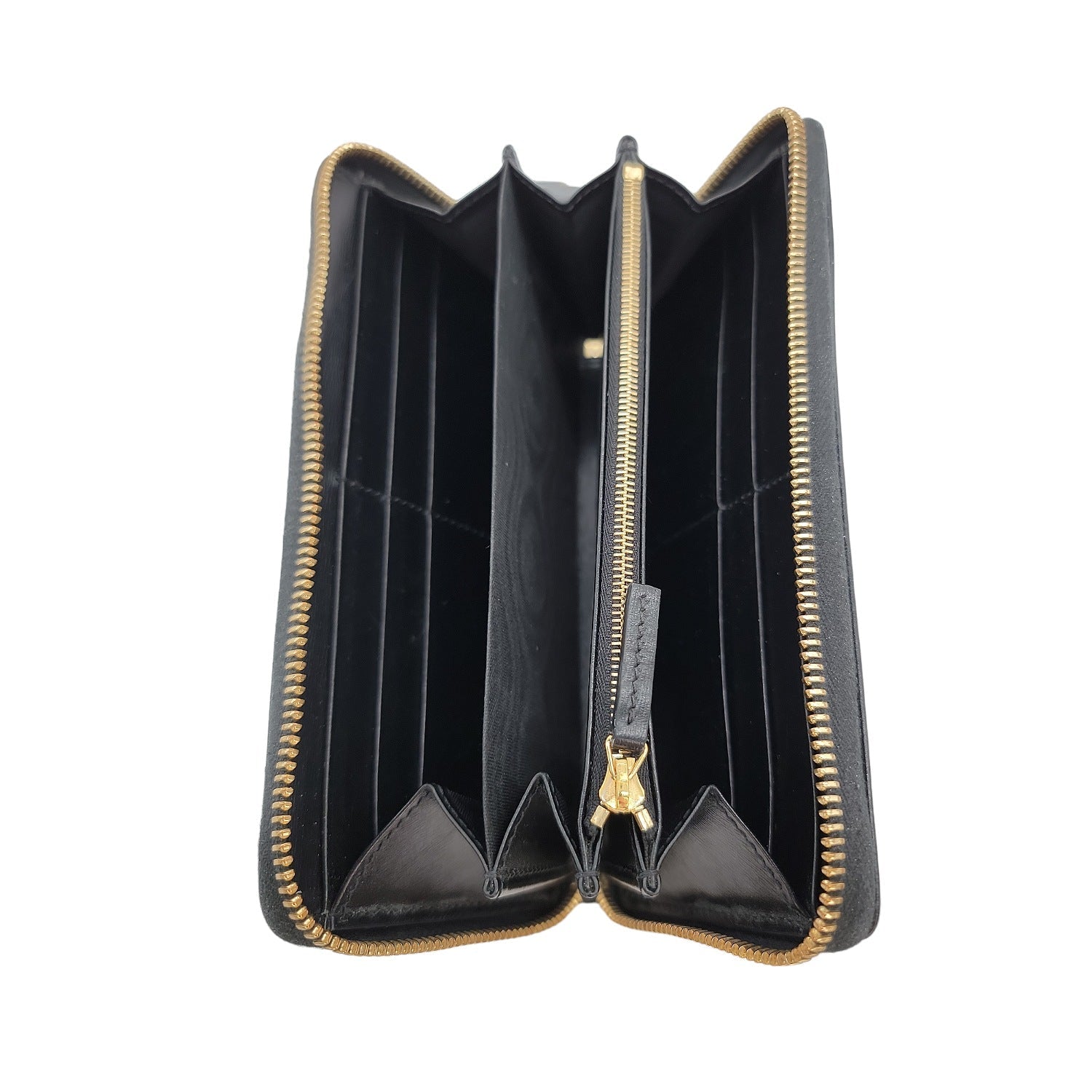 This stylish wallet is crafted of smooth leather in black with a 3/4 wrap around zipper that opens to a leather and fabric interior with plenty card slots, compartments, and pockets. The horsebit design is an iconic detail that is part of Gucci's signature look and is one of the most distinctive and recognizable elements in their design.