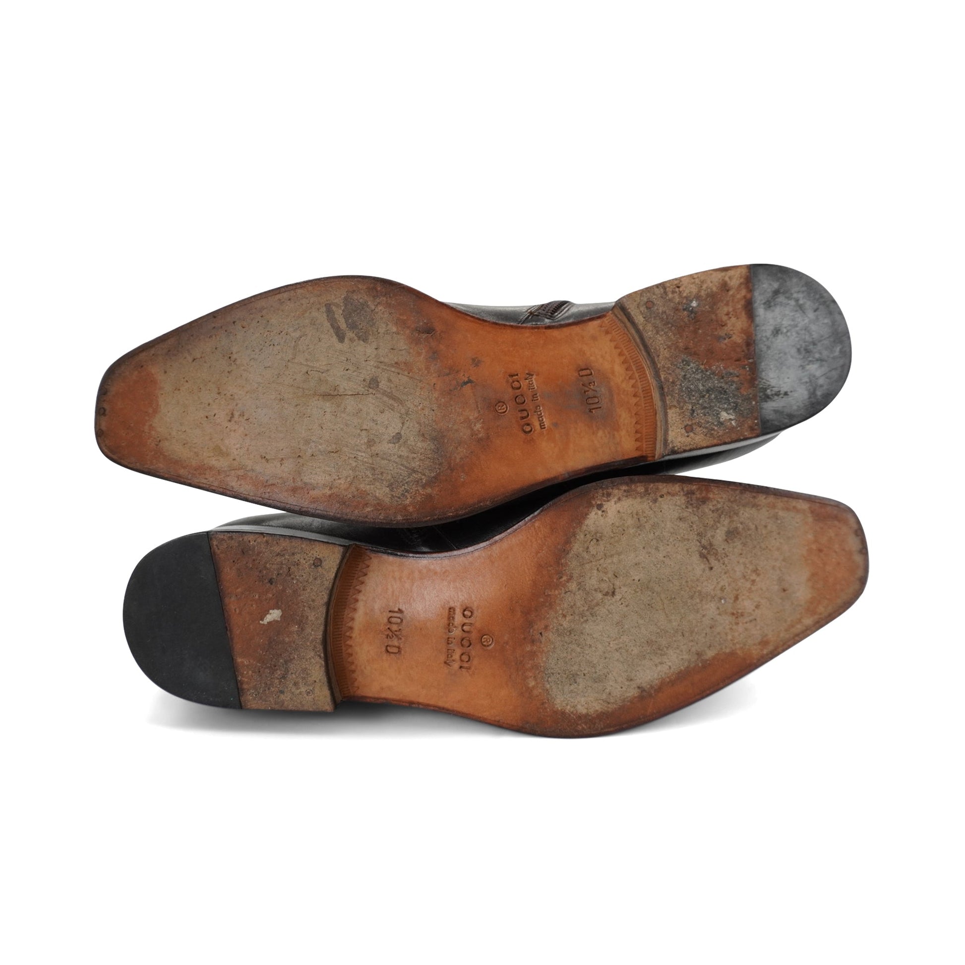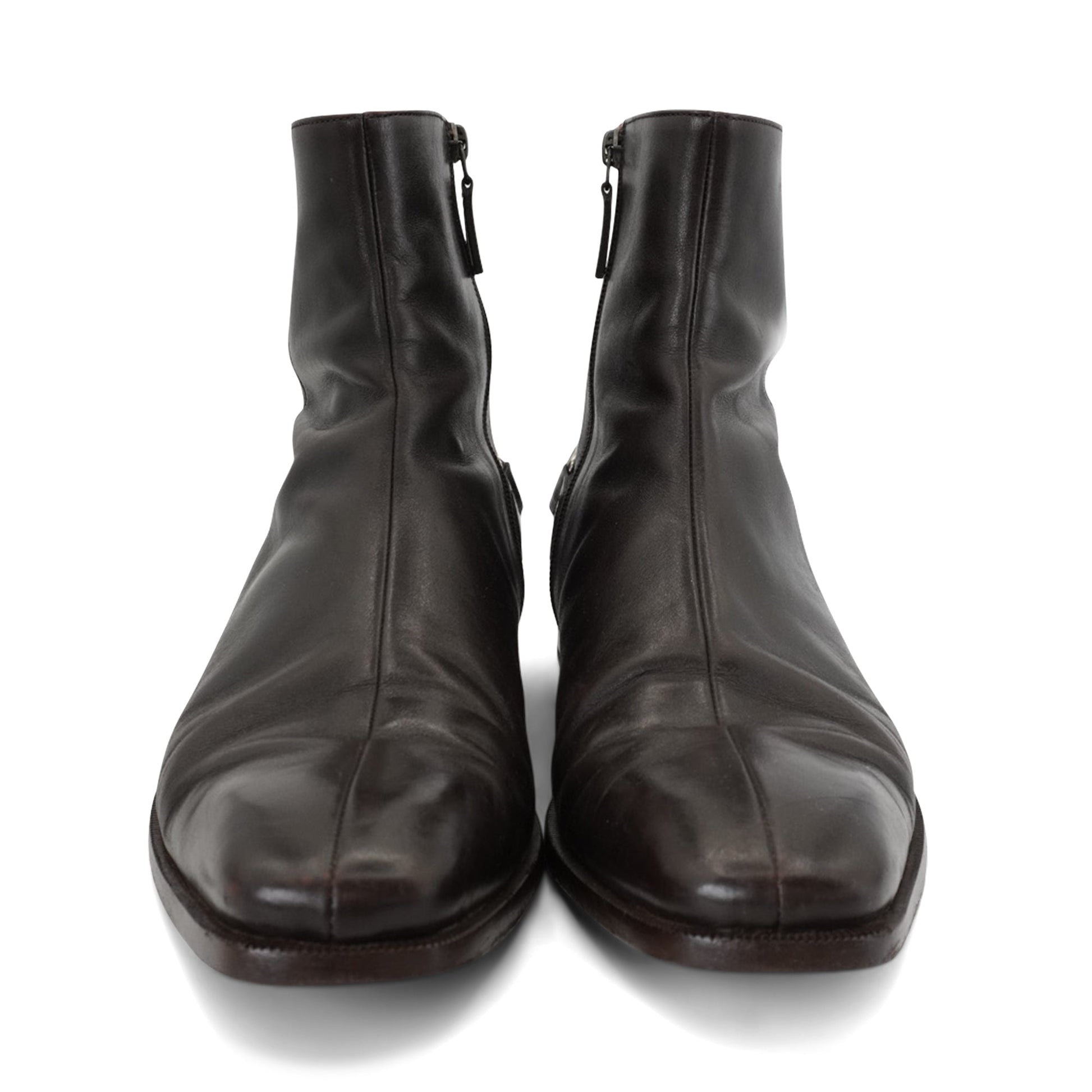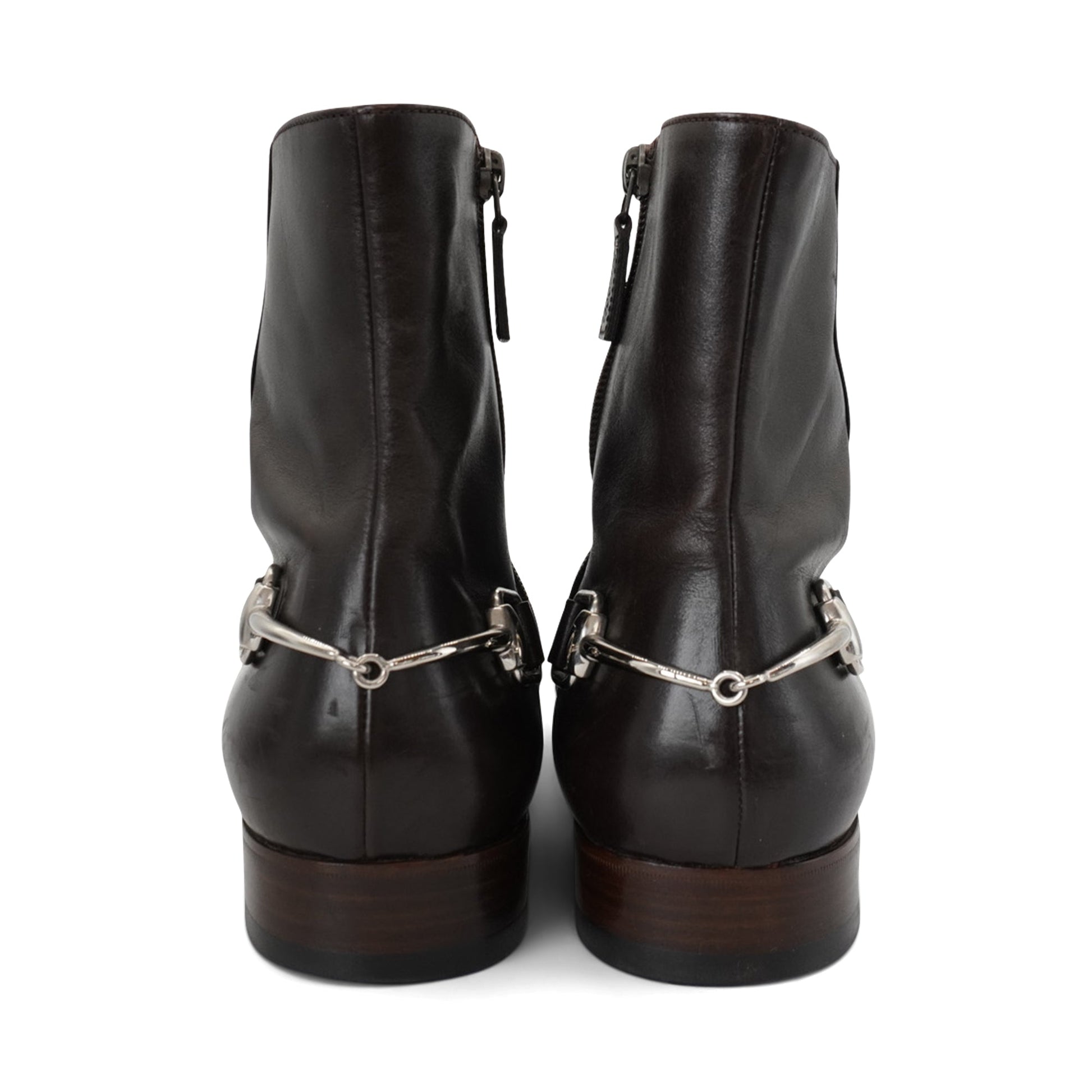 Gucci ankle boots in dark brown leather with elongated toe box and silver horsebit hardware at the ankle.