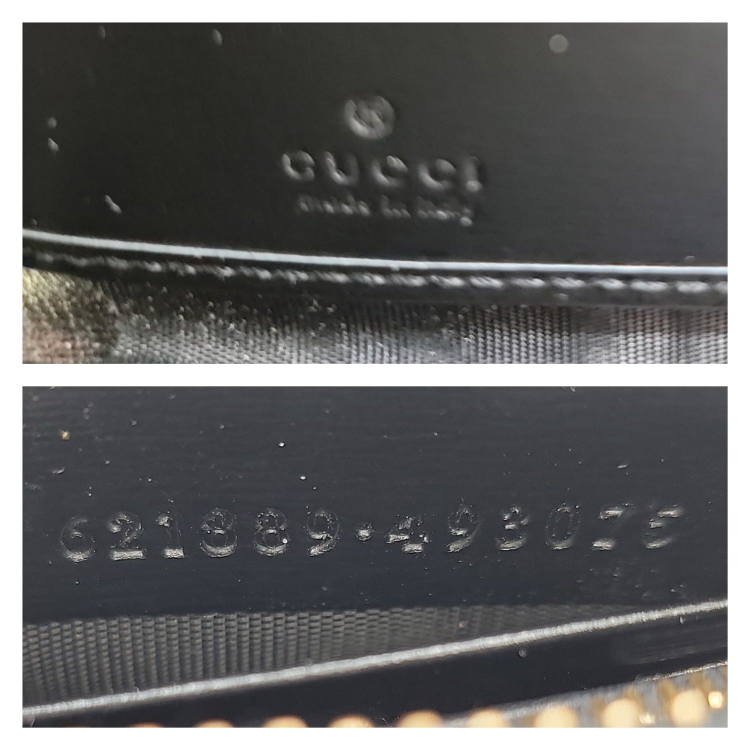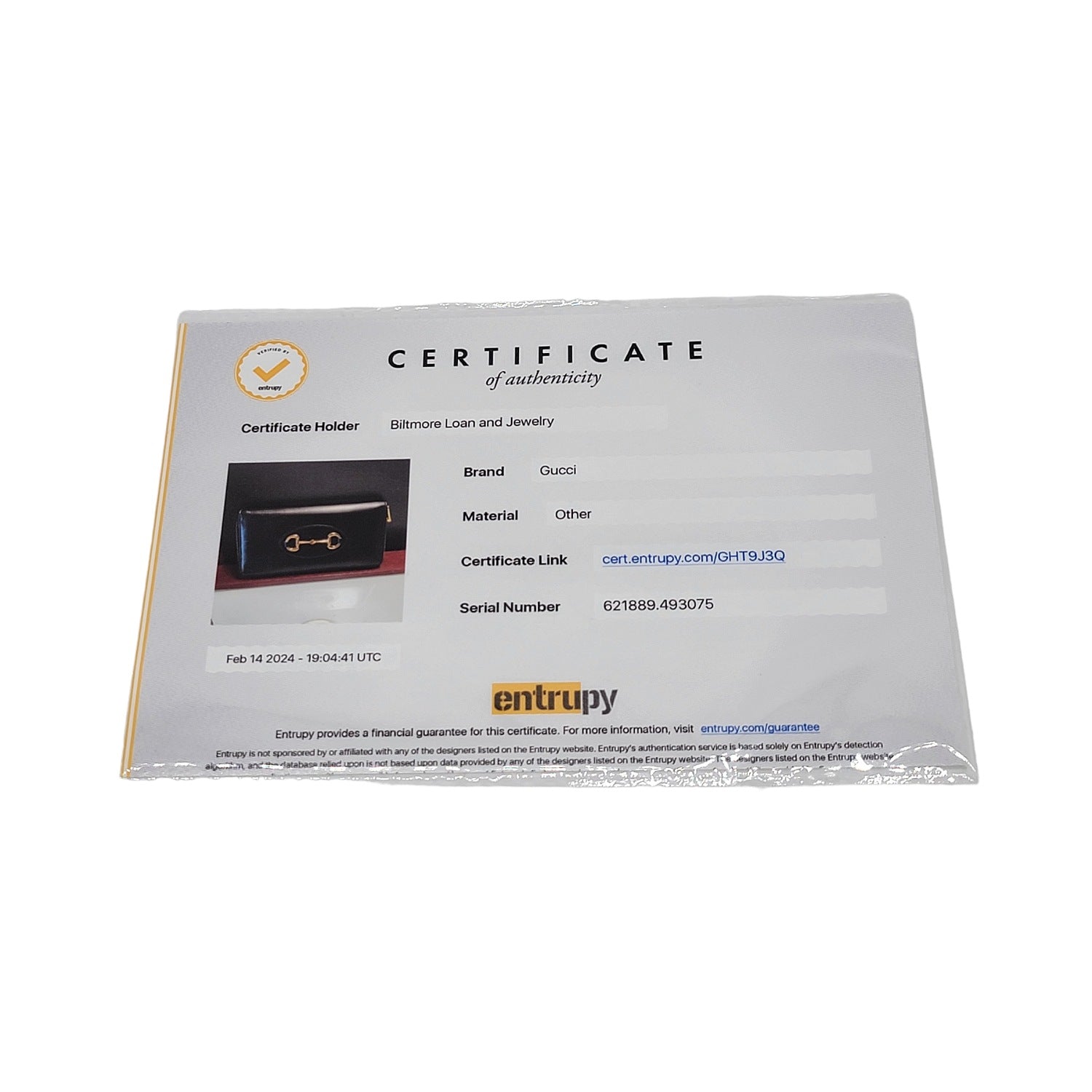 This stylish wallet is crafted of smooth leather in black with a 3/4 wrap around zipper that opens to a leather and fabric interior with card slots, a central zipper compartment, and patch pockets. The horsebit design is an iconic detail that is part of Gucci's signature look and is one of the most distinctive and recognizable elements in their design. Comes with an Entrupy .